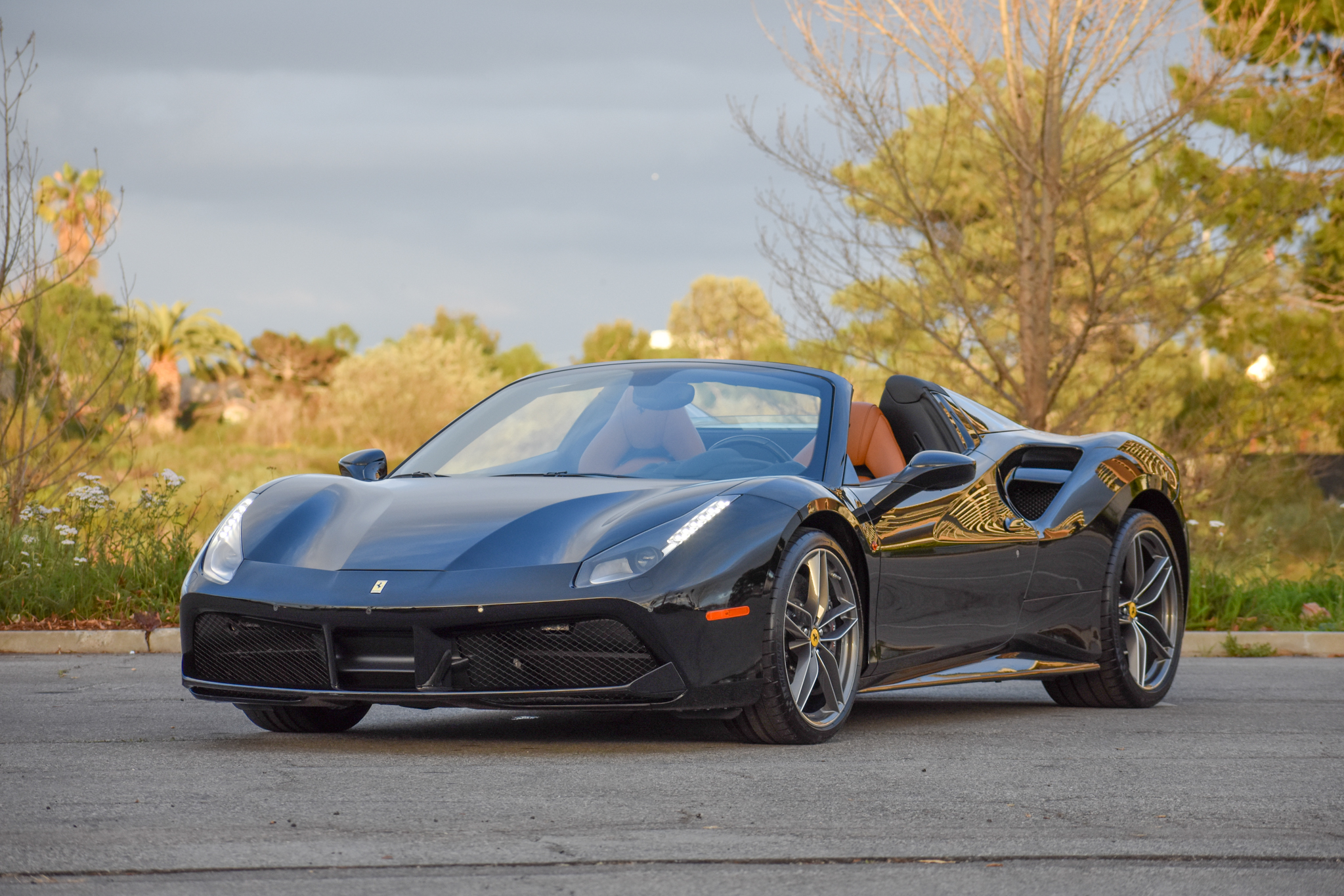 Optional dark-finished 20″ forged diamond wheels are mounted with 245/35 front 305/30 rear Michelin Pilot Super Sport tires. Ferrari-branded Brembo calipers are fitted over carbon-ceramic rotors, and the car is equipped with adjustable magnetorheological dampers, a suspension lifter, and a sport exhaust system.