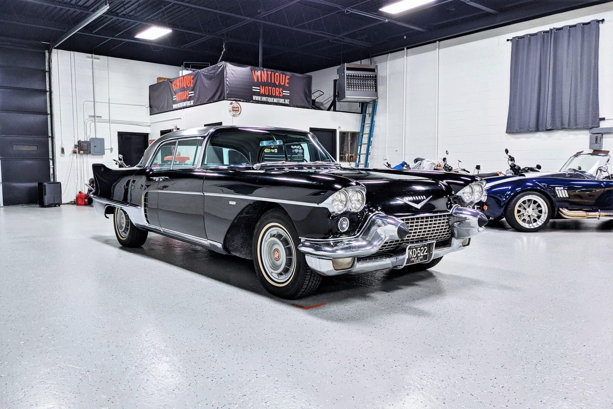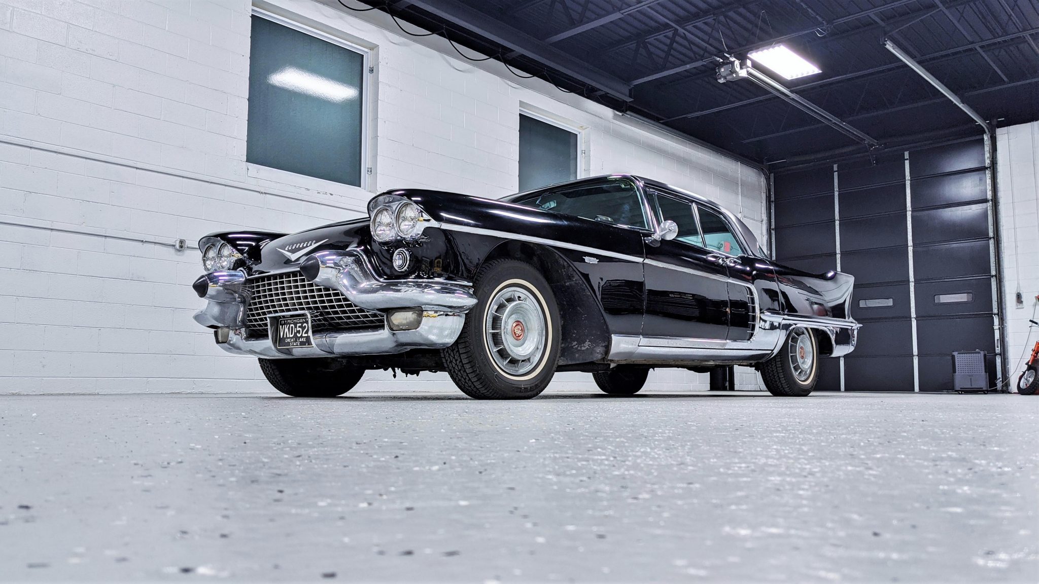 Forged-aluminum 15″ wheels are mounted with Kelly whitewall tires. The factory air suspension has been removed in favor of a coil- and leaf-spring setup, and braking is managed by four-wheel power-assisted drums.