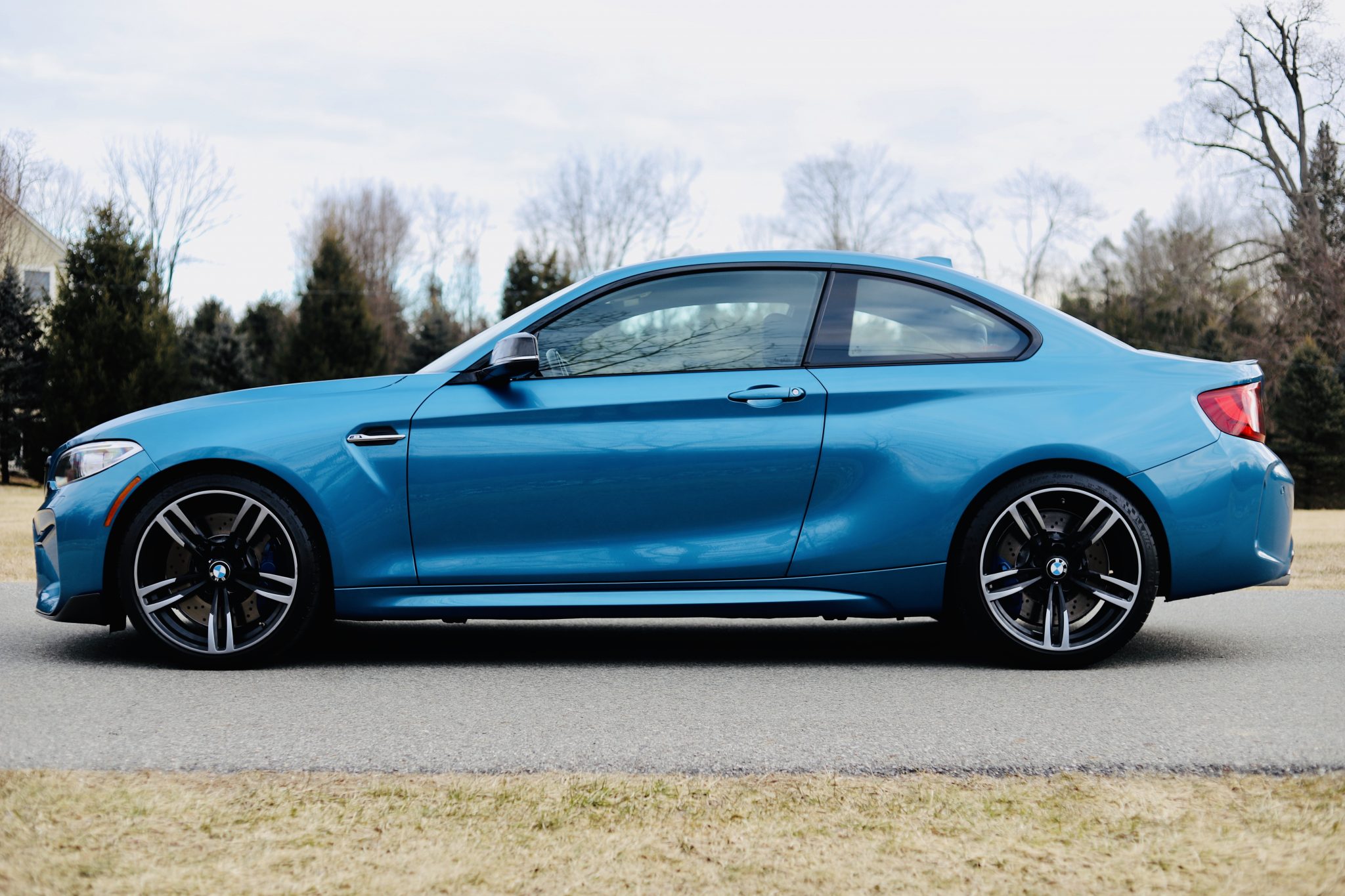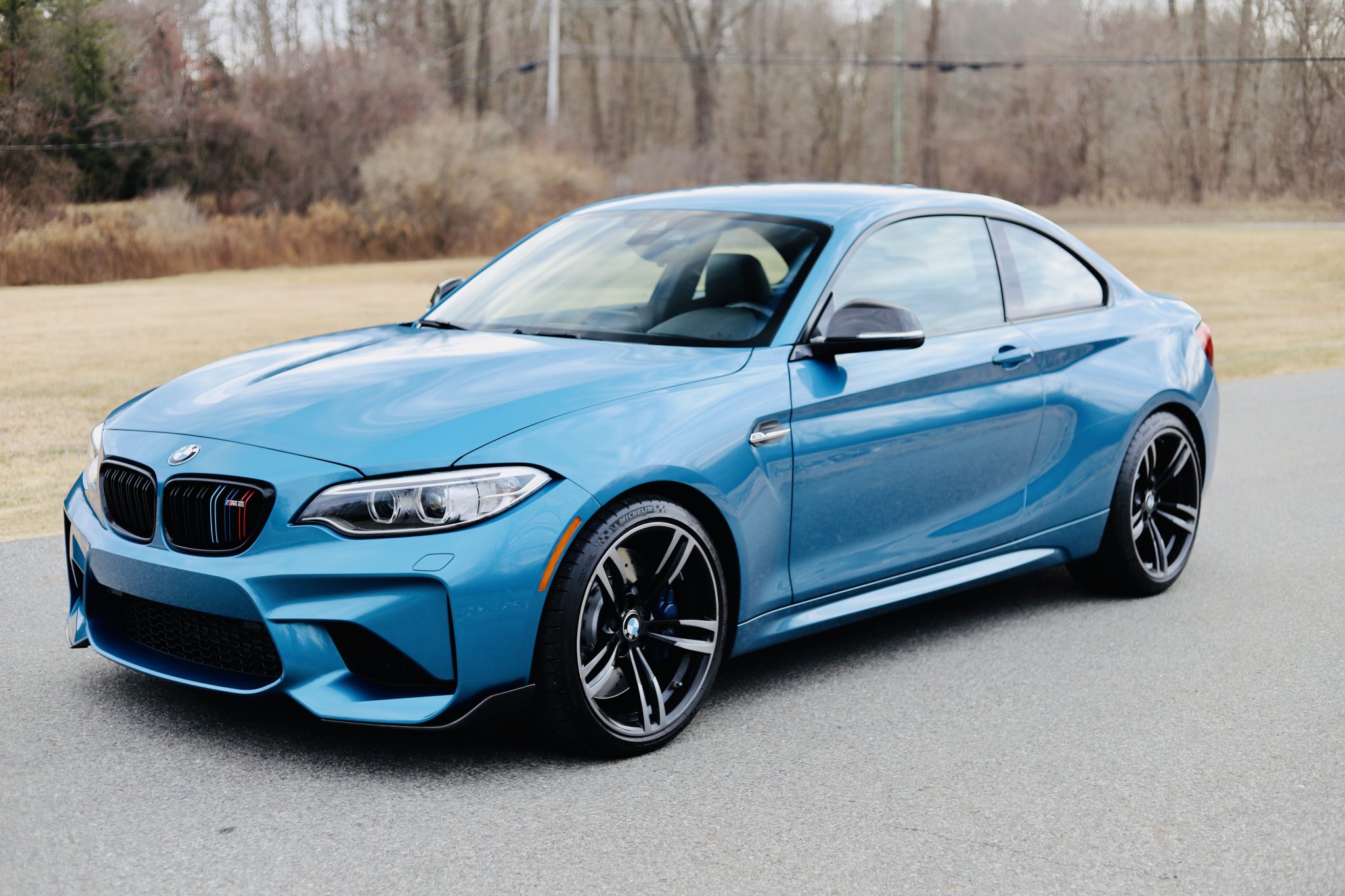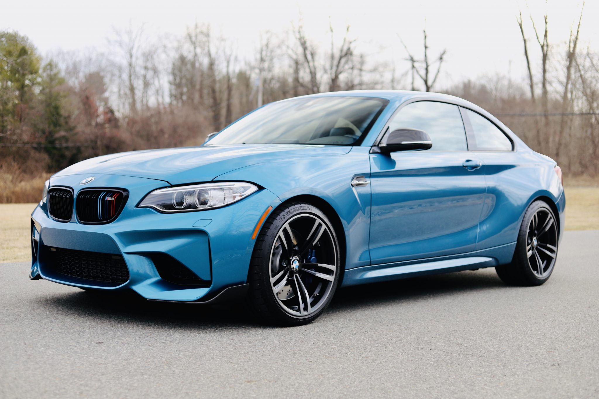 Factory 19″ style 437M wheels are wrapped in 245/35 front and 265/35 rear Michelin Pilot Super Sport tires that show date codes from 2019 and 2020. Braking is provided by blue-painted brake calipers and cross-drilled rotors at all four corners.