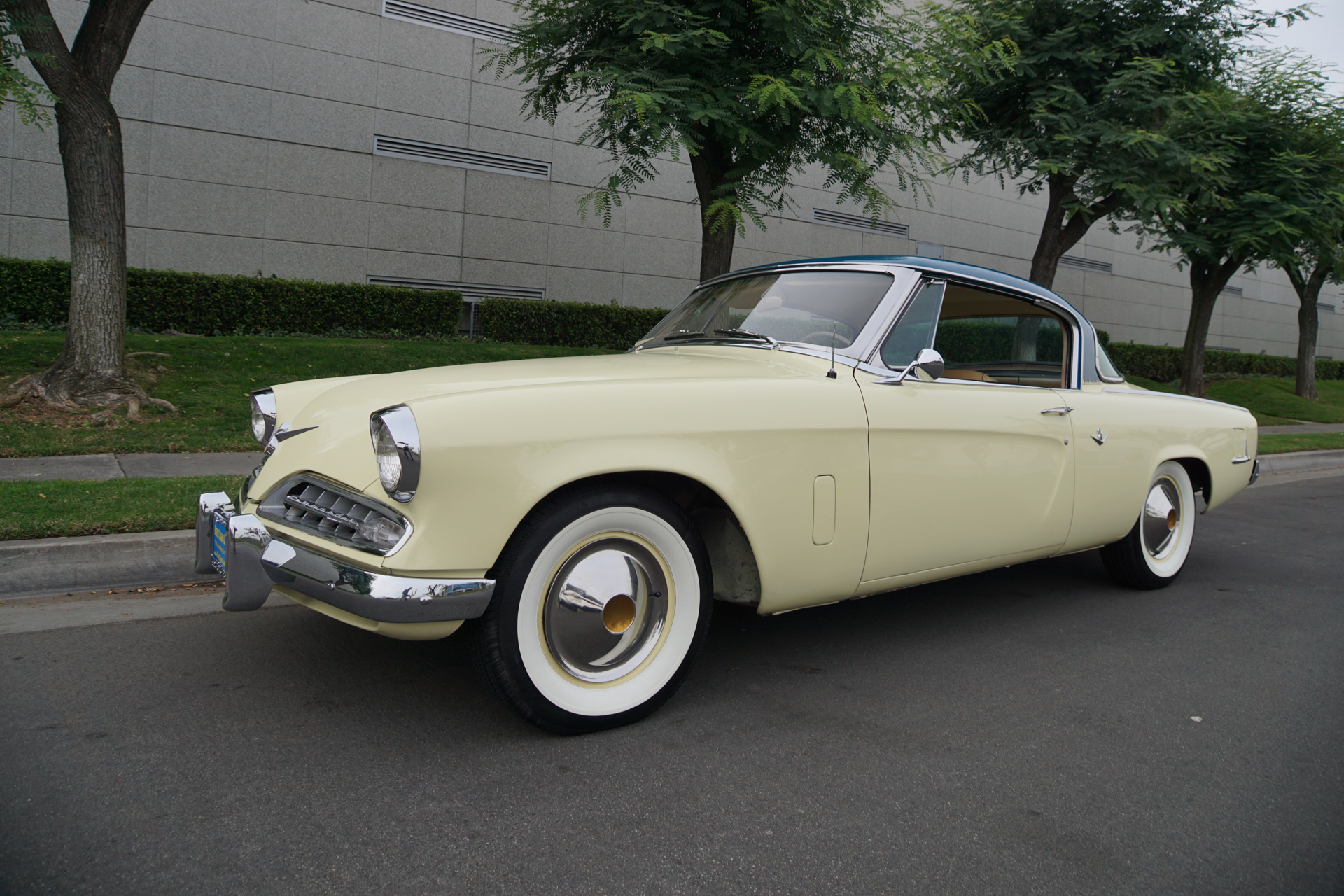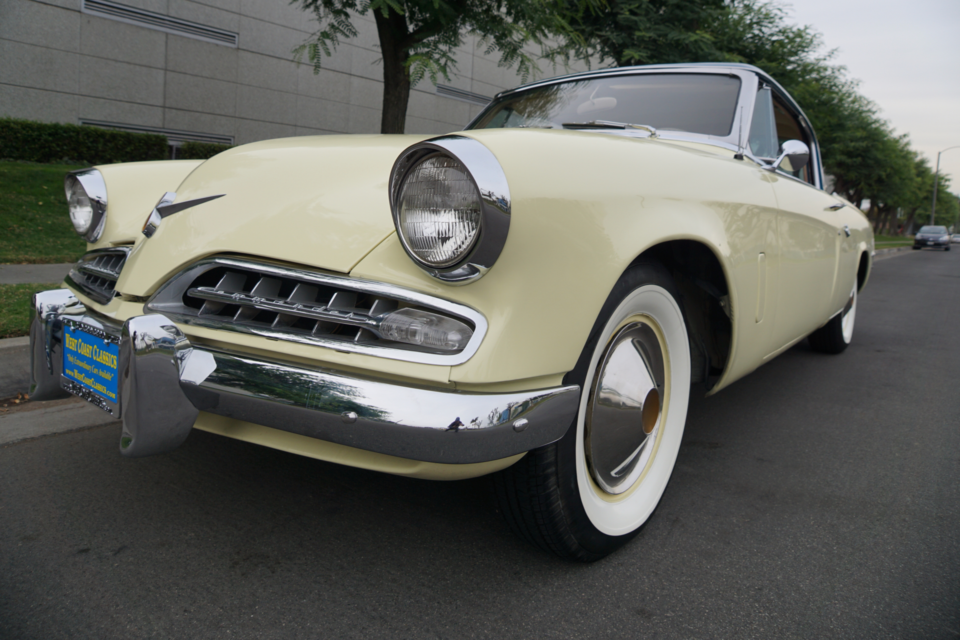 Body-matching steel wheels feature chrome covers and are mounted with wide whitewall tires.