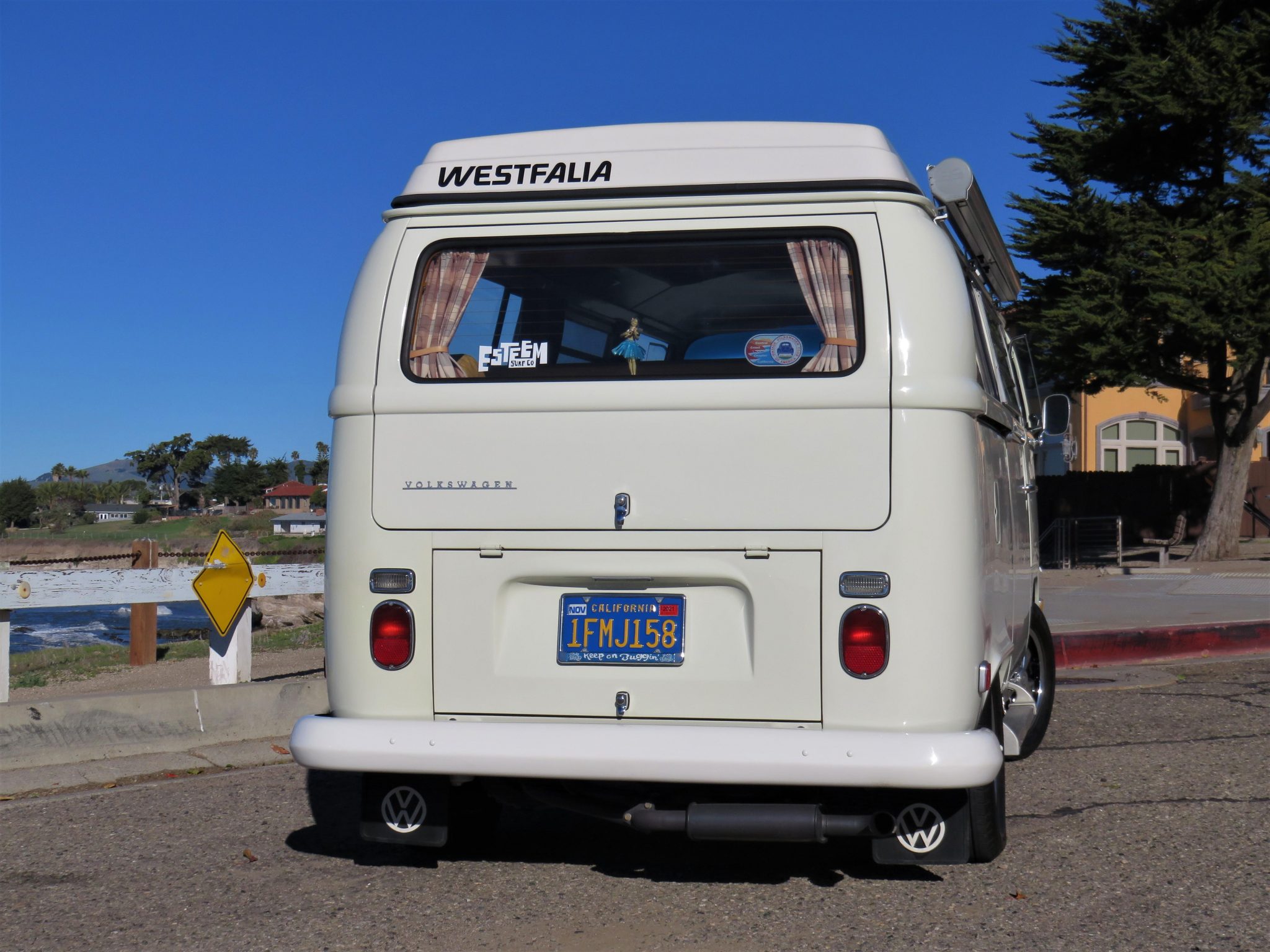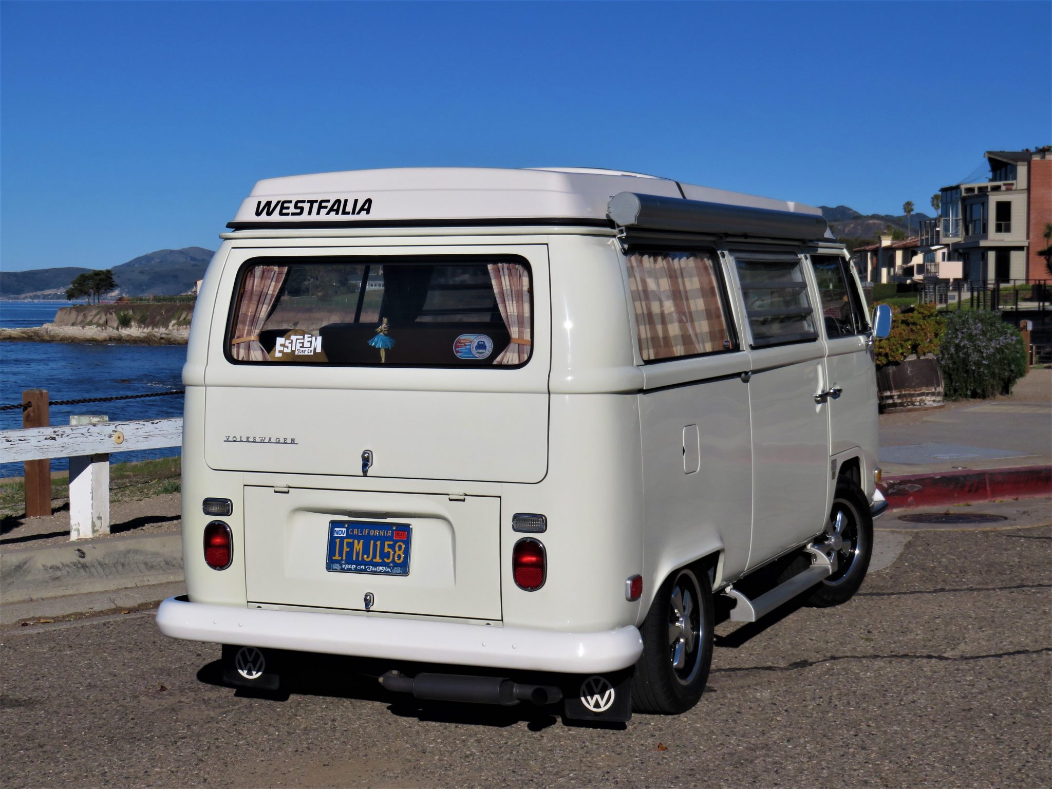 Porsche-sourced 15″ Fuchs wheels are wrapped in 205/65 Michelin Primacy MXV4 tires. The seller states that chassis refurbishment work included replacement ball joints, tie rod ends, and spring plate bushings. Modifications include drilled and ventilated front disc brakes, Old Speed drop spindles, front and rear anti-sway bars, and KYB shocks with front coilover assist springs.