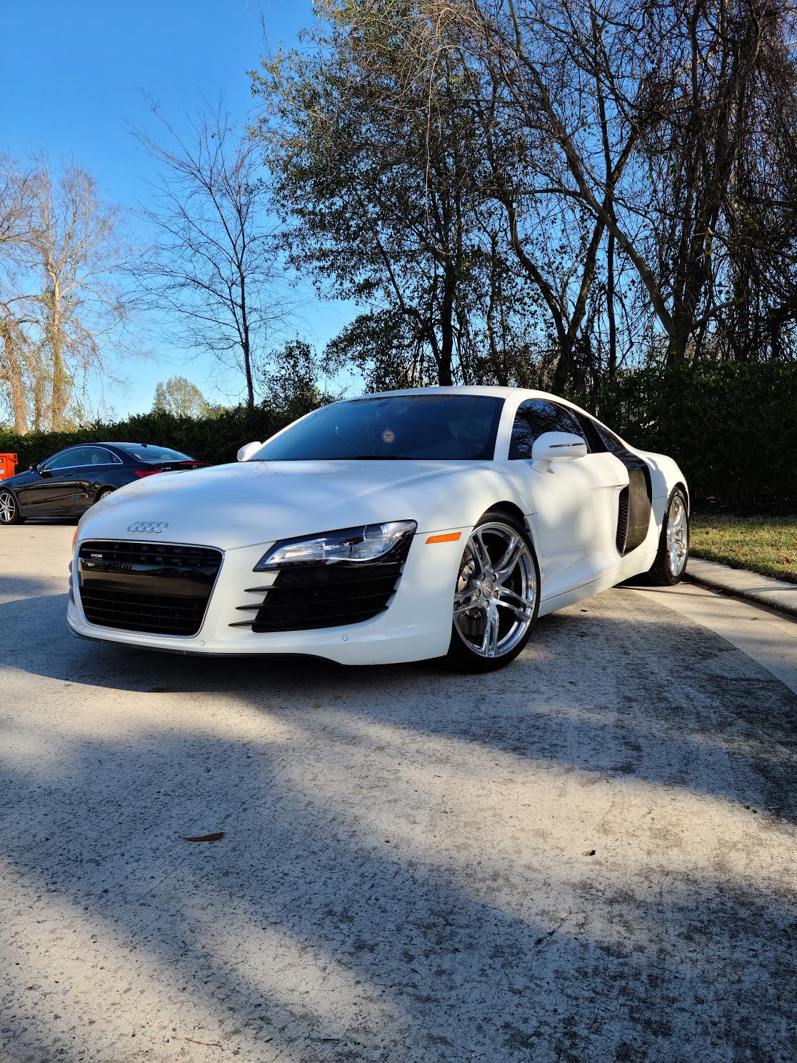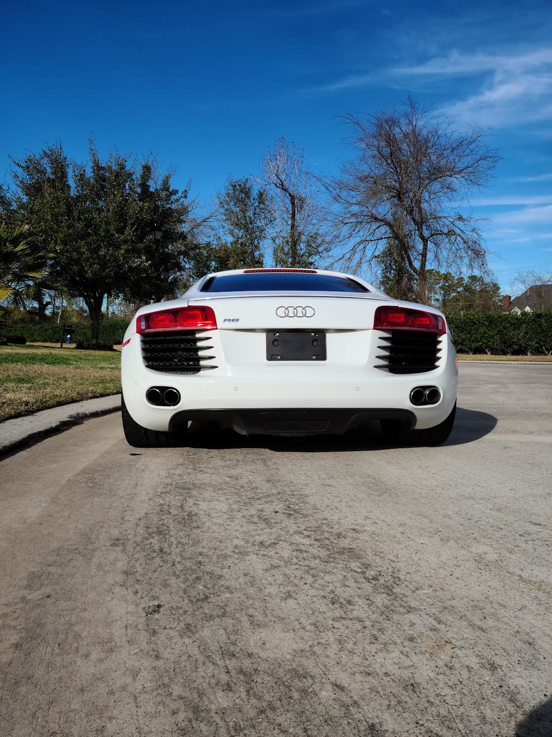 Staggered-width 19″ five-spoke wheels are polished and wear Pirelli P Zero tires measuring 235/35 up front and 295/30 out back. Braking is provided by R8-branded black calipers with cross-drilled rotors at each corner.