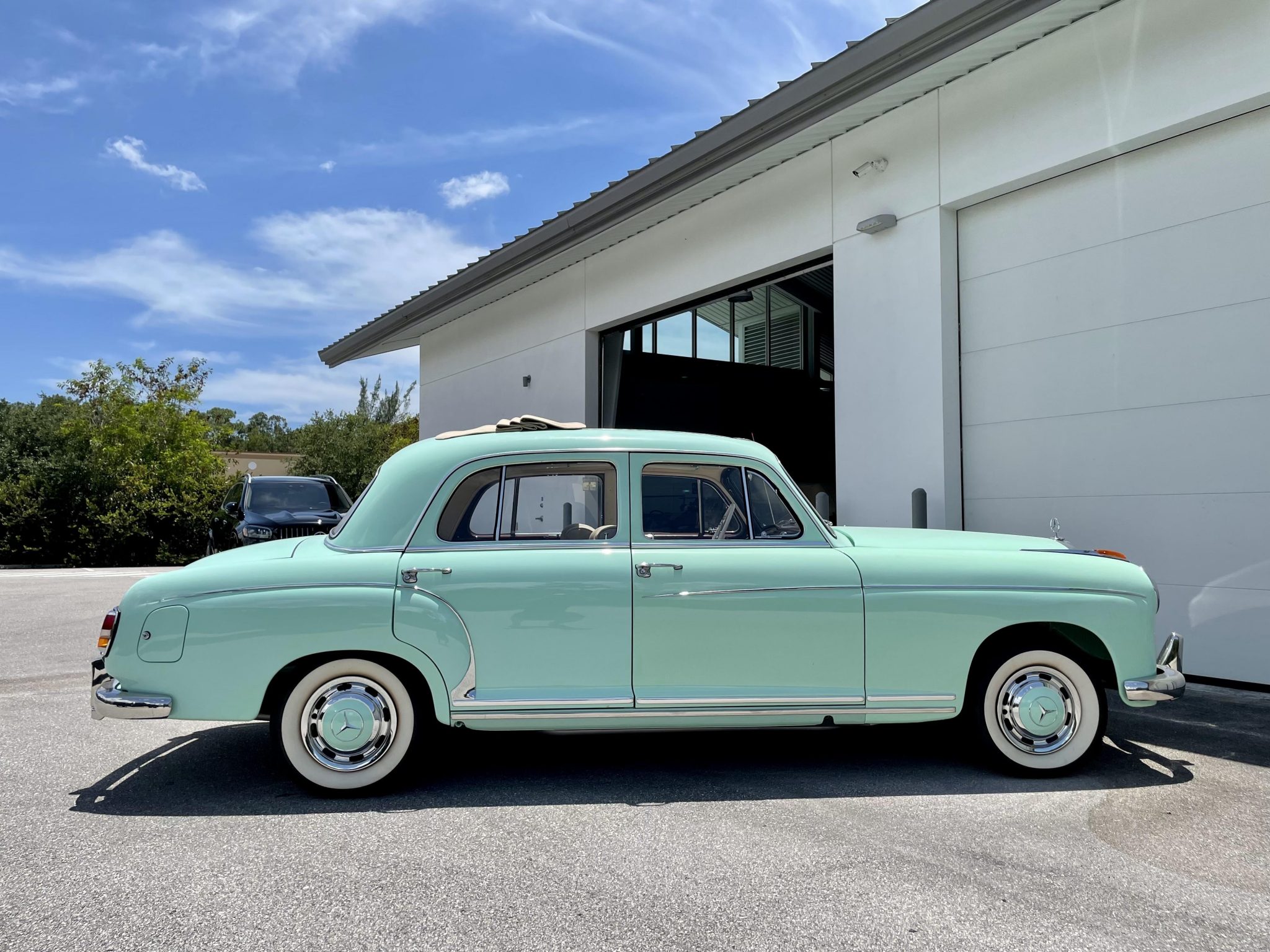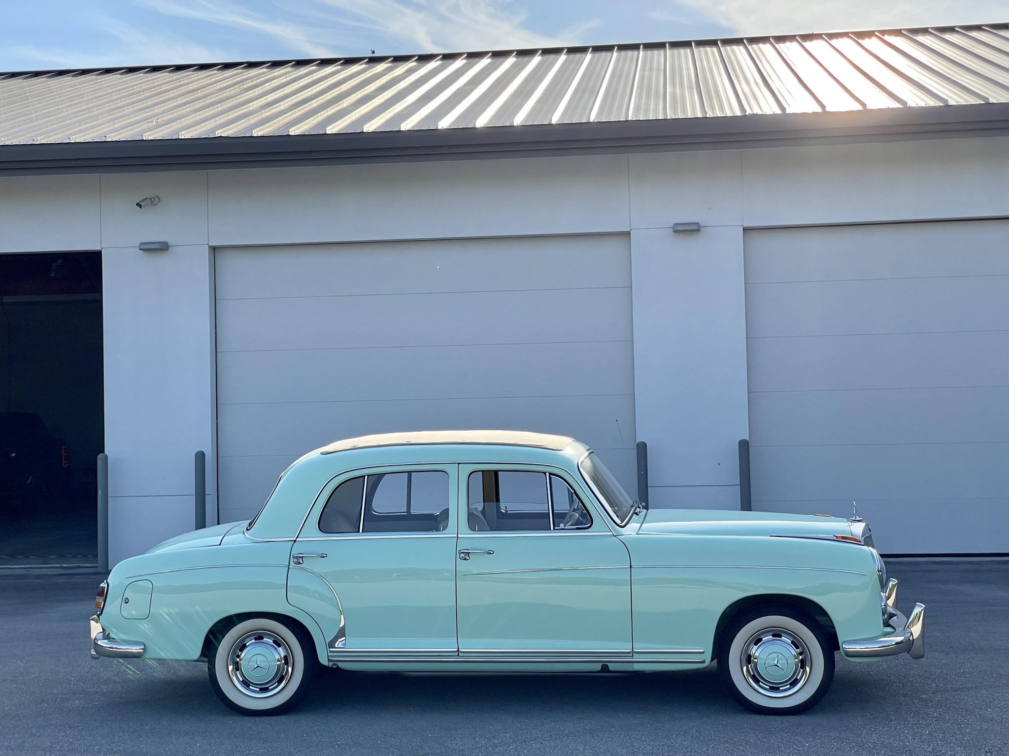 Steel 13″ wheels wear chrome wheel covers with color-matching centers and are mounted with BFGoodrich Silvertown wide whitewall tires. Braking is handled by power-assisted four-wheel drums, and the brake booster is said to have been replaced. A January service 2021 included a brake fluid flush.