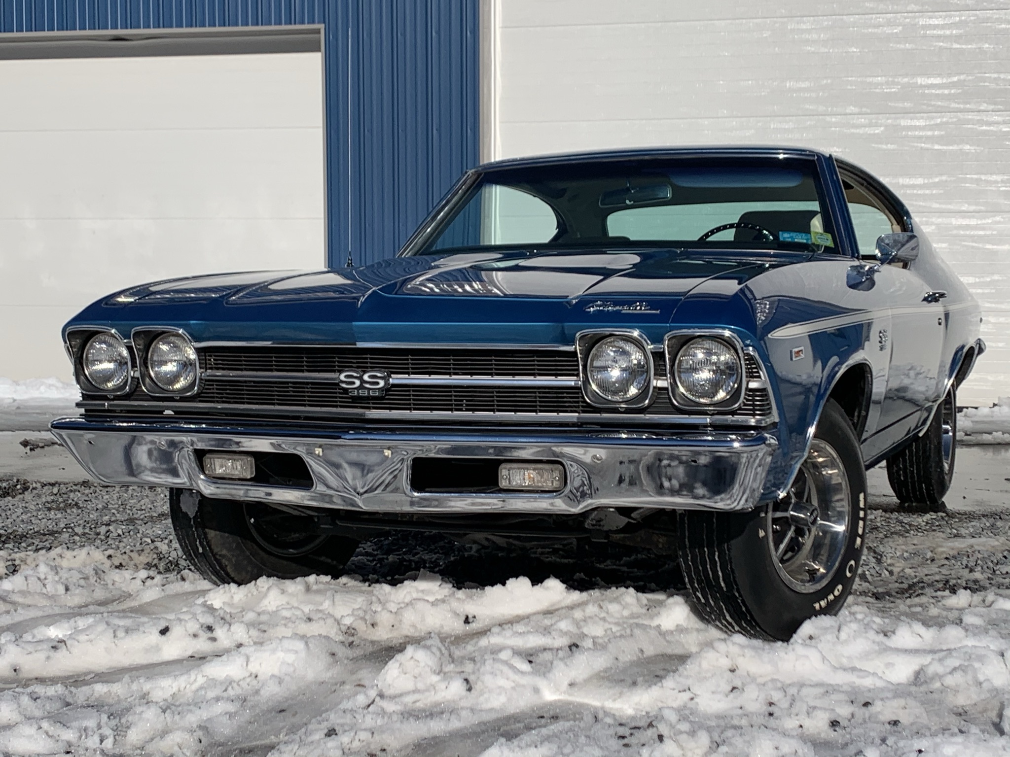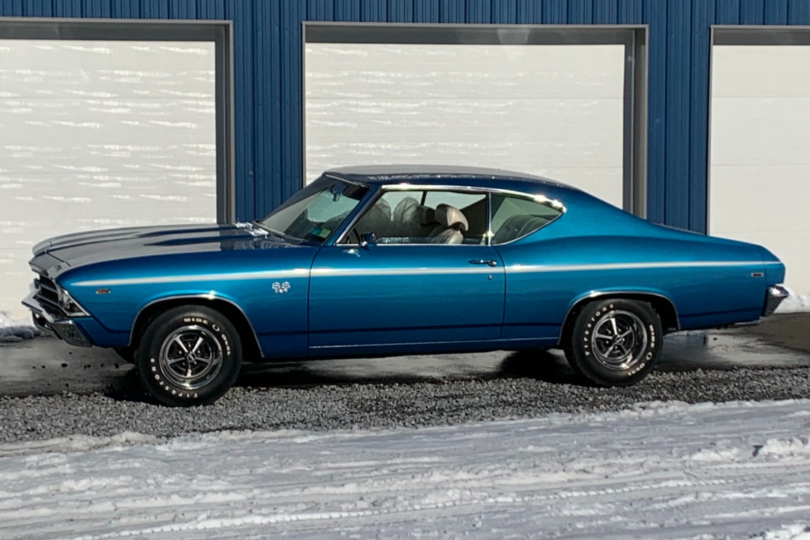Super Sport wheels with black recesses and chrome trim rings wear 14″ Firestone Wide Oval tires. The car was optioned with power-assisted front disc brakes. A narrated video is provided by the selling dealer.