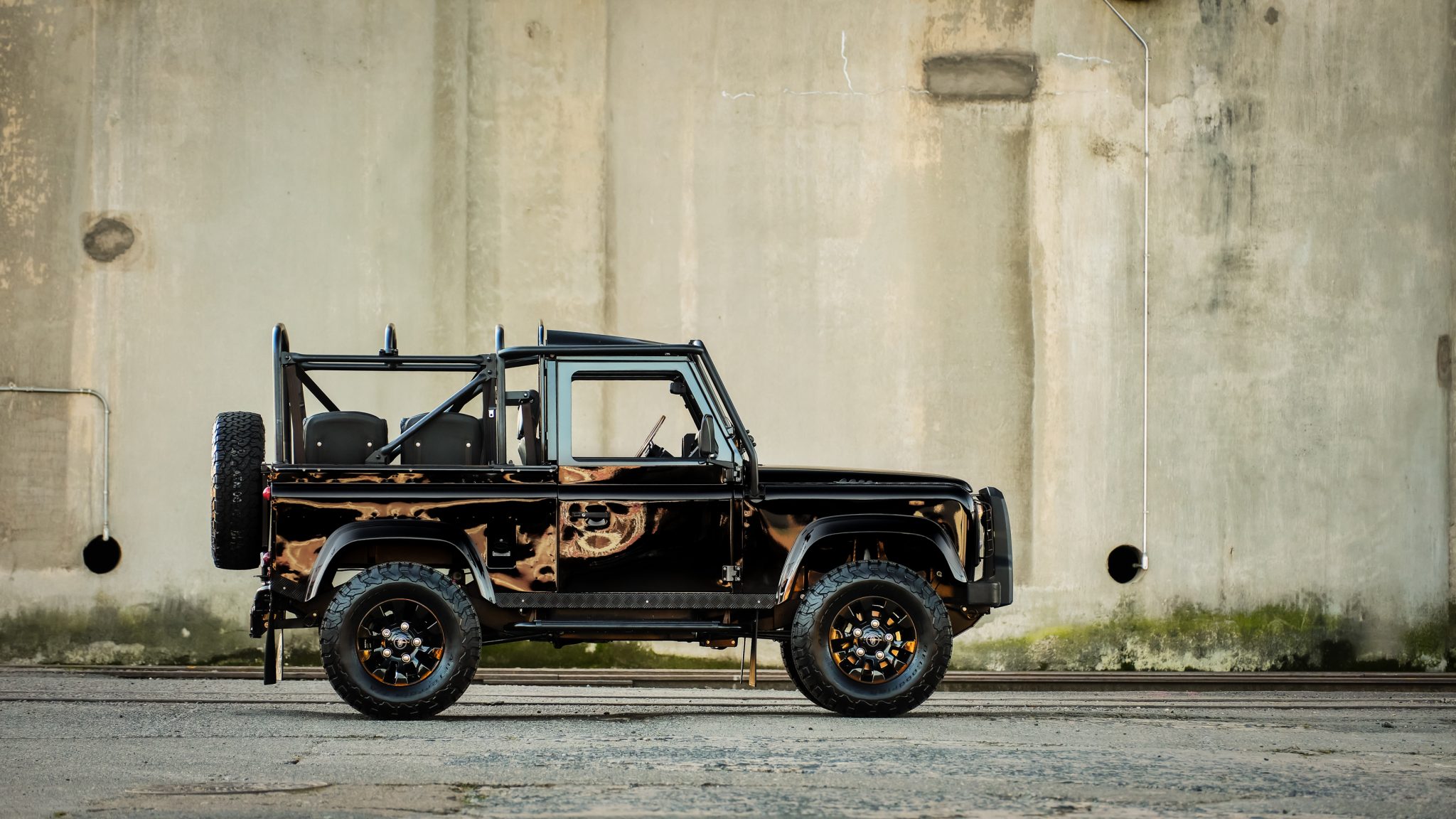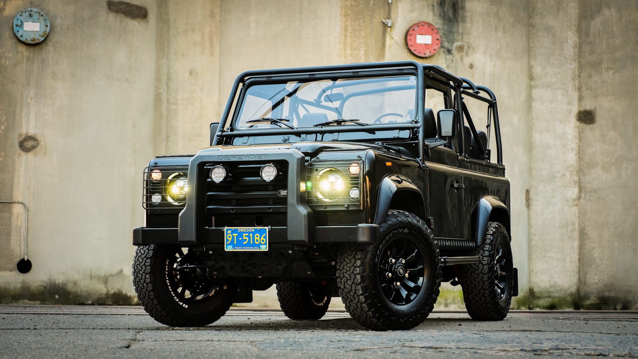 The custom black soft top features plastic side and rear windows and can be seen up close in the gallery. Black-finished 18″ Land Rover Sawtooth wheels are mounted with BFGoodrich All-Terrain T/A tires, with a matching spare mounted on a swing-away carrier out back. The suspension was lifted 1.5″ during the refurbishment, and Koni red shocks were fitted along with stainless steel fuel and brake lines. Stopping power is provided by front discs and rear drums.