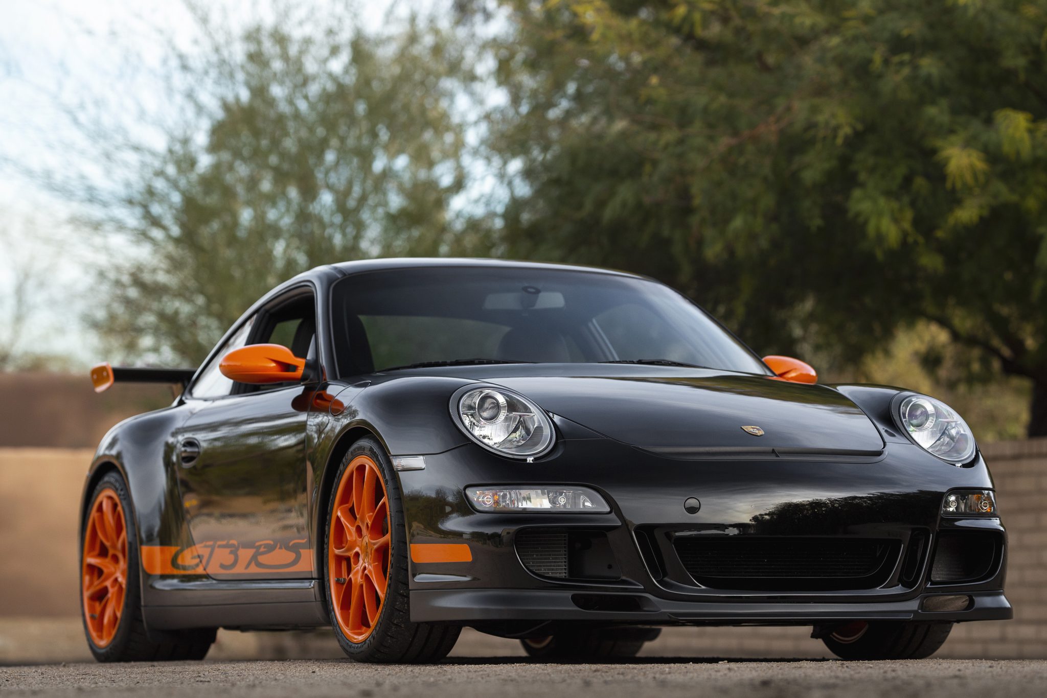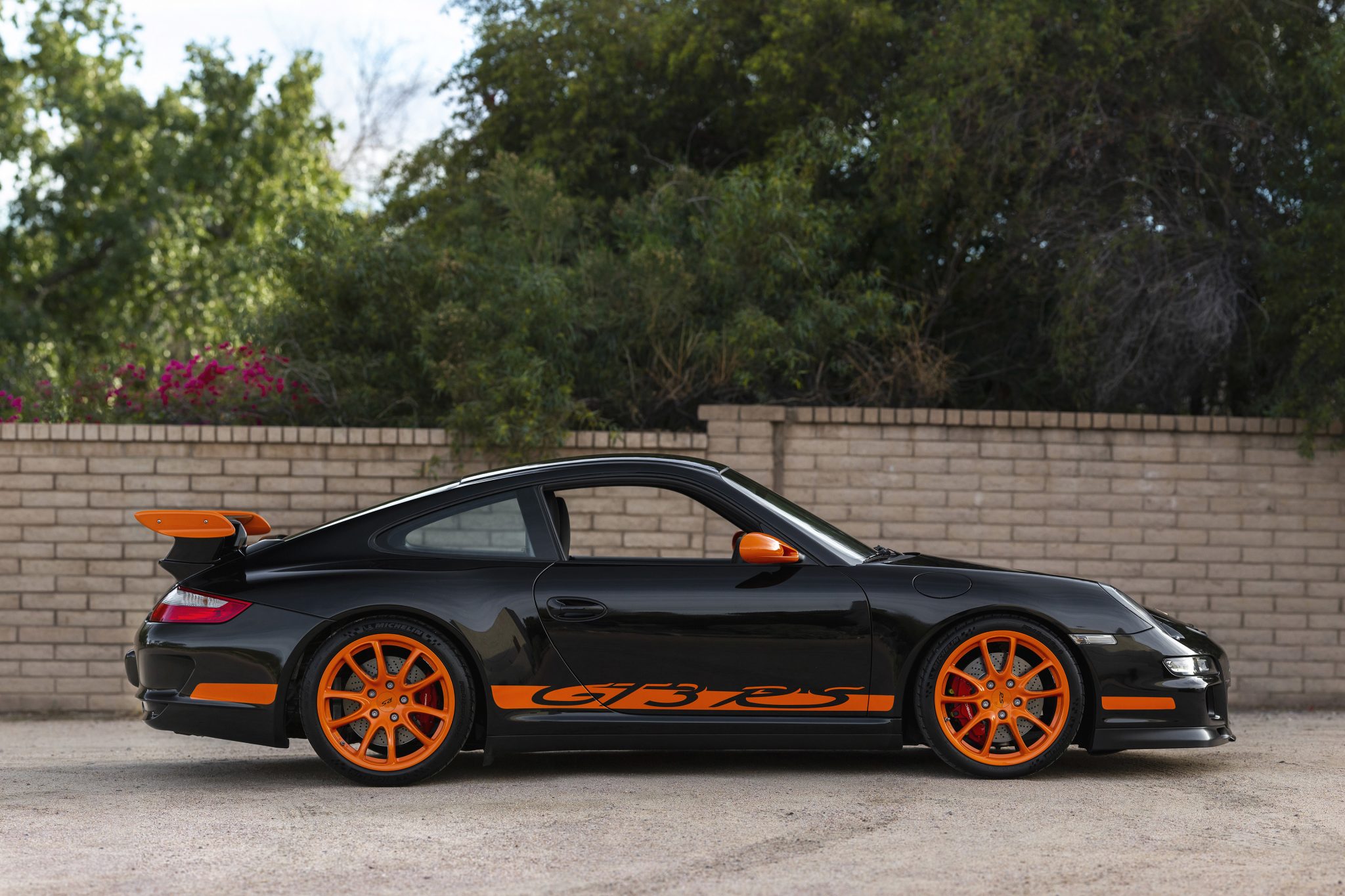 Orange-finished 19″ wheels have RS center caps and are mounted with staggered-width Michelin Pilot Sport Cup 2 tires. Porsche Active Suspension Management was standard equipment, and the disc brakes feature vented and cross-drilled rotors with red-finished calipers.