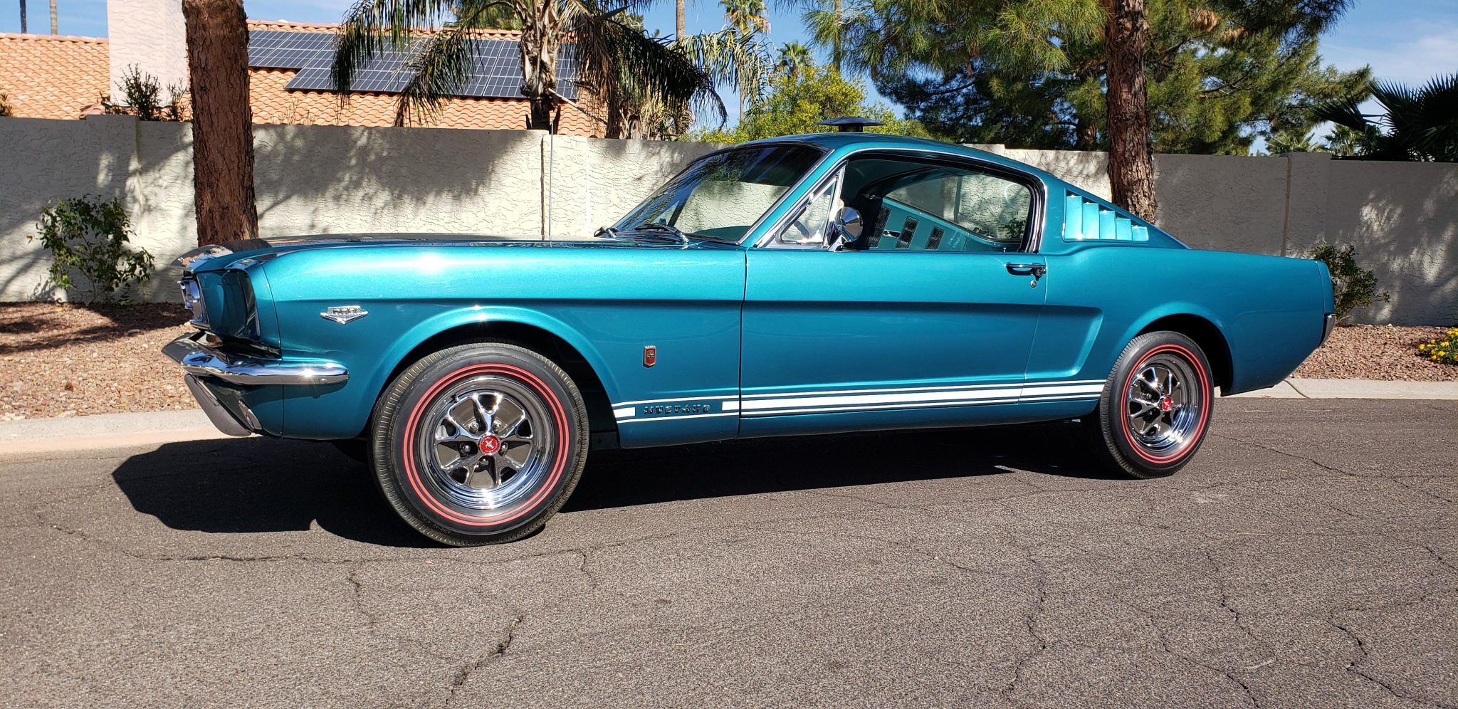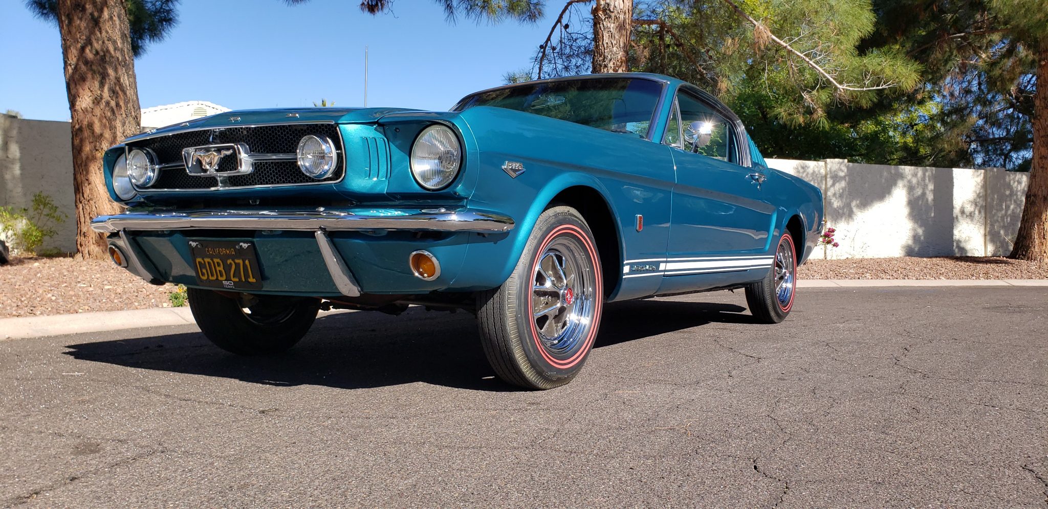 Chrome 14″ styled steel wheels wear pony center caps and BFGoodrich Silvertown redline bias-ply tires. A covered matching spare is housed in the trunk. The GT package included revised spring rates, stiffer shocks, and a thicker front sway bar from the factory when compared to the standard Mustang, as well as front disc brakes. Steering is unassisted.