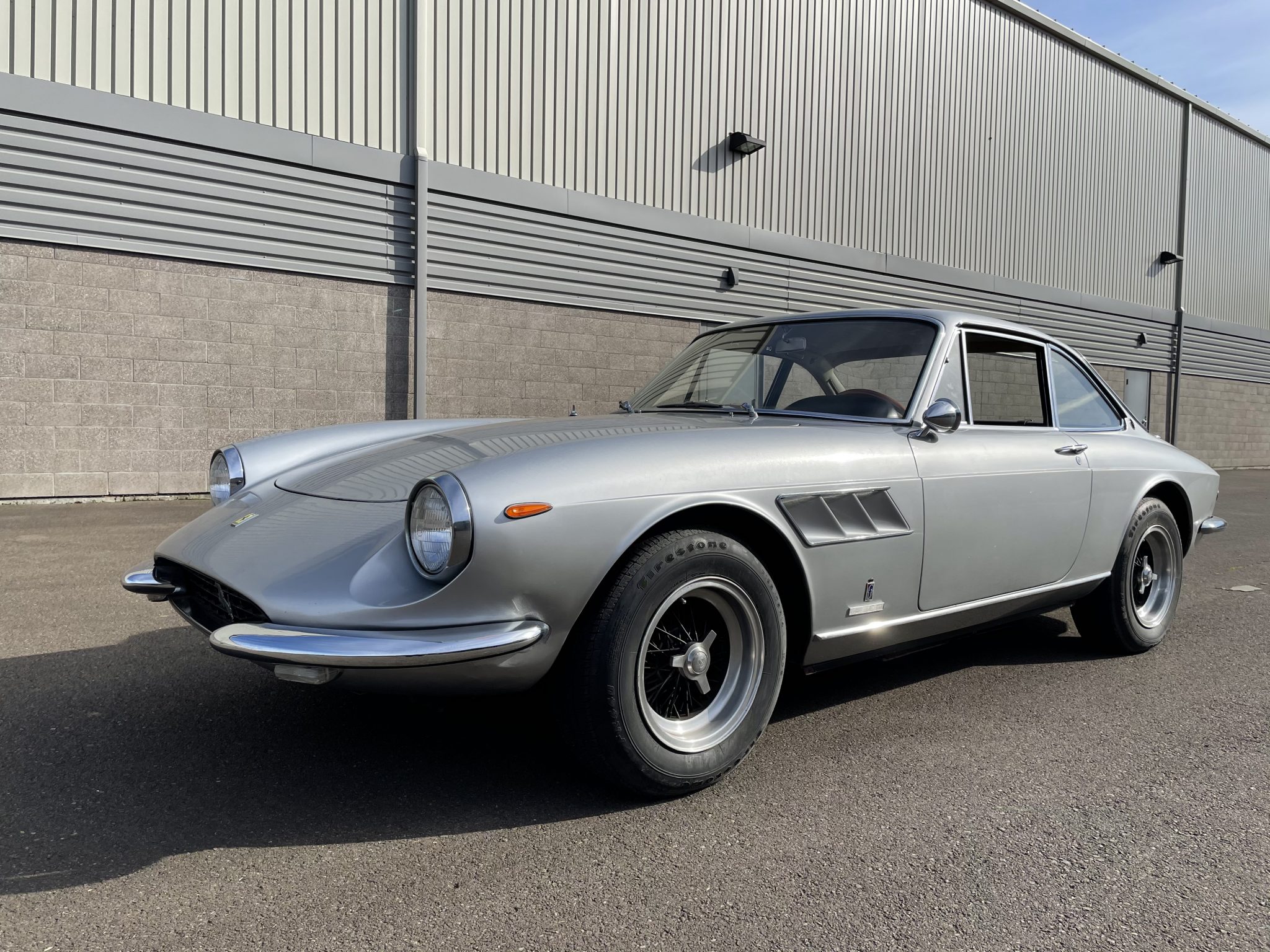 Details include a single Talbot side mirror, a power antenna, four exhaust tips, and two six-digit blue California license plates. Borrani wire wheels feature black spokes and polished rims, and are secured by three-eared knock-offs. Older Firestone FR440 tires are mounted at each corner as well as on the spare housed in the trunk. A 2021 overhaul of the power-assisted brakes included sending out the hydraulic components to be rebuilt according to the selling dealer.
