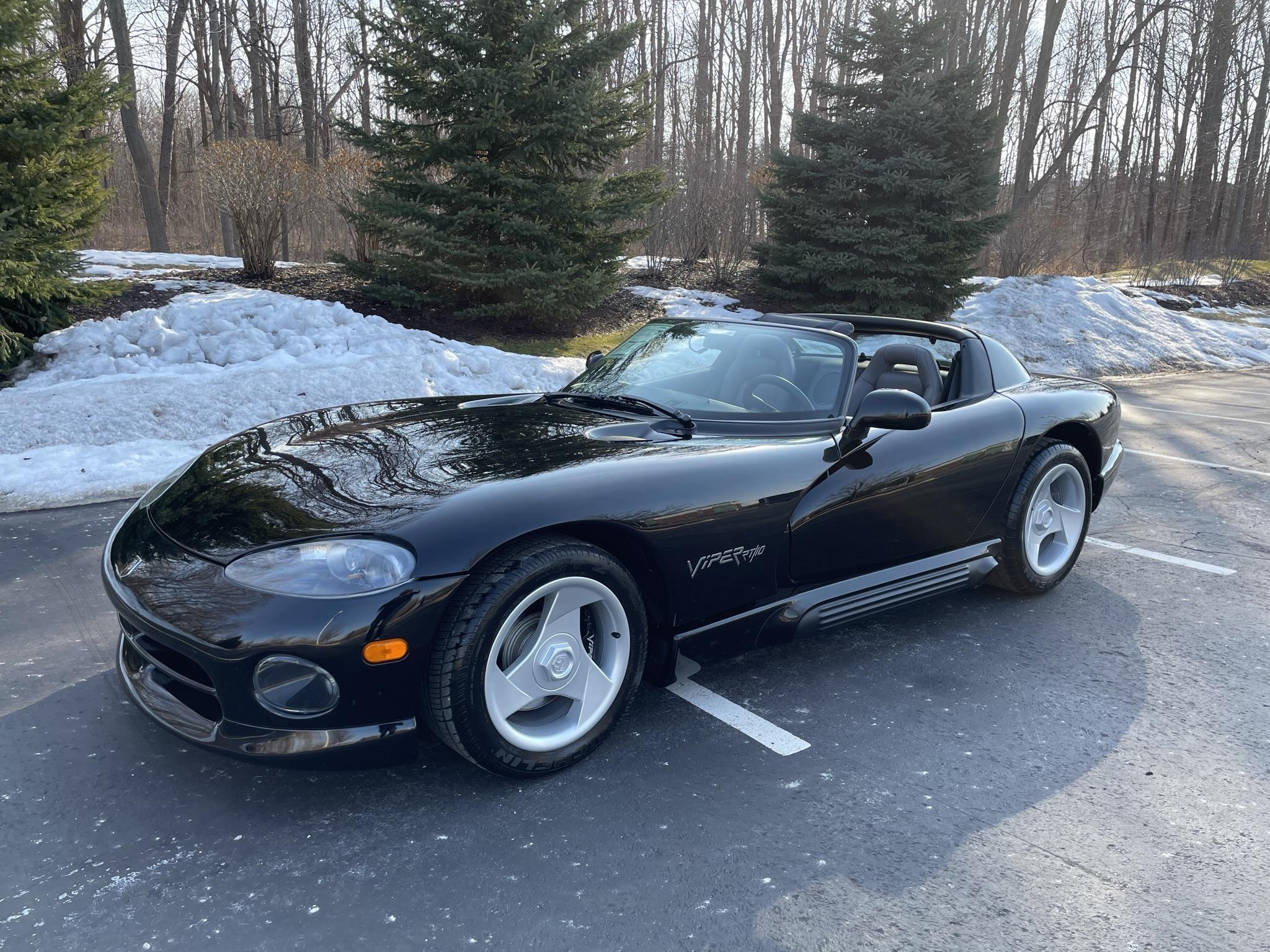 Silver 17″ tri-spoke wheels are mounted with Michelin XGT Z tires manufactured prior to 2000. The car is equipped with four-wheel disc brakes, and the black-finished front calipers feature Viper script.