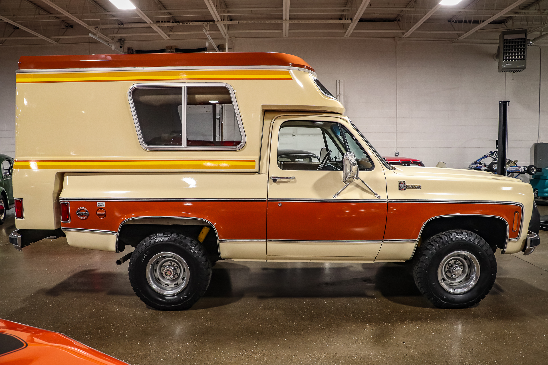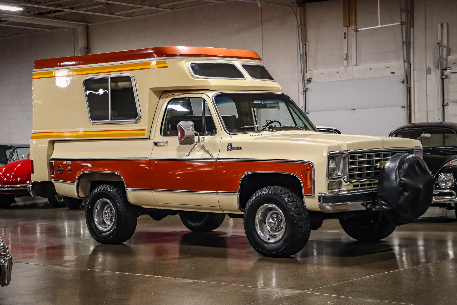 15″ Rallye wheels feature chrome center caps and beauty rings and wear 31x 10.50″ General Grabber A/T tires fitted in preparation for the sale. A spare wheel under a protective cover is mounted to the front of the truck.