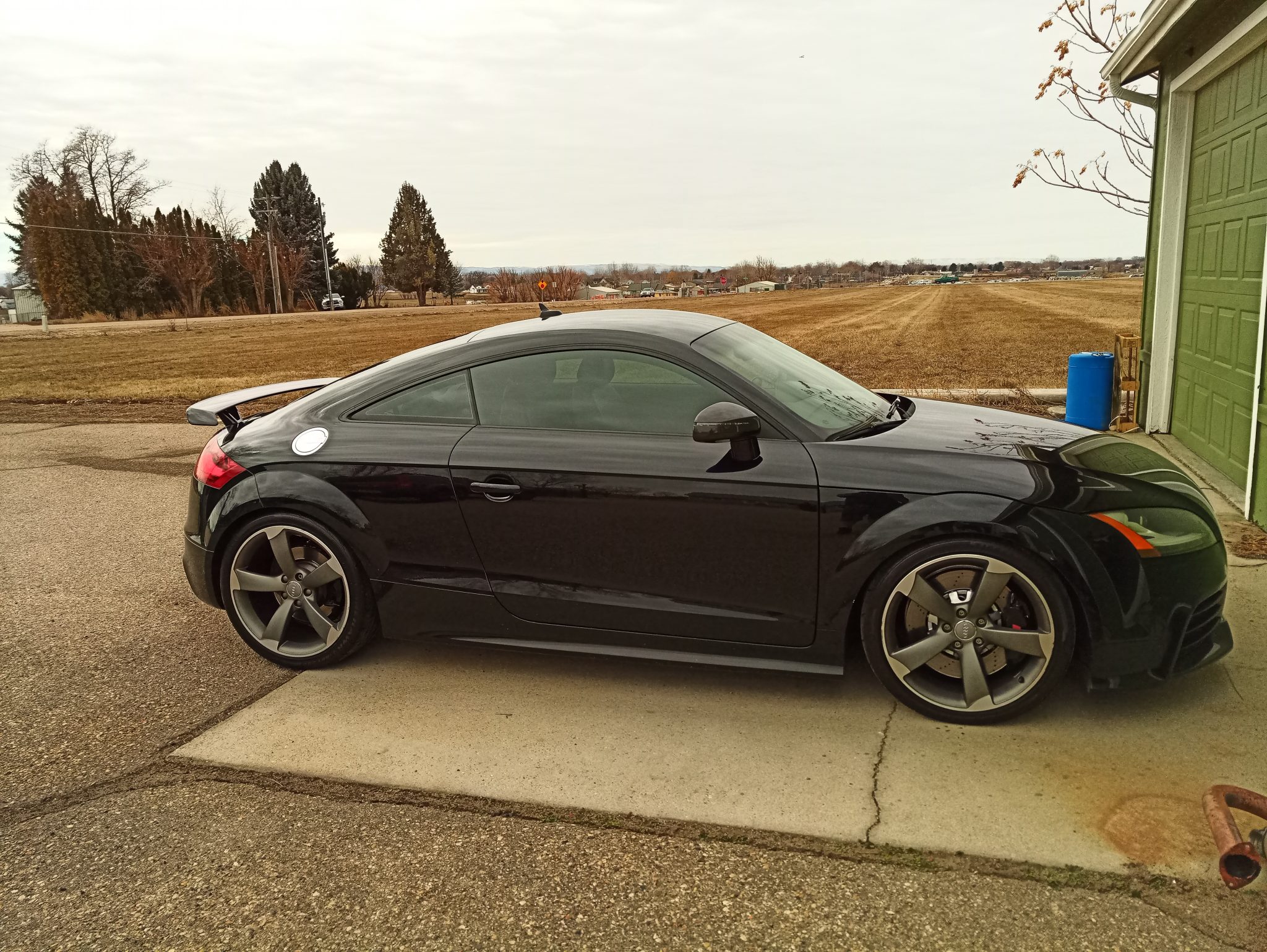 19″ titanium-finish wheels are wrapped in 255/35 Firestone Firehawk Indy 500 tires showing 2018 date codes. The electronically adjustable suspension was replaced with KW front coilovers and a height-adjustable KW rear setup in 2019. Additional components installed at that time include an 034Motorsport rear sway bar and APR adjustable front sway bar end links.