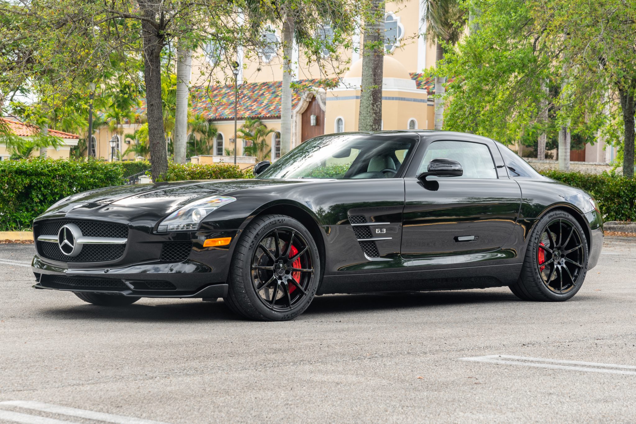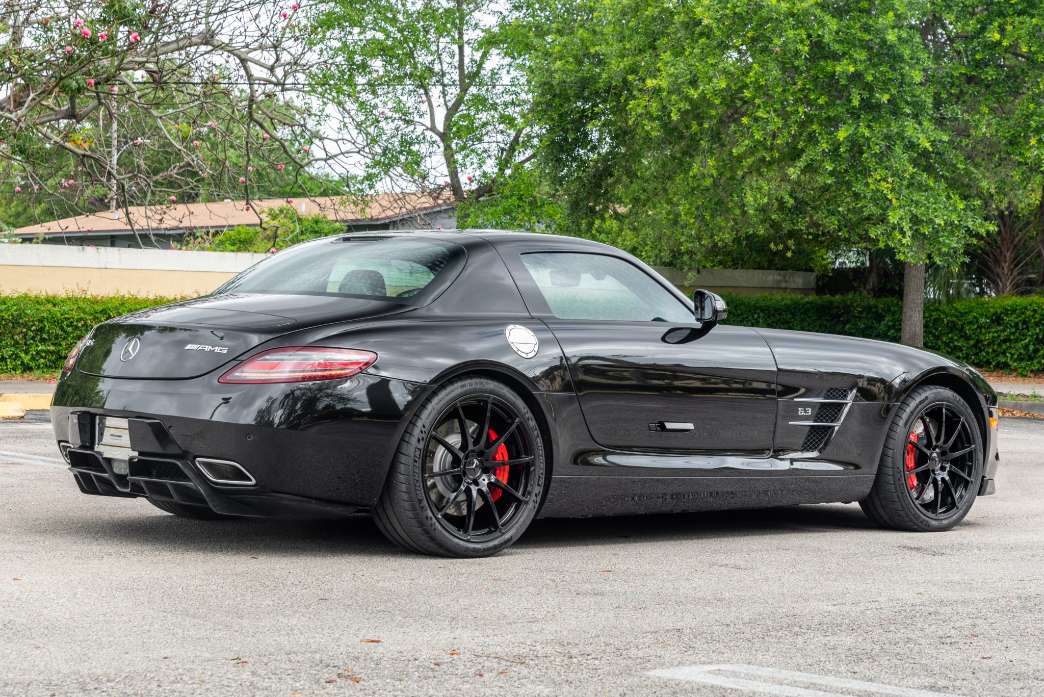 The 19″ front and 20″ rear forged alloy AMG wheels are wrapped in Michelin Pilot Sport Cup 2 tires, and the left front wheel was recently refinished. Braking is handled by red six-piston calipers up front and four-piston calipers at the rear, and the suspension features forged aluminum double wishbones at all four corners.