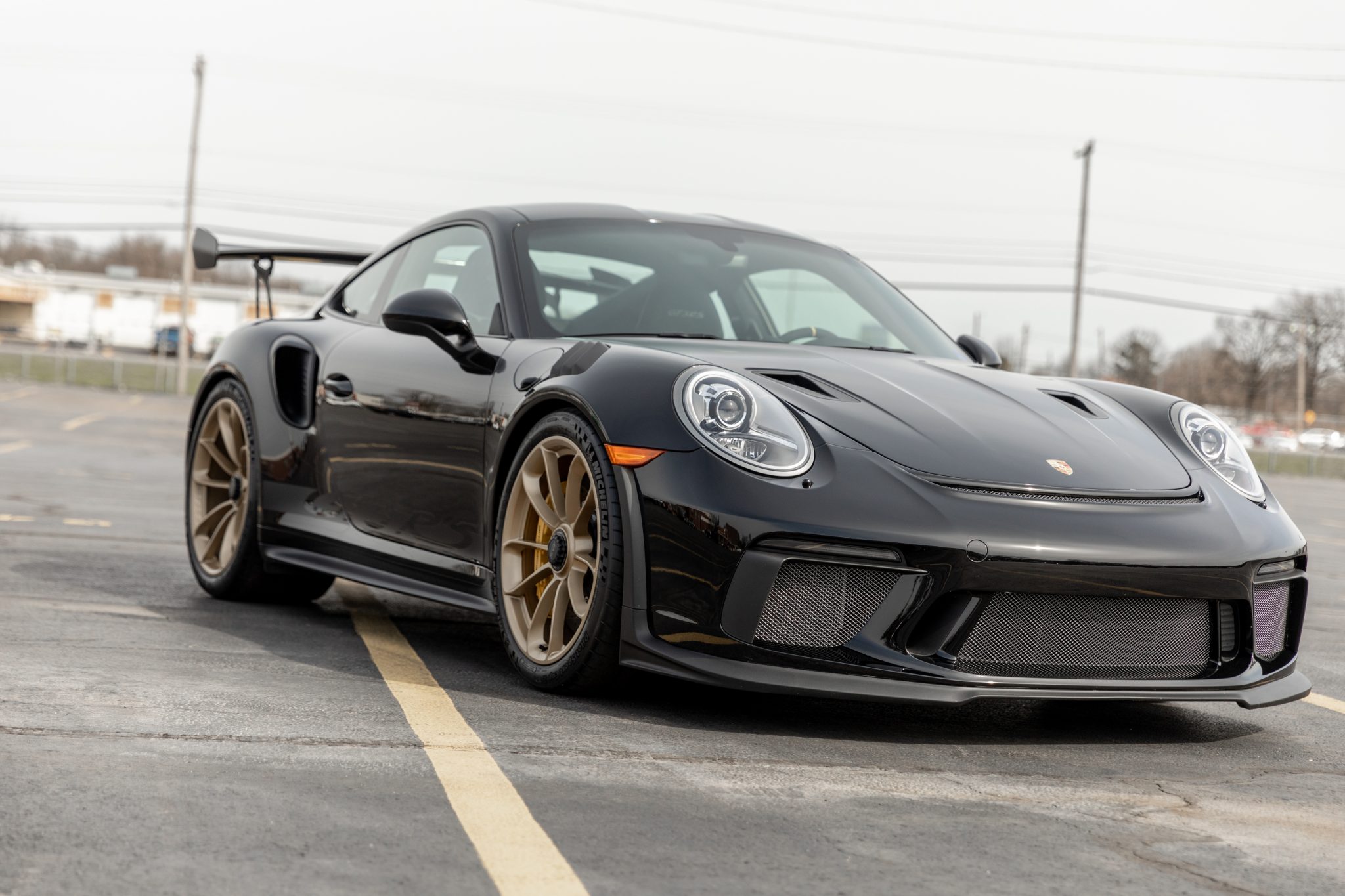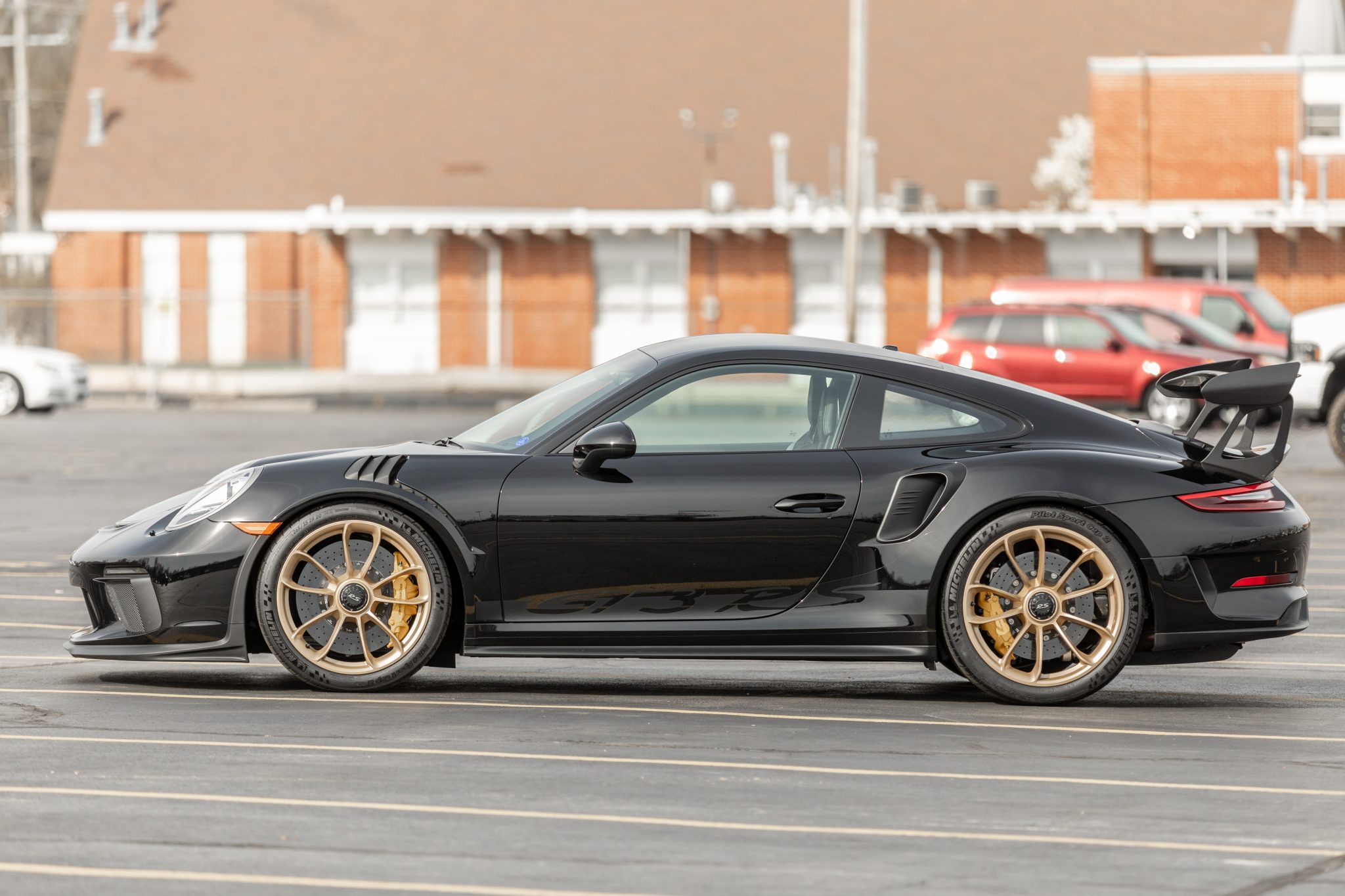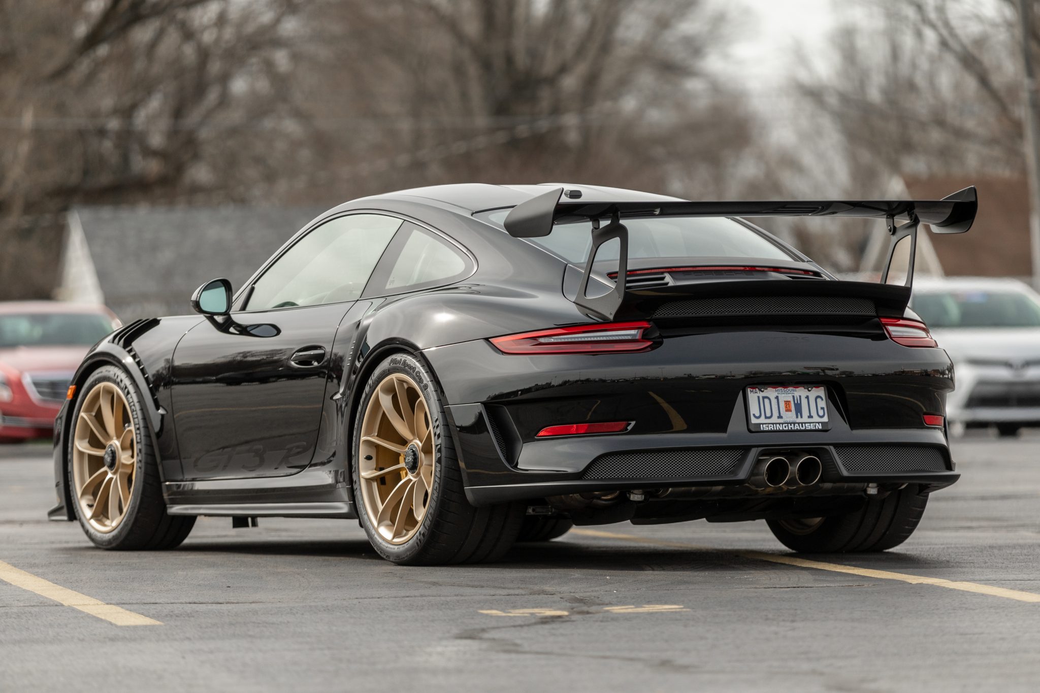 Center-locking 20″ front and 21″ rear wheels are finished in bronze and are mounted with Michelin Pilot Sport Cup 2 tires showing 2018 date codes and measuring 265/35 up front and 325/30 out back. The GT3 RS came standard with rear-axle steering and Porsche Torque Vectoring Plus with a variable rear axle differential lock. This example is optioned with a front-axle lift system as well as Porsche Ceramic Composite Brakes with yellow calipers.