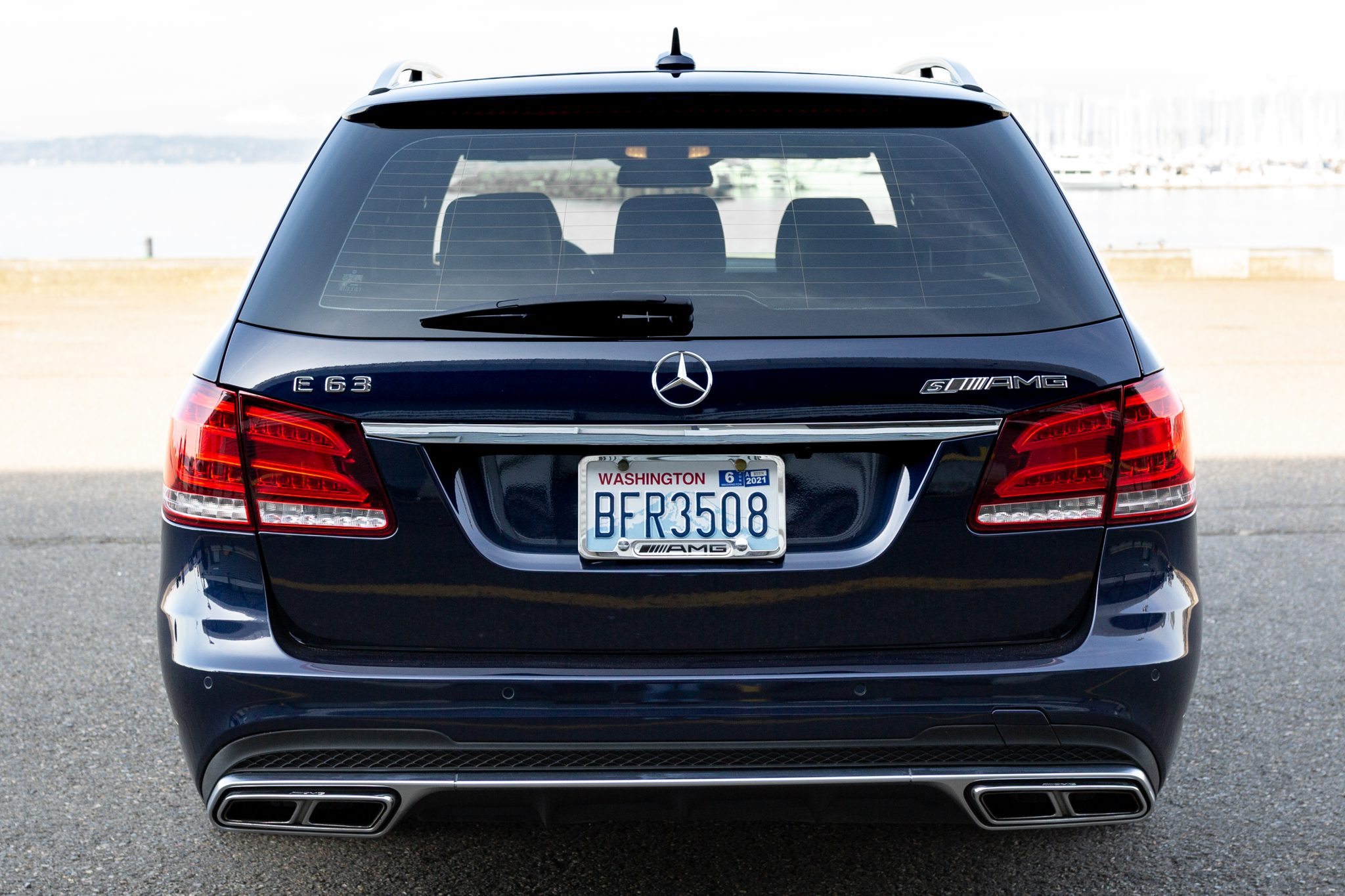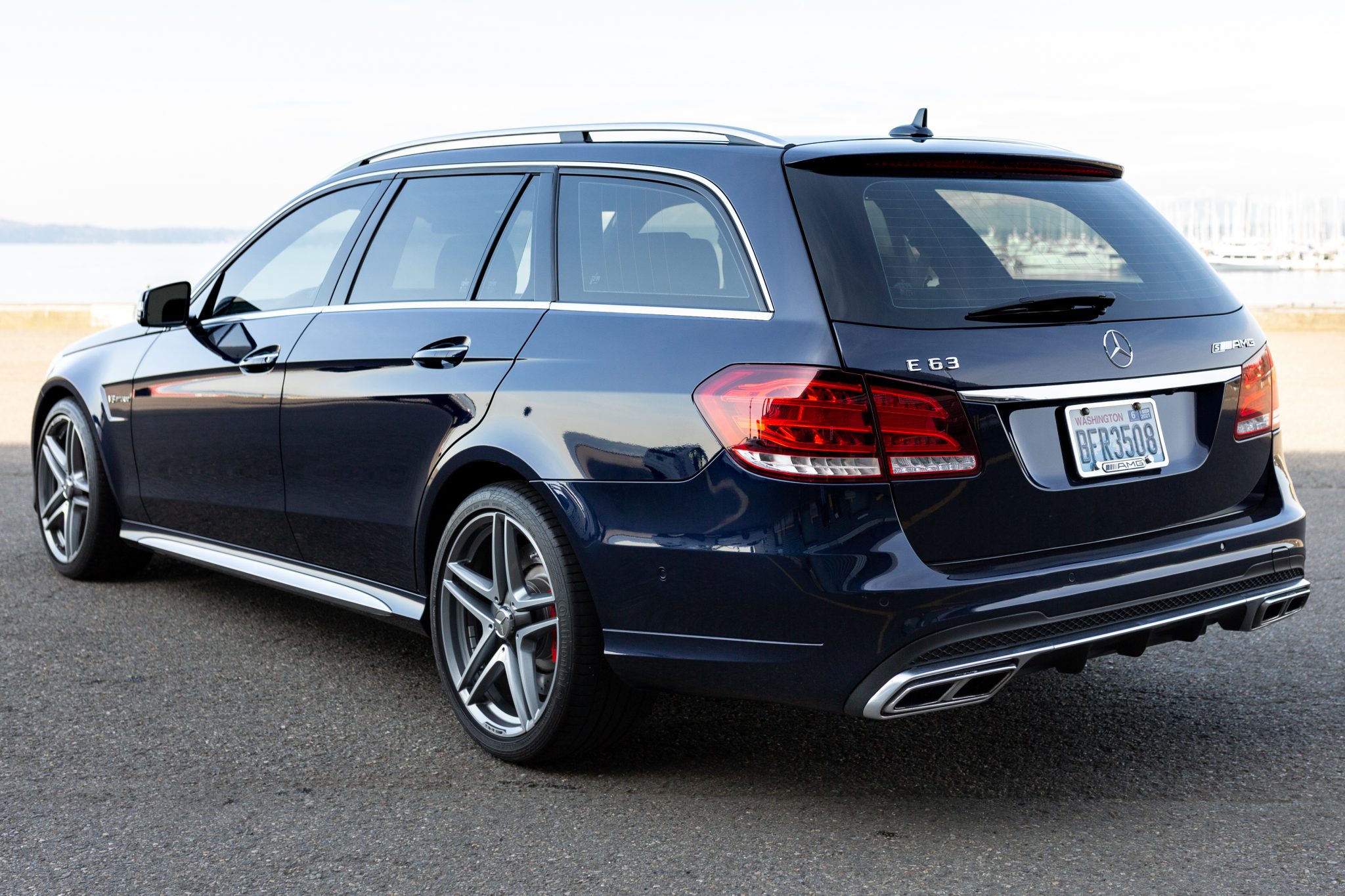 AMG 19″ twin-spoke wheels are mounted with Continental ContiSportContact tires displaying 2013 date codes and measuring 255/35 up front and 285/30 out back. Braking is provided by red-finished multi-piston calipers over cross-drilled and slotted rotors all around. The Driver Assistance package adds active blind spot assistance, active lane keeping assistance, cross-traffic assistance, pre-safe braking functions with pedestrian recognition, and Distronic Plus cruise control with steering assist. Curb marks are displayed in the gallery below.