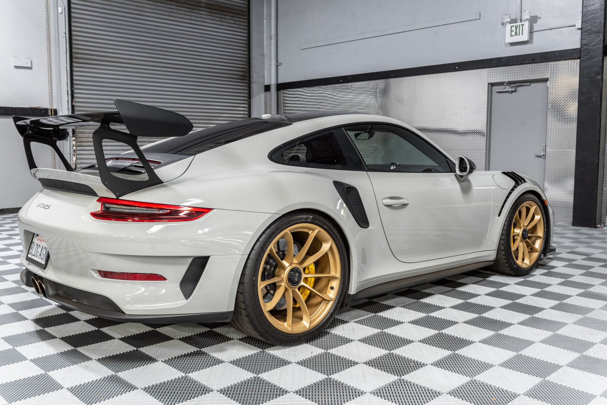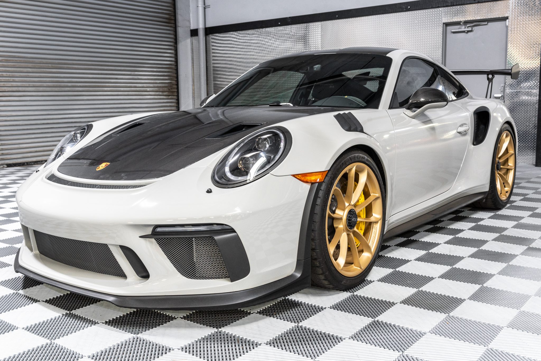 Factory 20″ front and 21″ rear center-lock wheels are finished in satin gold and wear Dunlop Sport Maxx Race 2 tires measuring 265/35 up front and 325/30 out back. The Weissach Package specified stiffer carbon composite anti-roll bars, and this example is optioned with Porsche Ceramic Composite brakes with yellow calipers as well as the front-axle lift system.