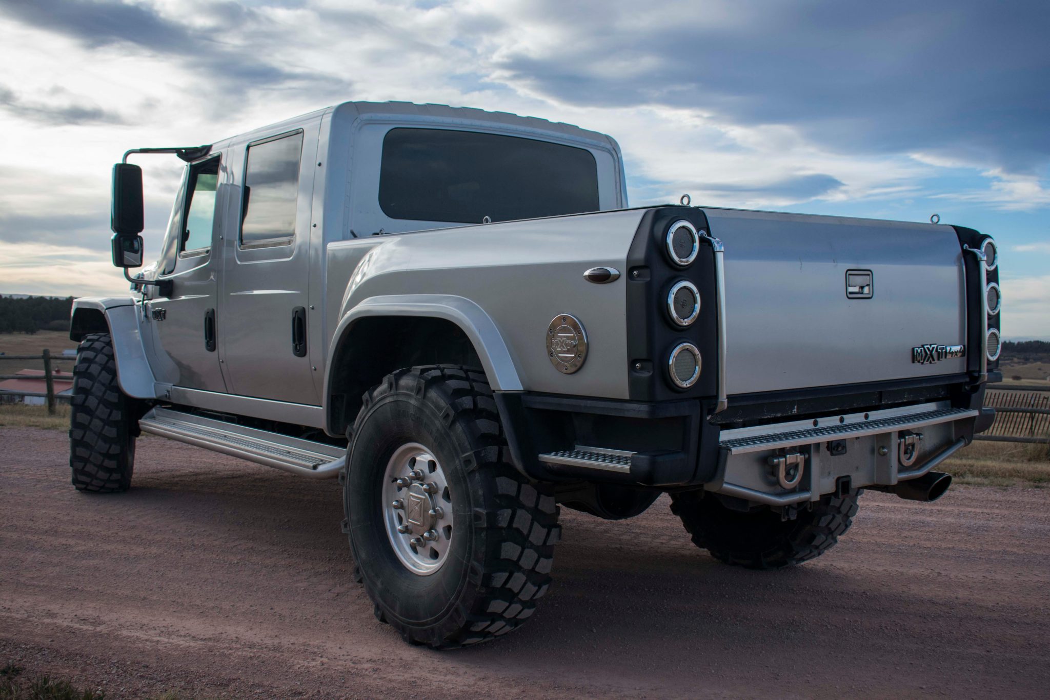 Polished 20″ eight-lug wheels are mounted with 395/85 Michelin tires. The seller notes cracking on the sidewalls, and stopping power is provided by hydraulic brakes with four-channel ABS.