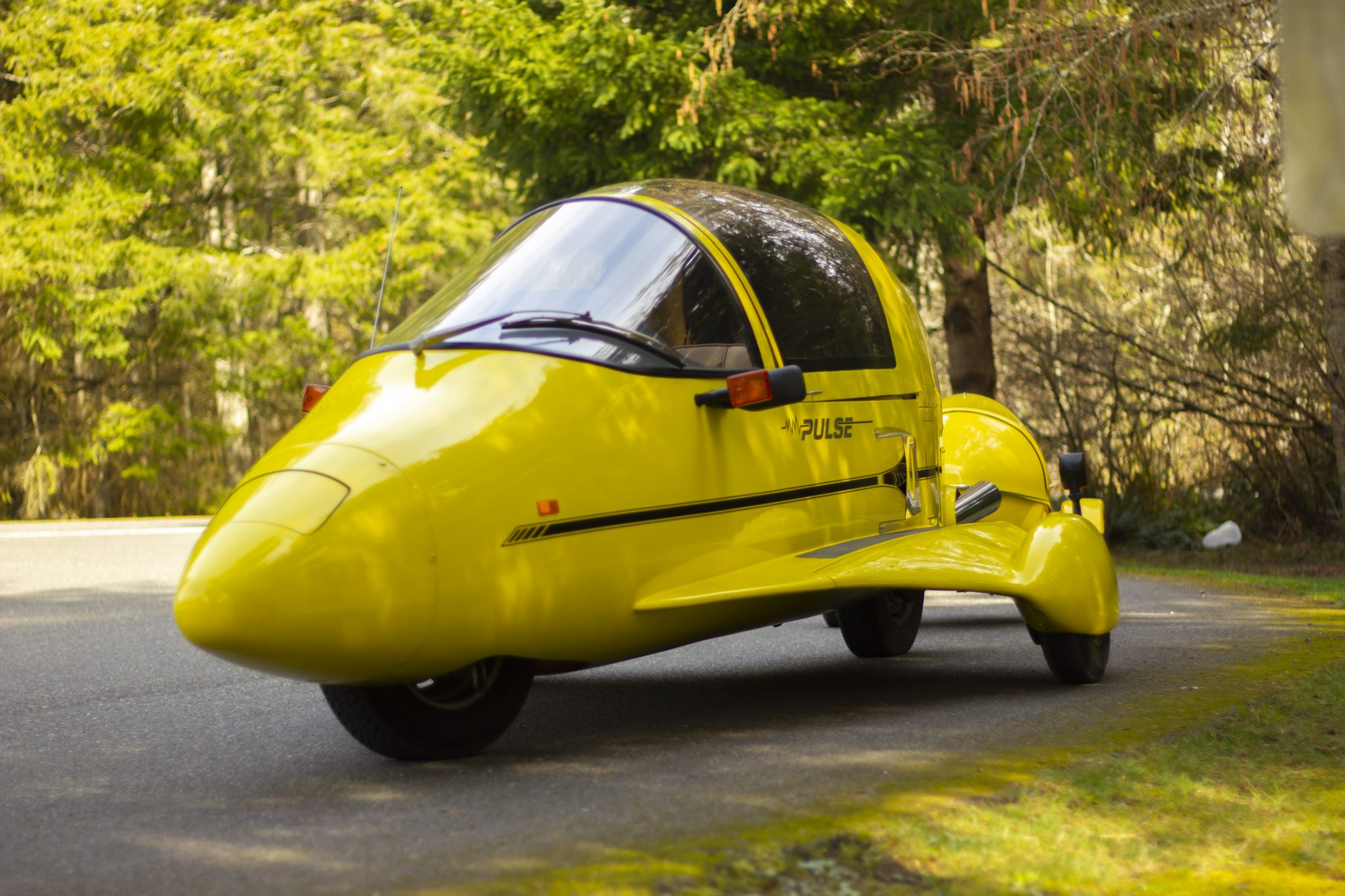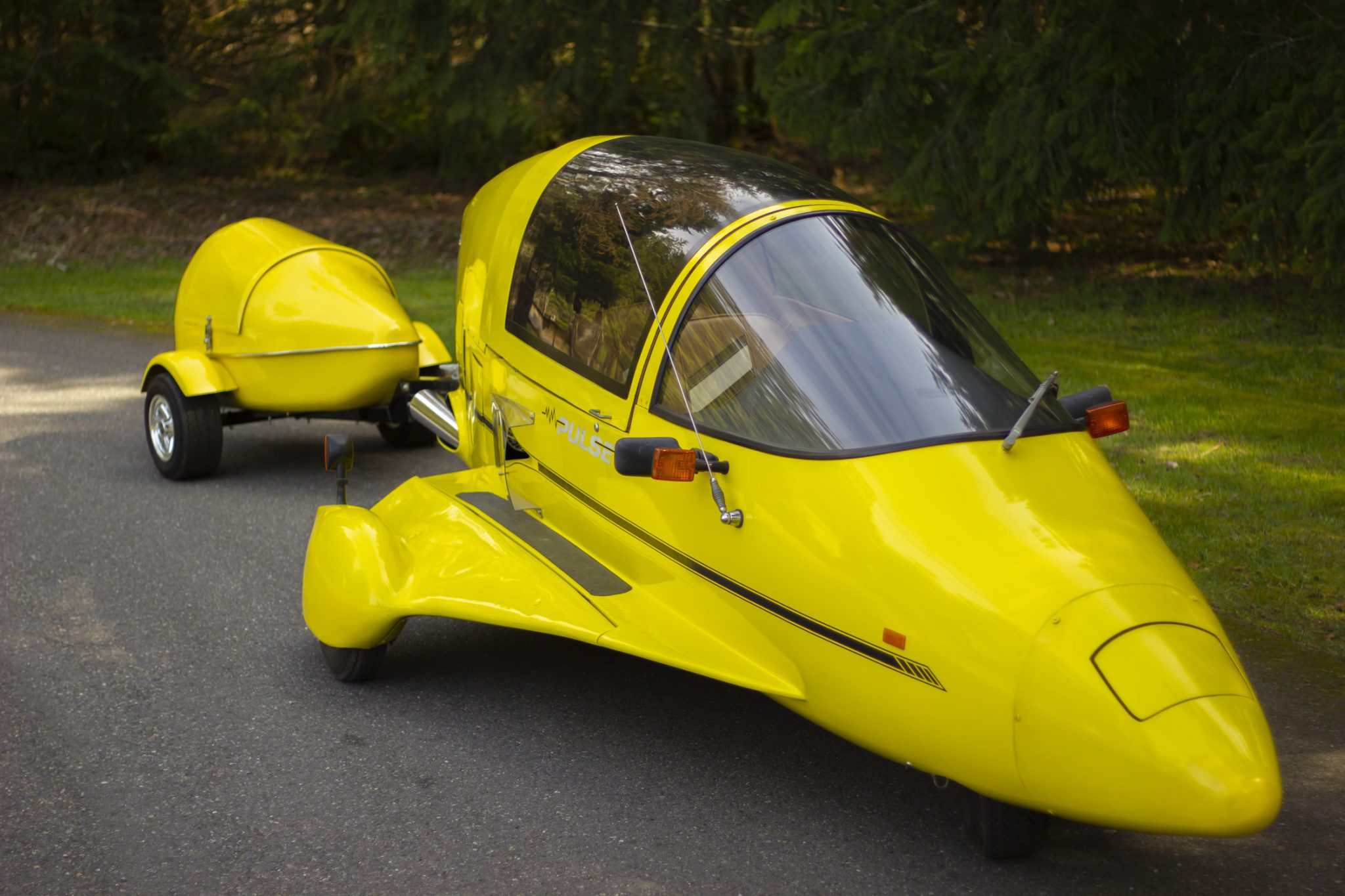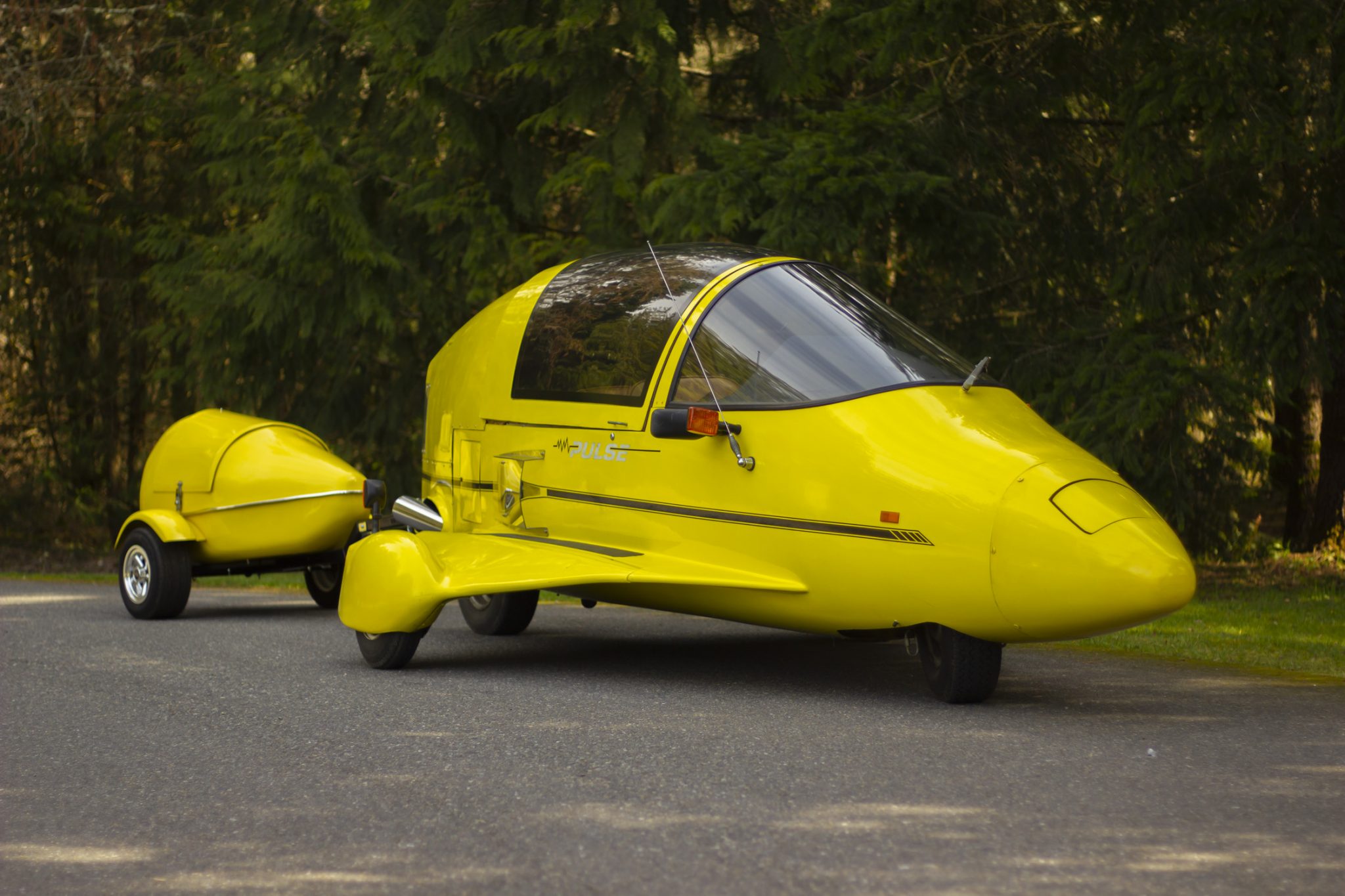 The Pulse was designed as a two-wheeled vehicle with an additional two wheels mounted to fiberglass-skirted outriggers on either side of the body. This example rides on two central 13″ wheels mounted with 155/80 Firestone WR-12 tires and joined by 4.80-8″ trailer tires on either side. The outriggers are mounted to the body with adjustable tie rods, and the suspension system consists of a spring-over design up front and a swingarm at the rear. Braking is handled by hydraulically assisted front and rear discs.