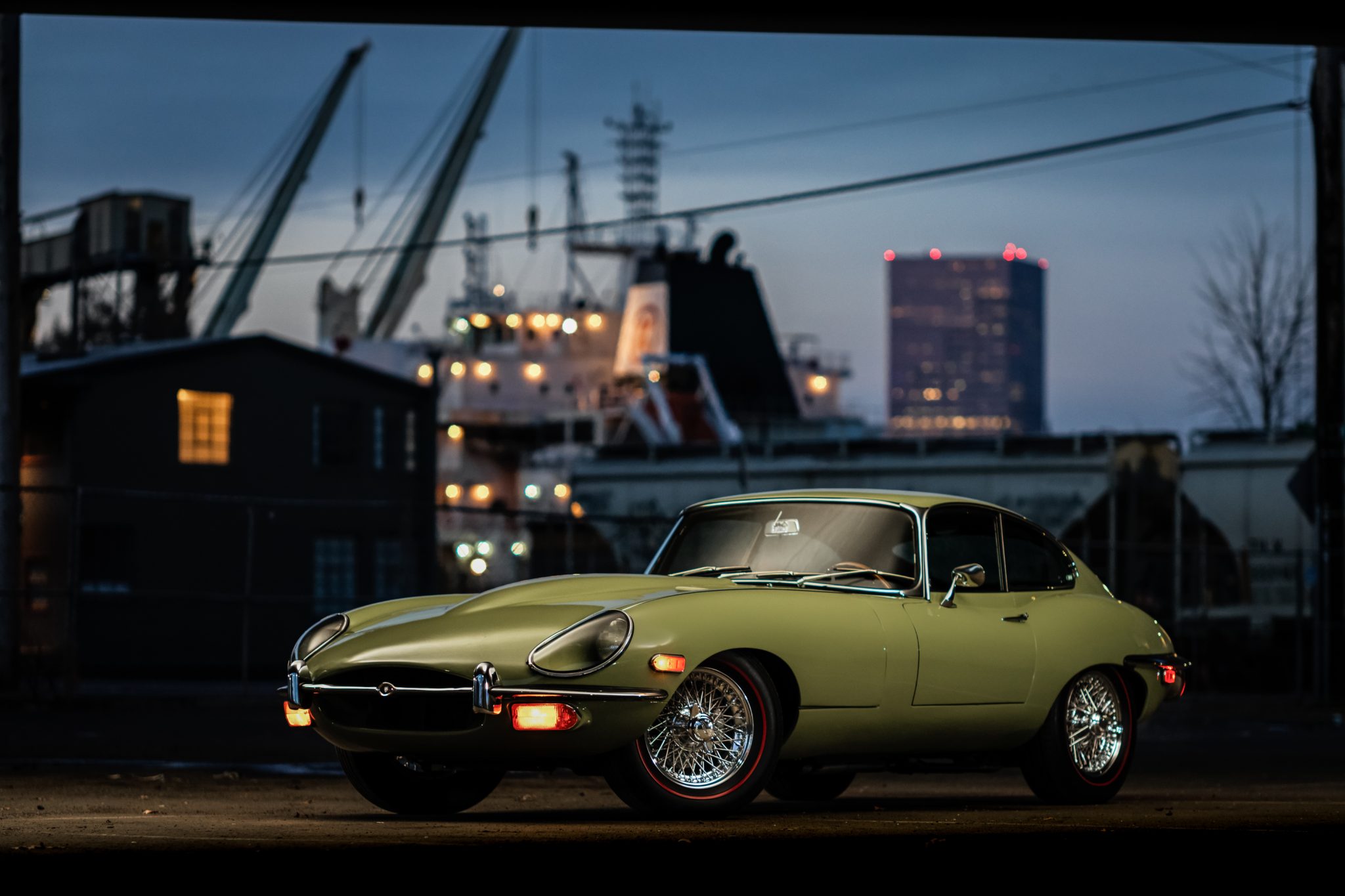 Chrome 15″ wire wheels are secured with winged knock-offs and wrapped in Michelin redline tires. XJ40 lower ball joints have been installed, and braking is provided by Gran Turismo vented rotors, rebuilt calipers, and a replacement master cylinder.