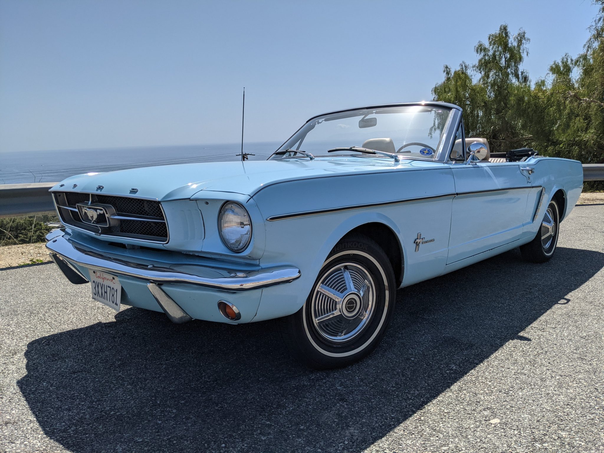Steel wheels wear Mustang-branded hubcaps and are mounted with Hankook Optimo H724 white-stripe tires. The suspension and brakes are said to have been overhauled within the previous decade, and the seller notes play in the steering box.