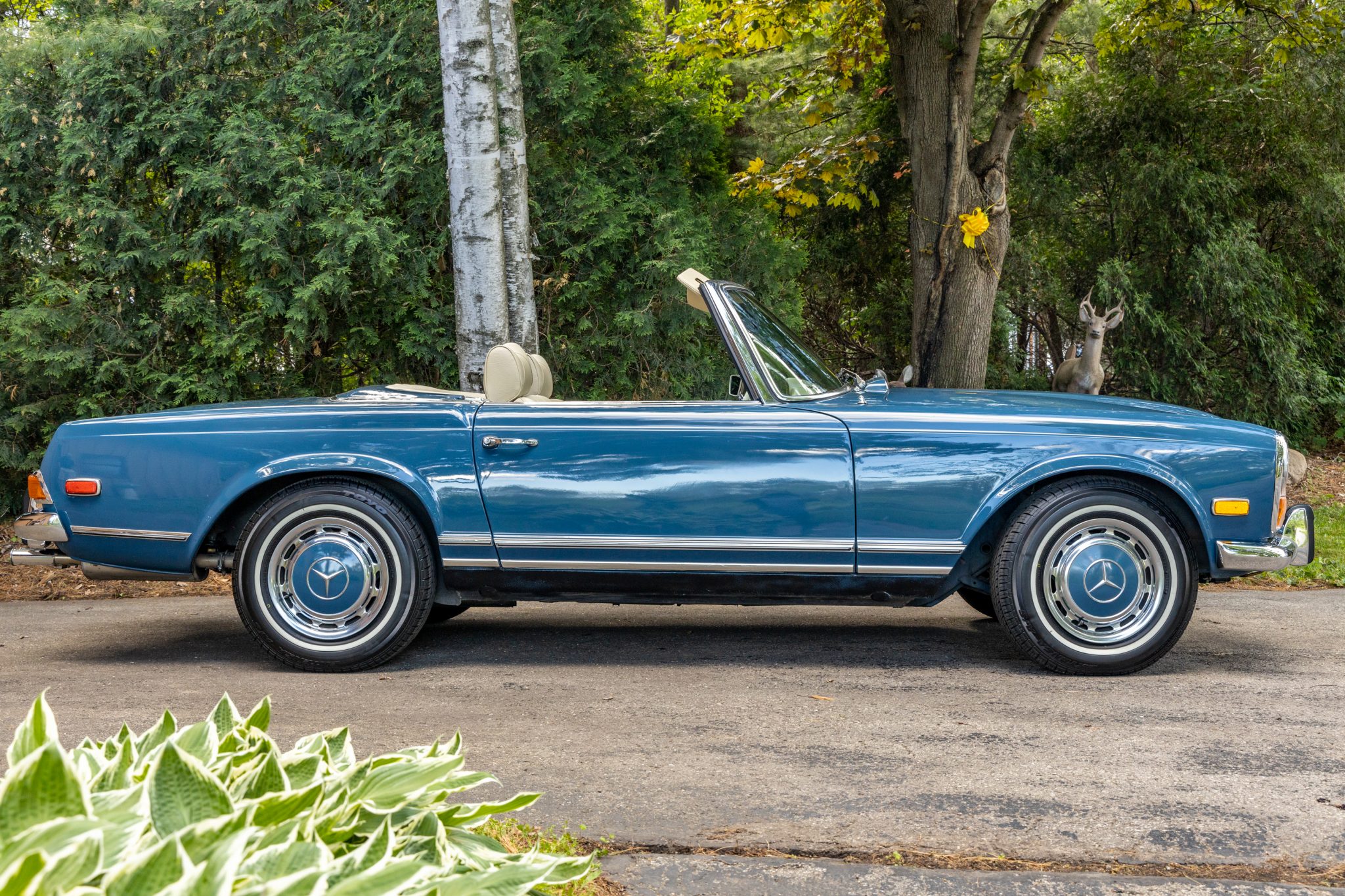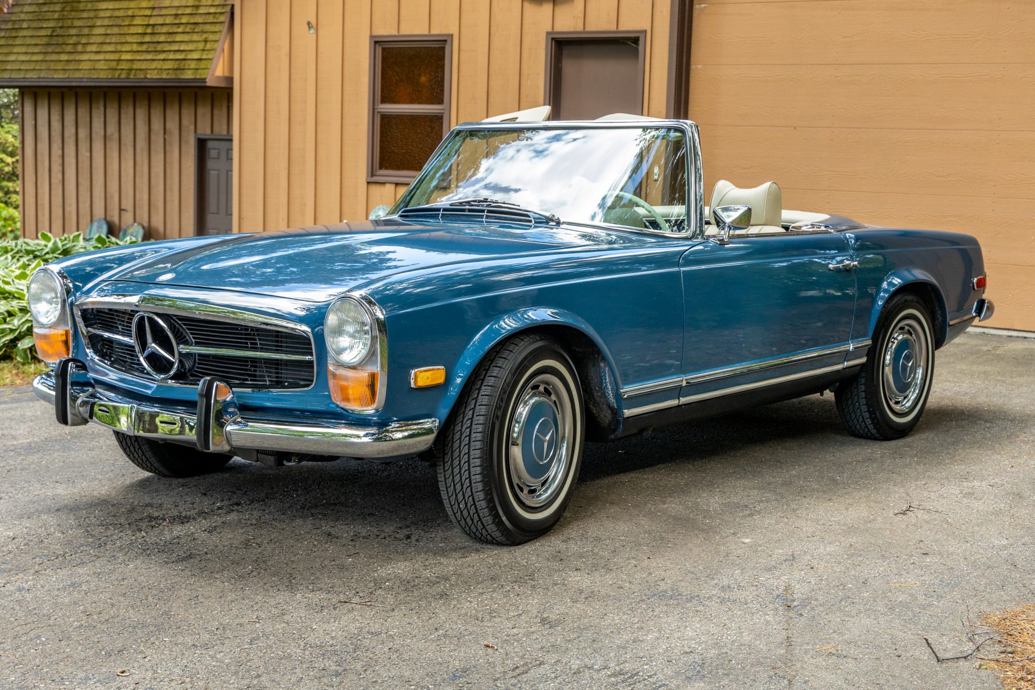 Steel 14″ wheels wear polished covers with color-matched centers and are mounted with Toyo Extensa A/S whitewall tires. Equipment includes power-assisted steering and four-wheel disc brakes, and work in August 2020 included flushing the brake fluid and replacing the subframe bushings, front and rear shocks, a steering damper, rear shock mounts, and rear trailing-arm mounts.