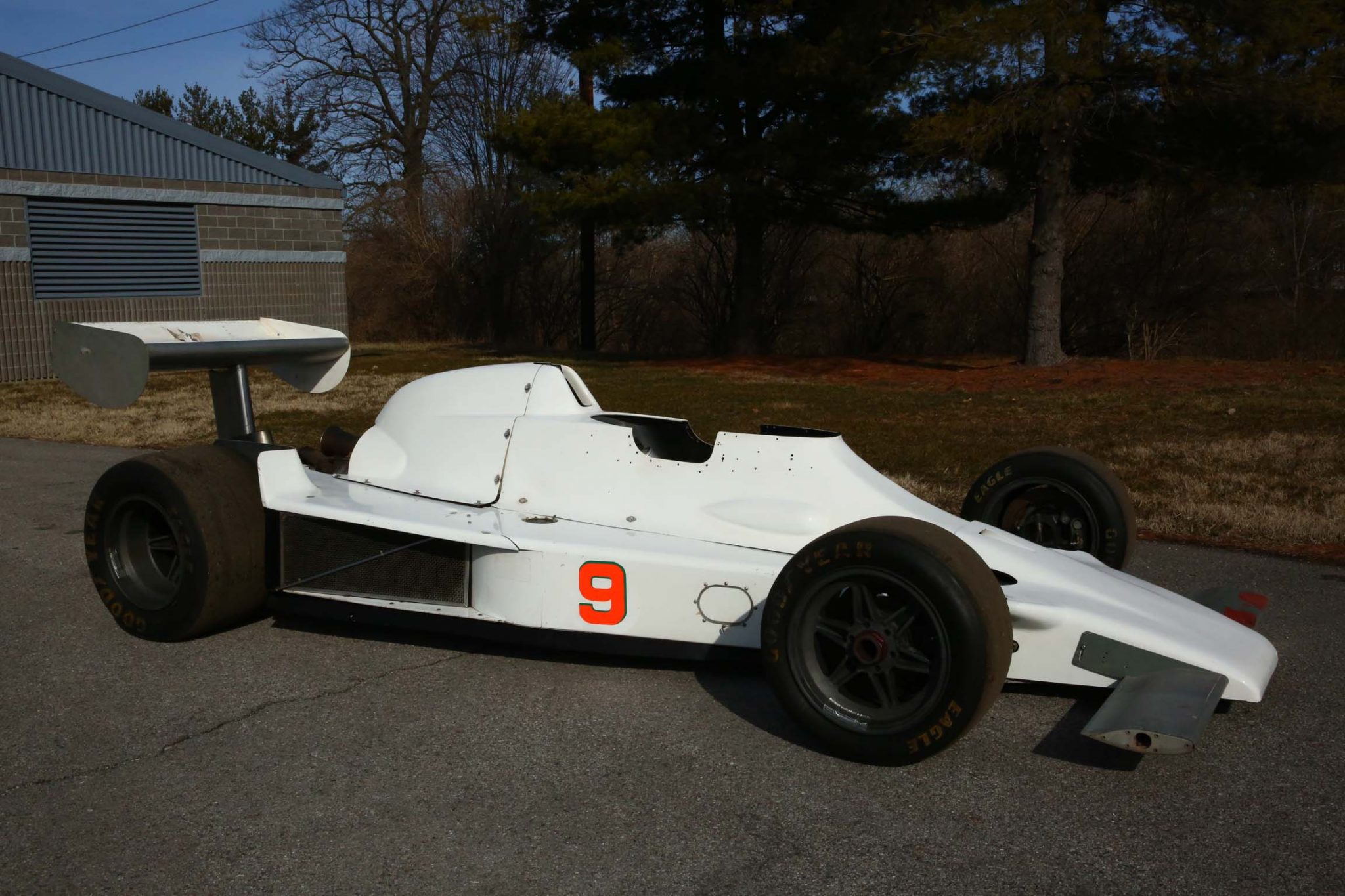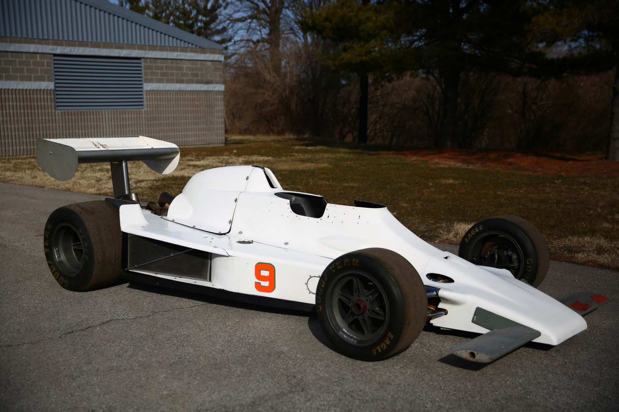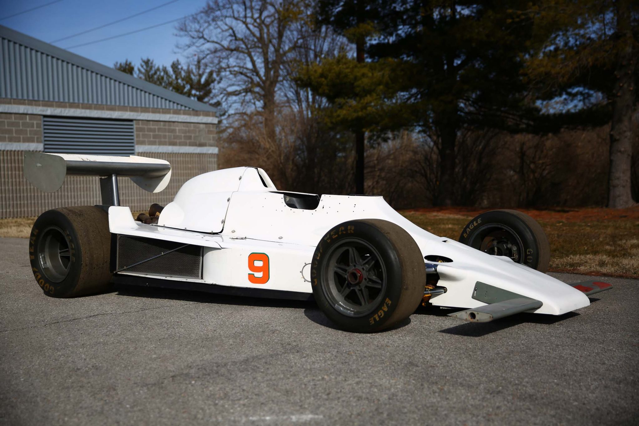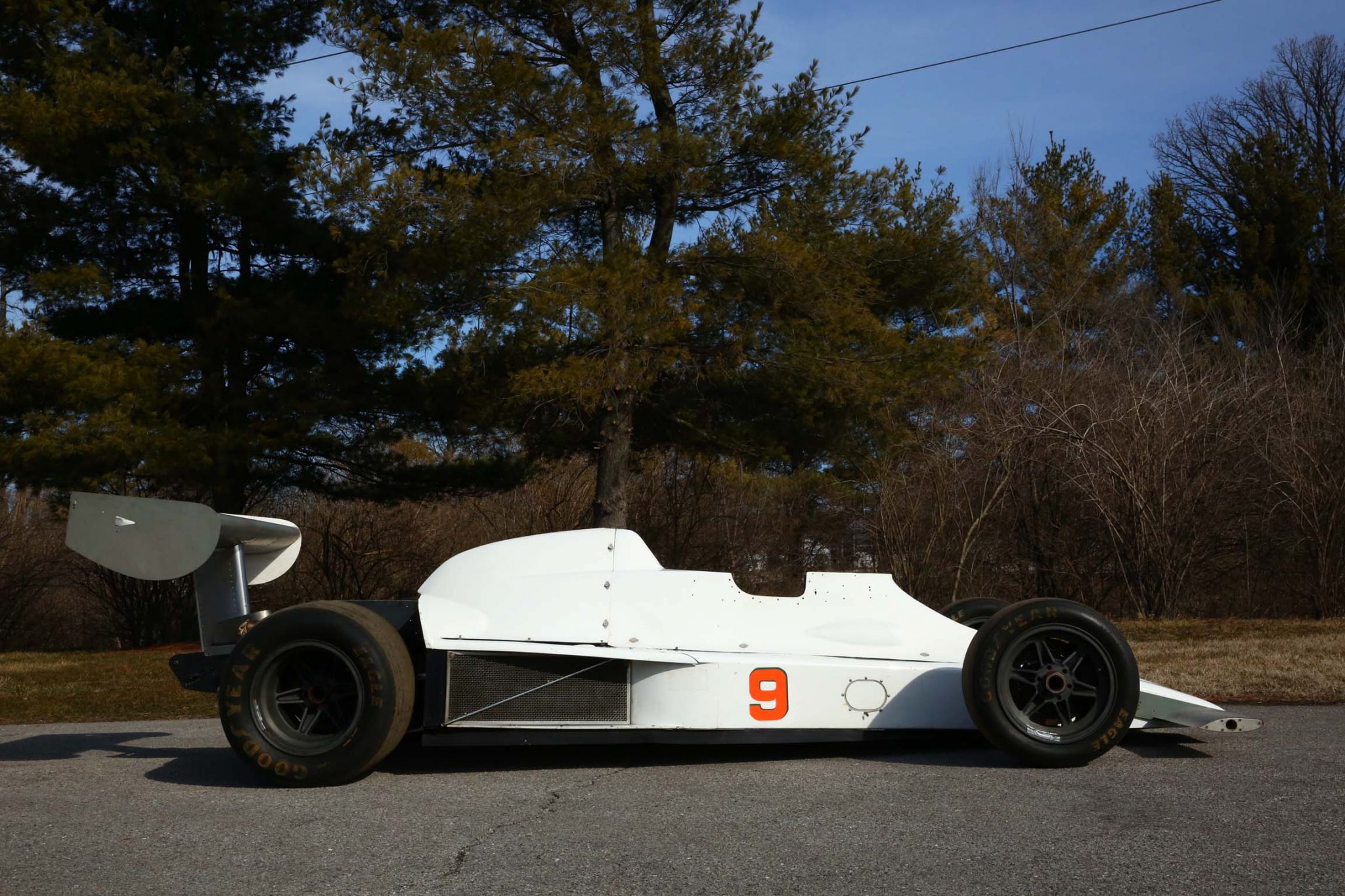 The six-spoke wheels feature center lock hubs and are mounted with 24×10.0-15 front and 27×14.5-15 rear Goodyear Eagle racing slicks. Braking is handled by Hurst/Airheart discs at all four corners.