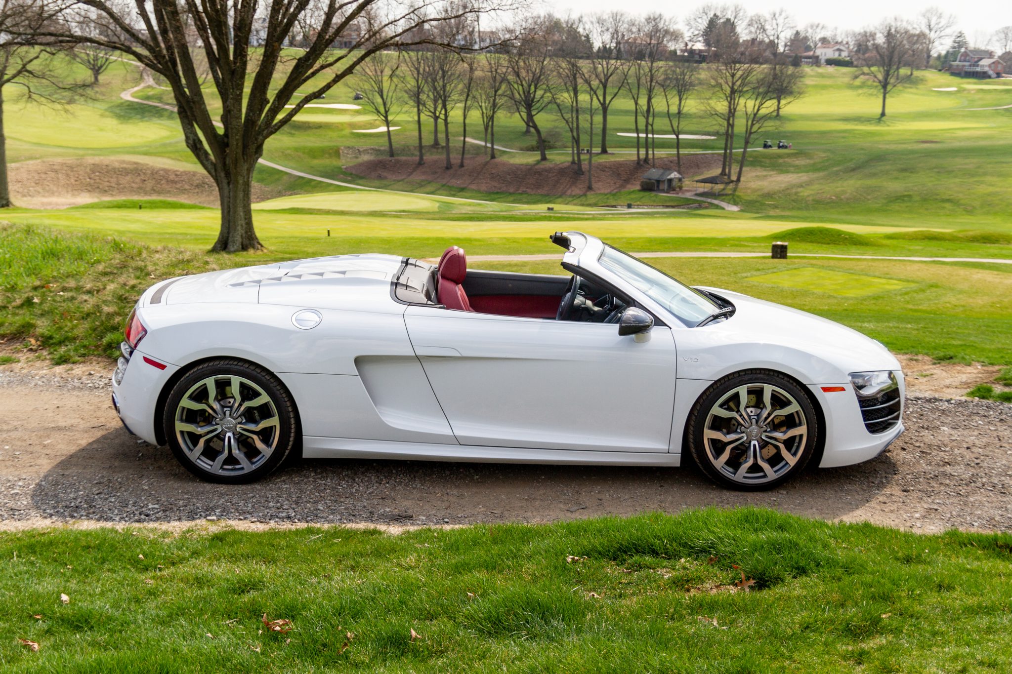 Polished 19″ Y-design alloy wheels are mounted with staggered-width Pirelli P Zero tires. The car features magnetic-ride suspension with active damping, and braking is handled by disc brakes with cross-drilled rotors at all four corners.