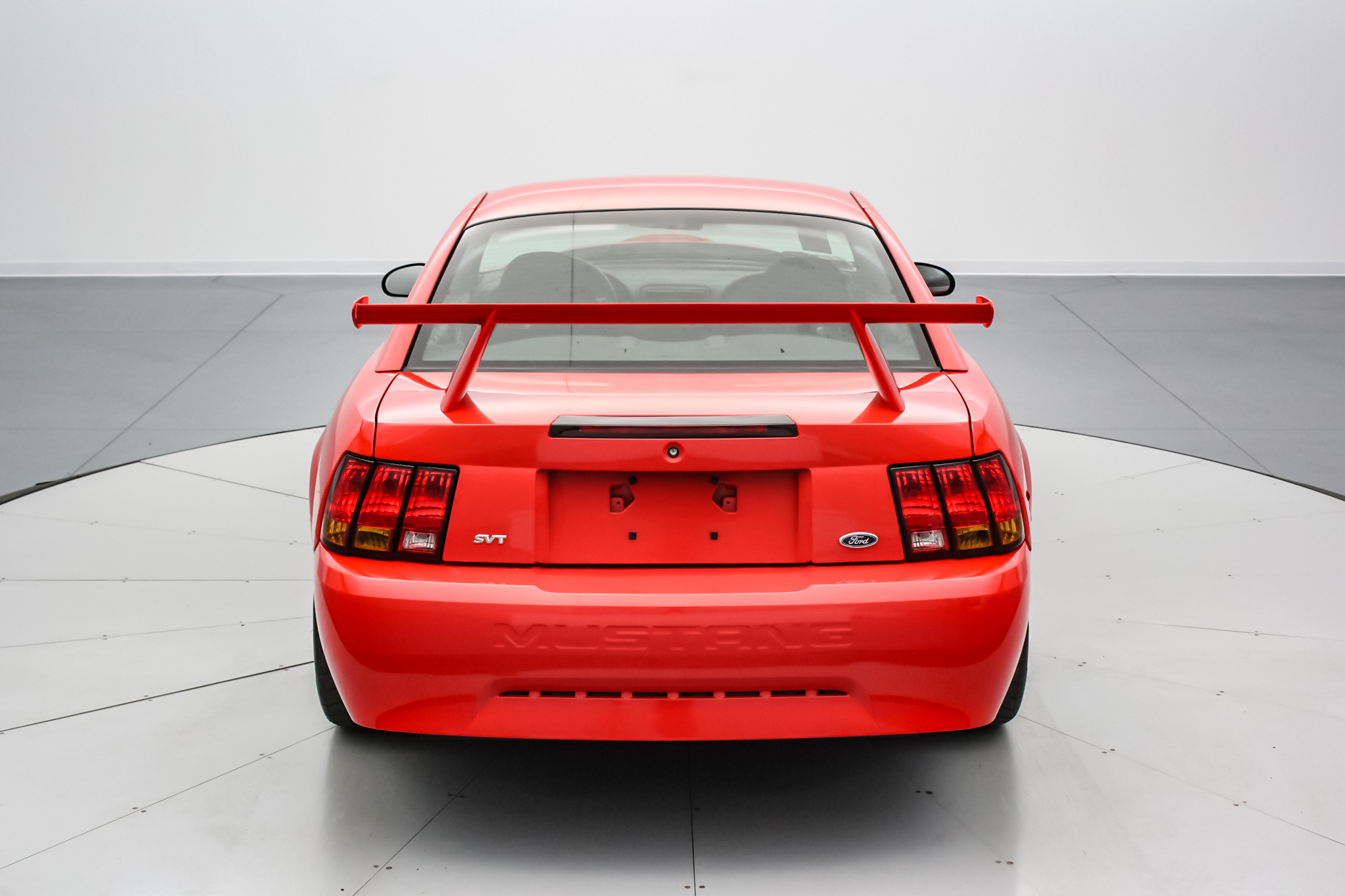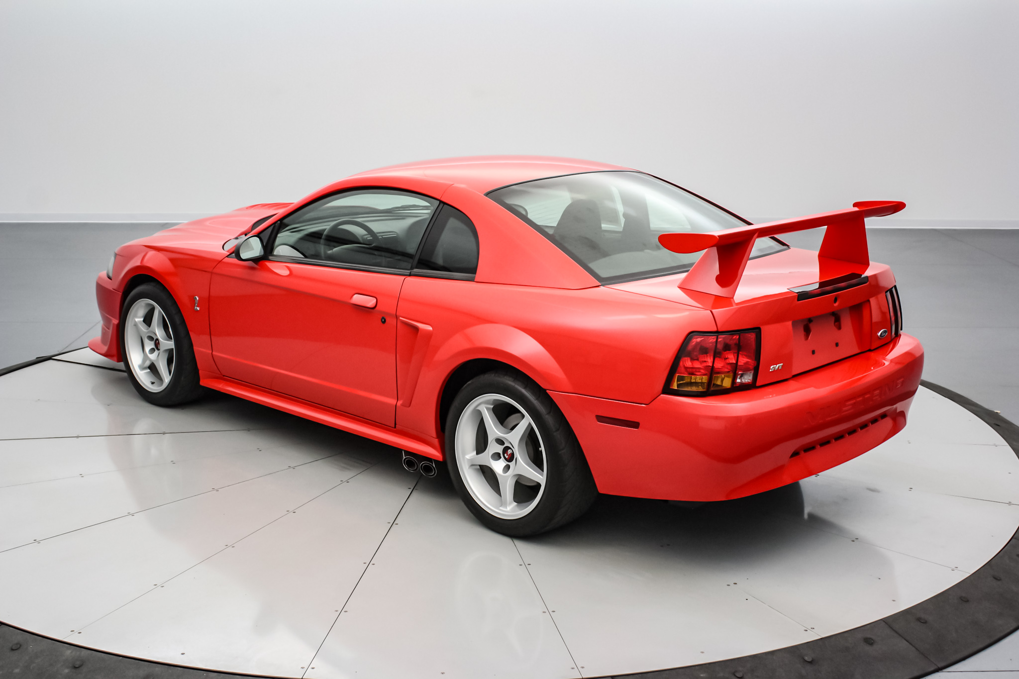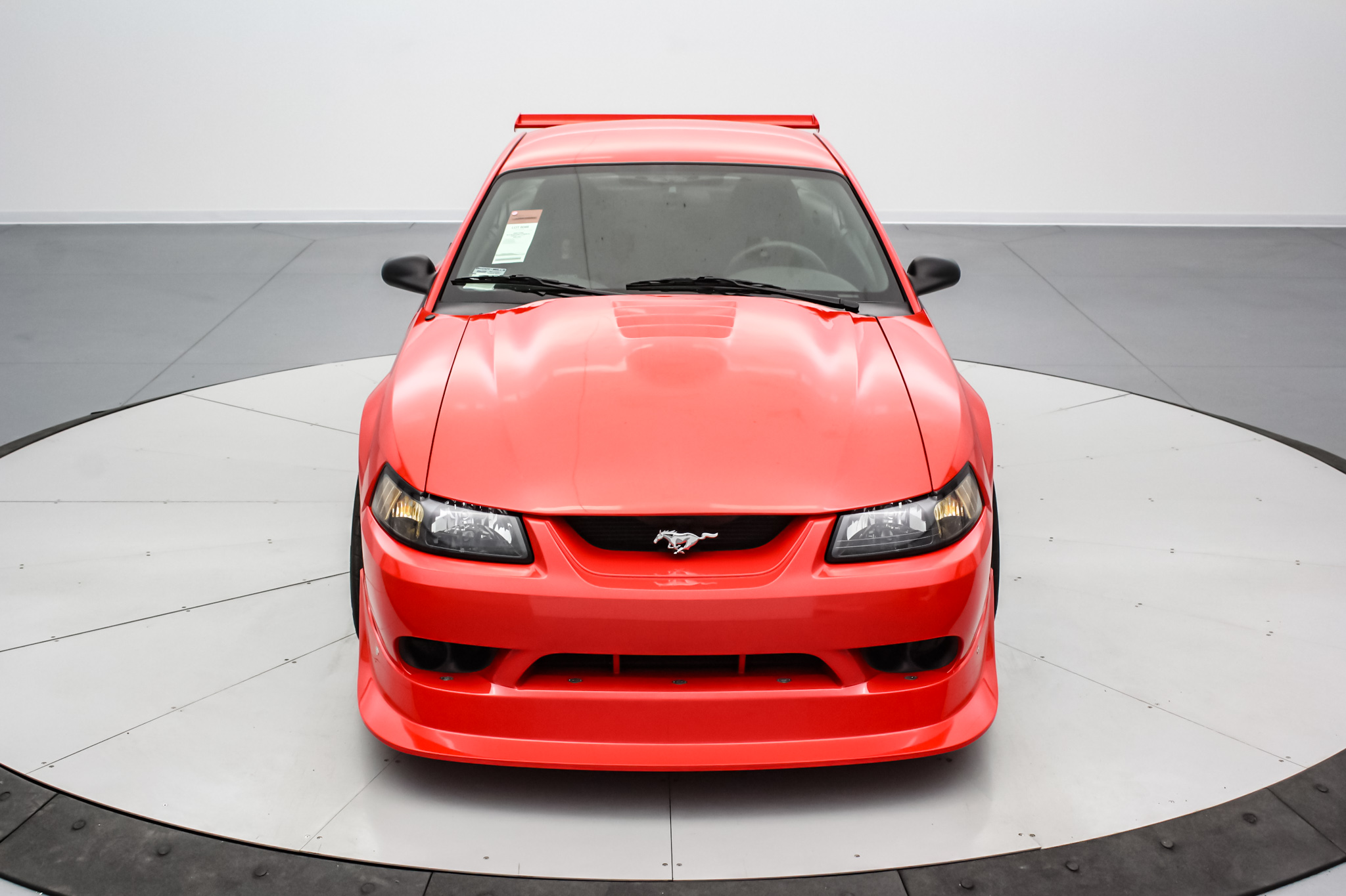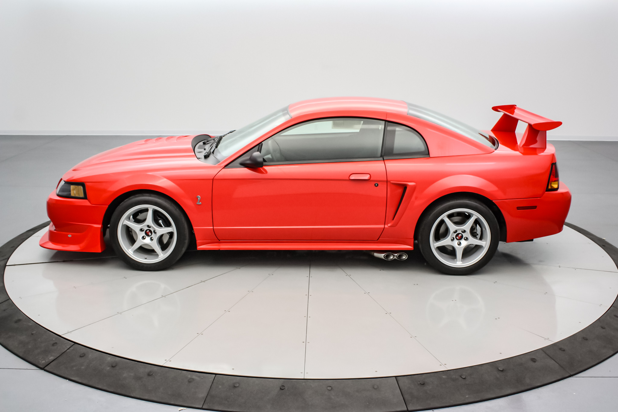 Factory 18″ five-spoke aluminum wheels are mounted with 265/40 BFGoodrich G-Force T/A KD tires, two of which bear 1999 and two 2006 date codes. Stopping power is provided by four-wheel ventilated discs with four-piston Brembo calipers and integrated cooling ducts at the front. The Cobra R package specified an independent rear suspension system along with stiffer Eibach springs, larger anti-roll bars, and Bilstein Monotube dampers.