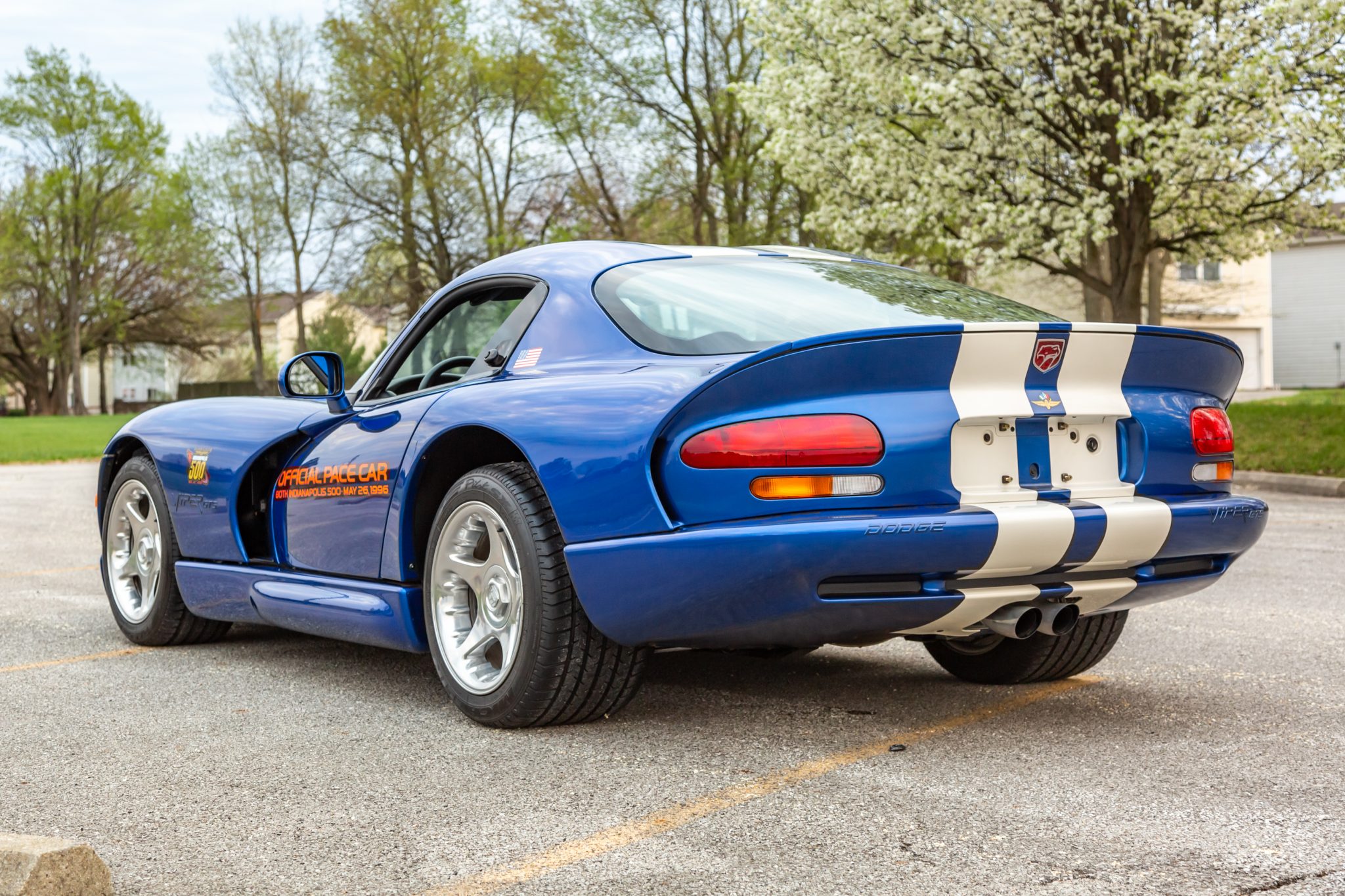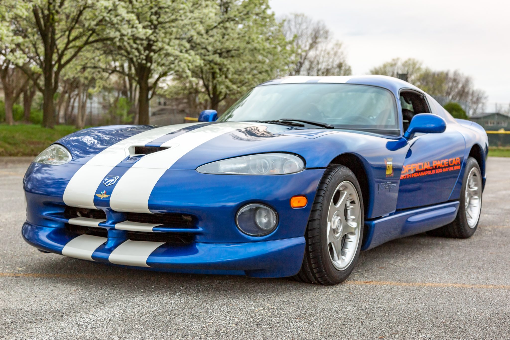 Factory chrome-finished 17″ five-spoke alloy wheels with faux-center-lock caps wear Michelin Pilot SX tires measuring 275/40 up front and 335/35 out back. Stopping power is provided by four-wheel ventilated discs with black Viper-branded front calipers.