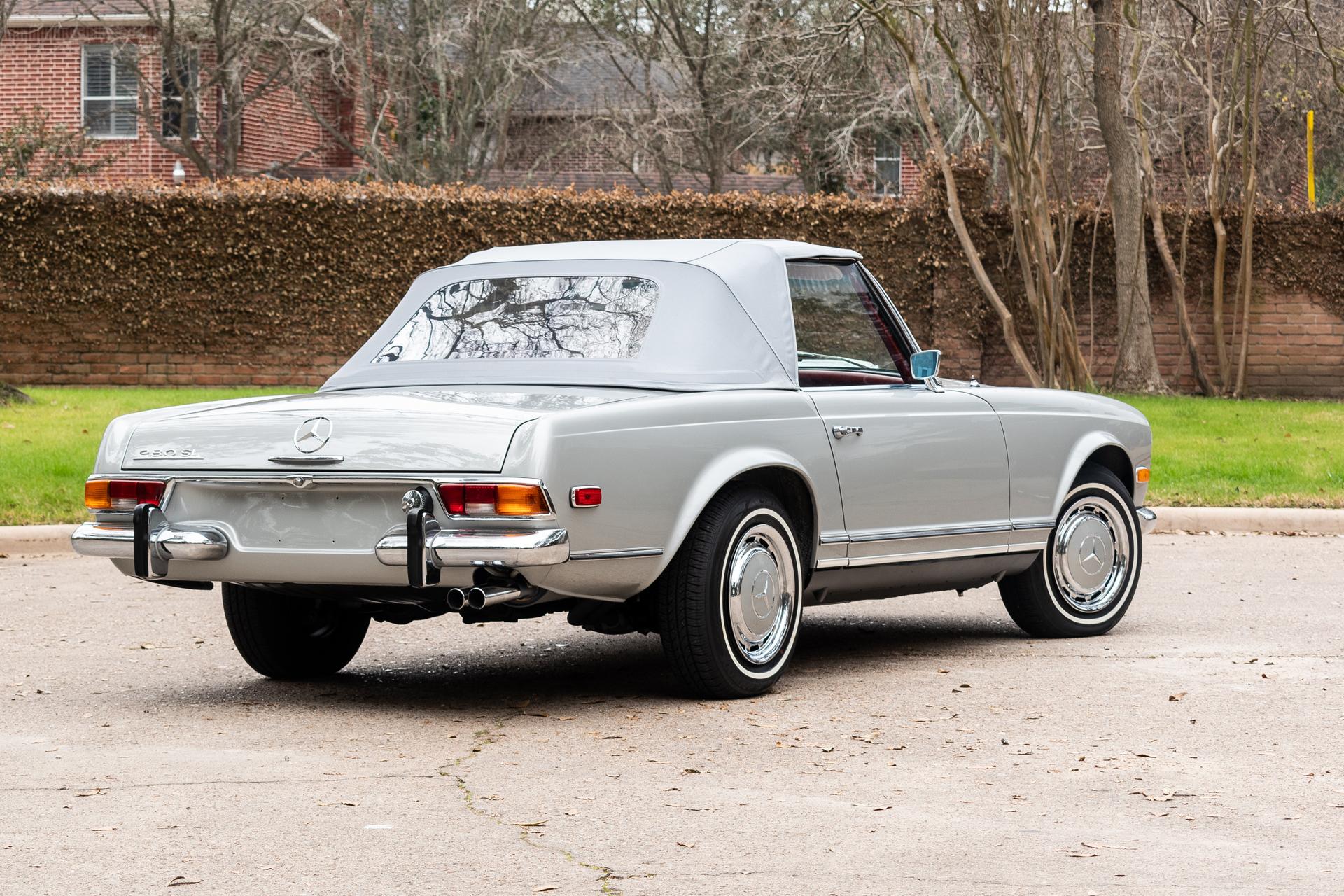 Originally fitted with a black soft top, the replacement gray top features a plastic rear window. The steel 14″ wheels wear color-matched covers and are mounted with Hankook Optimo whitewall tires. A full-size spare wheel is mounted under a cover in the trunk along with a tool kit and jack. The car is equipped with power-assisted steering, and braking is handled by discs and all four corners.