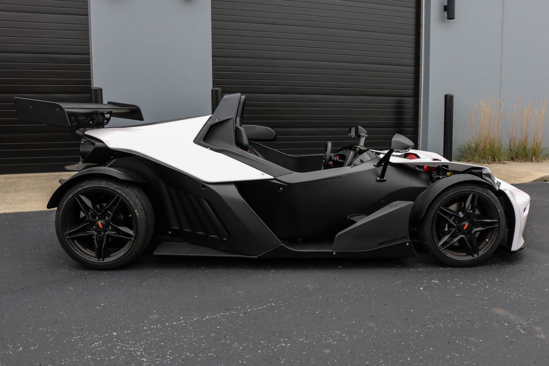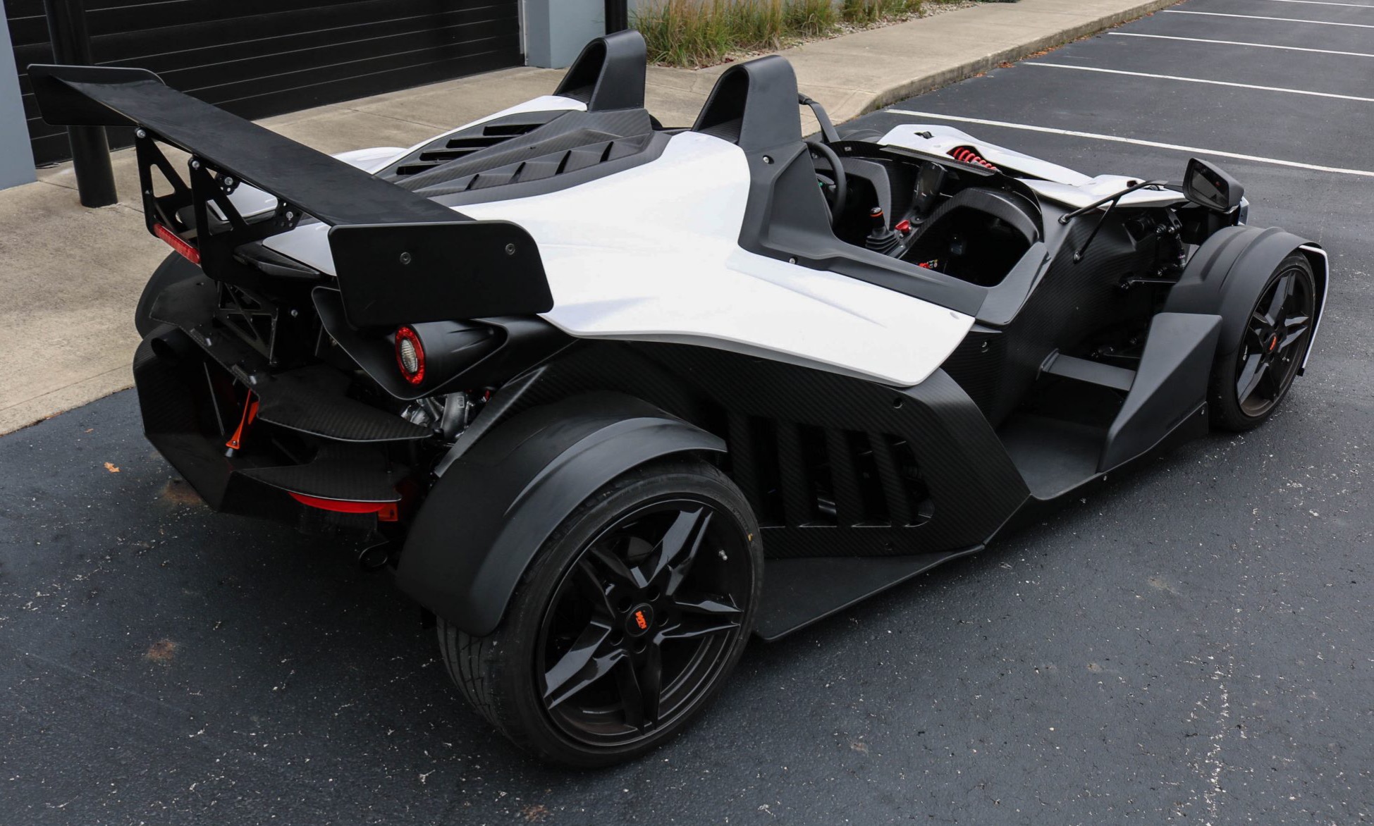 Black bolt-on wheels wear Firestone Firehawk street tires. An extra set of slicks is also included in the sale according to the selling dealer. Double-wishbone suspension from WP features exposed, pushrod-actuated piggyback shocks up front. Brembo brakes consist of four-piston front and two-piston rear calipers, all with slotted and internally-ventilated discs.