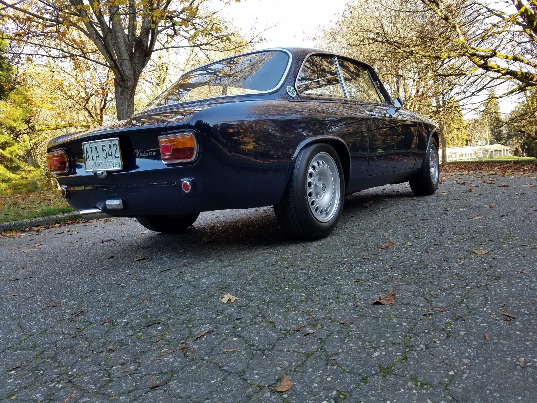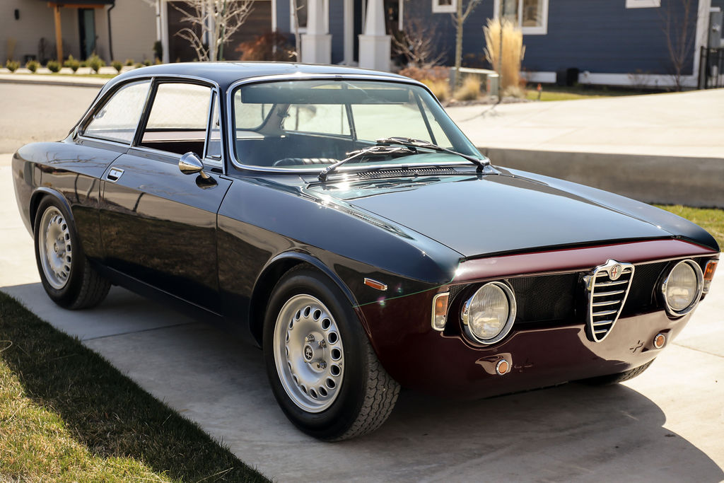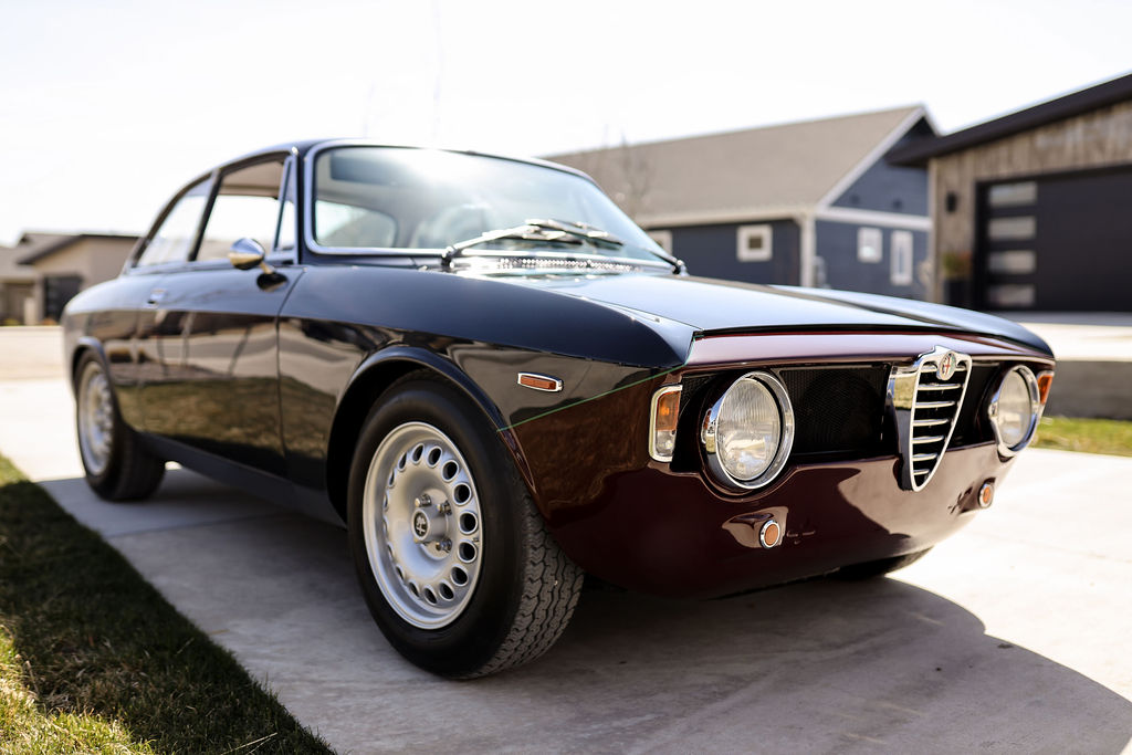 Alfaholics GTA wheels have replaced the previous Panasports and wear 185/70R15 Vredestein Sprint Classic tires. An Alfaholics Fast Road suspension kit fitted in 2009 includes adjustable yellow Koni dampers and H&R springs on lightened pans as well as a front sway bar. A Girling dual-circuit master cylinder setup from Alfaholics has also been installed along with a BMW fluid reservoir. The brake calipers have been rebuilt and new steel lines fitted according to the seller.