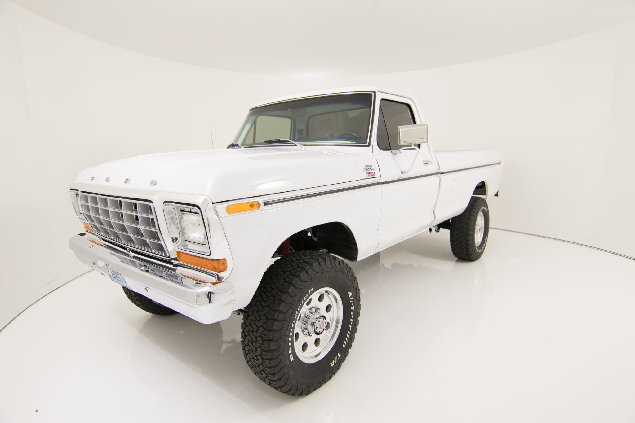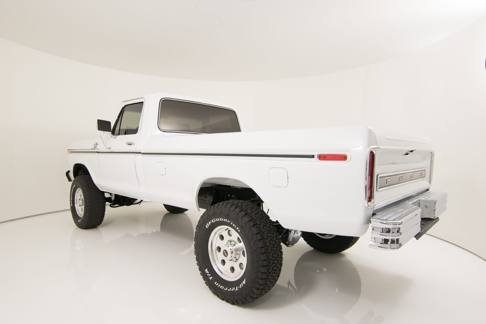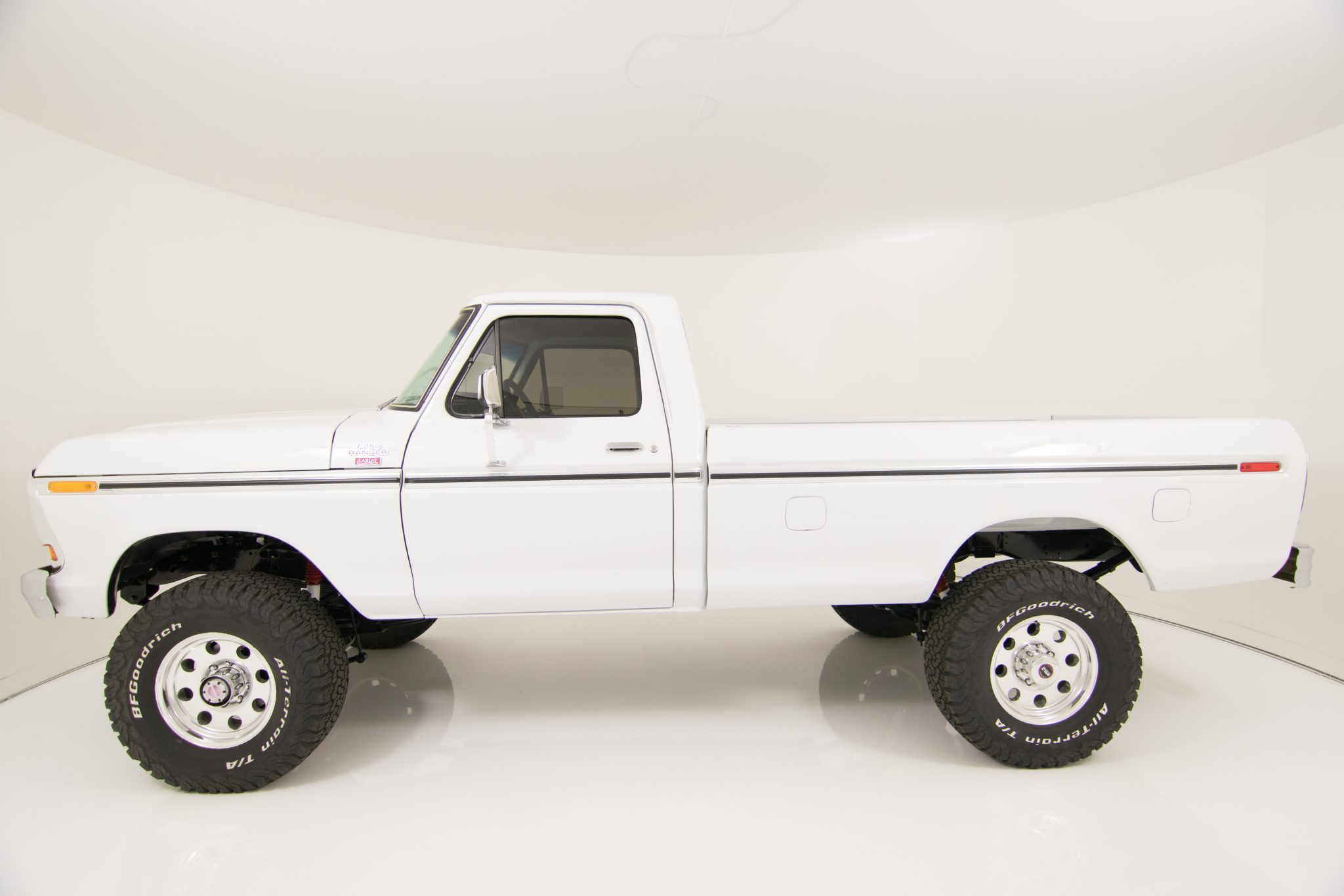 Polished 17″ wheels wear Weld Racing center caps and 35×12.5″ BFGoodrich All-Terrain T/A KO2 tires. The truck is equipped with a lifted suspension, Rancho RS5000X shocks, aftermarket steering stabilizers, and manually locking front wheel hubs.