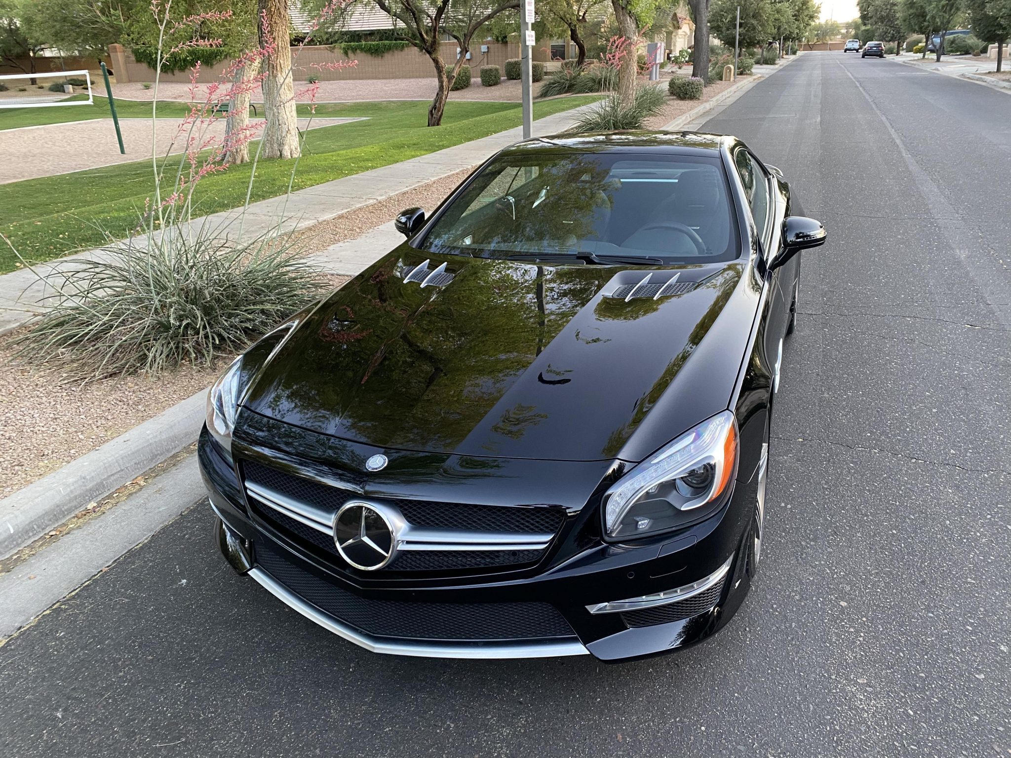 Five-spoke 19″ AMG wheels are mounted with 255/35 front and 285/30 rear Michelin Pilot Super Sport tires wearing 2020 and 2021 date codes. The SL63 is equipped with Active Body Control suspension and electromechanical power steering, and braking is from red AMG-branded calipers with cross-drilled and slotted rotors.
