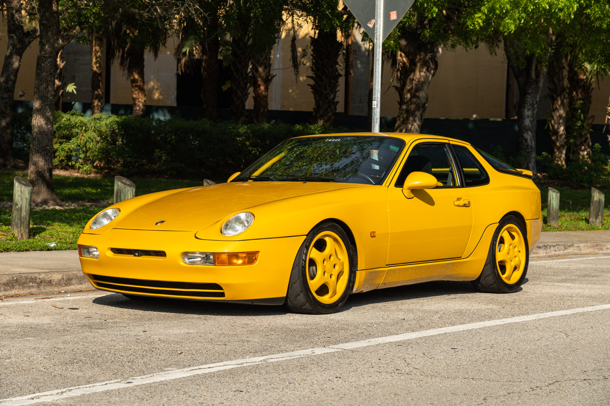 Staggered-width 17″ Cup wheels are finished to match the body and wrapped in Toyo Proxes R888R tires. The Clubsport model featured stiffer suspension with a 20mm-lower ride height when compared with the standard 968, and this example is equipped with cross-drilled rotors and Porsche-script black-finished calipers at each corner.