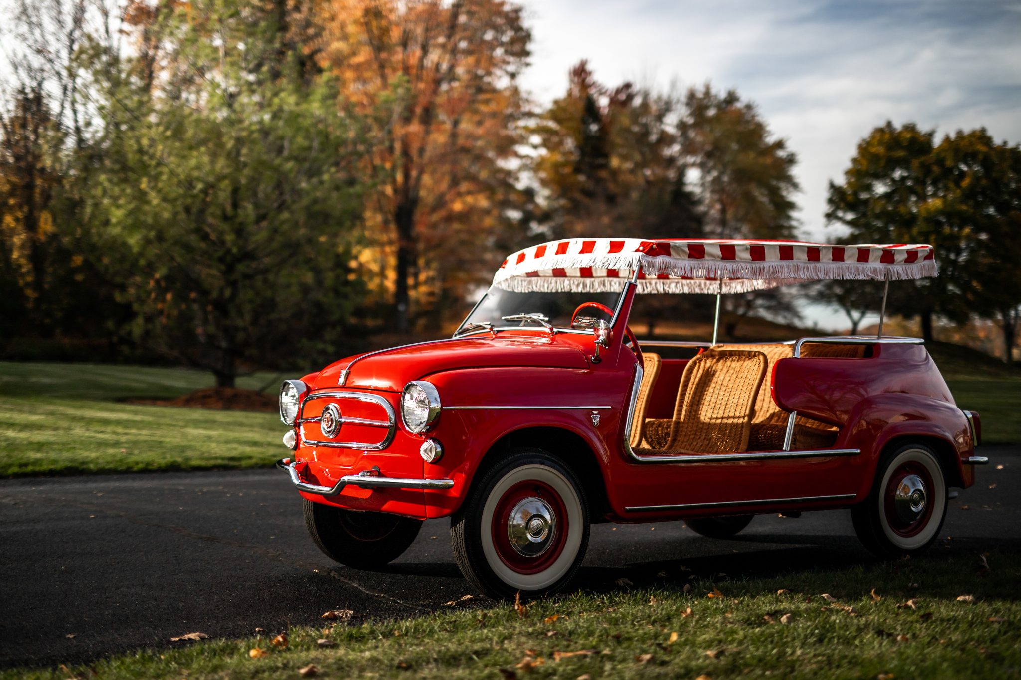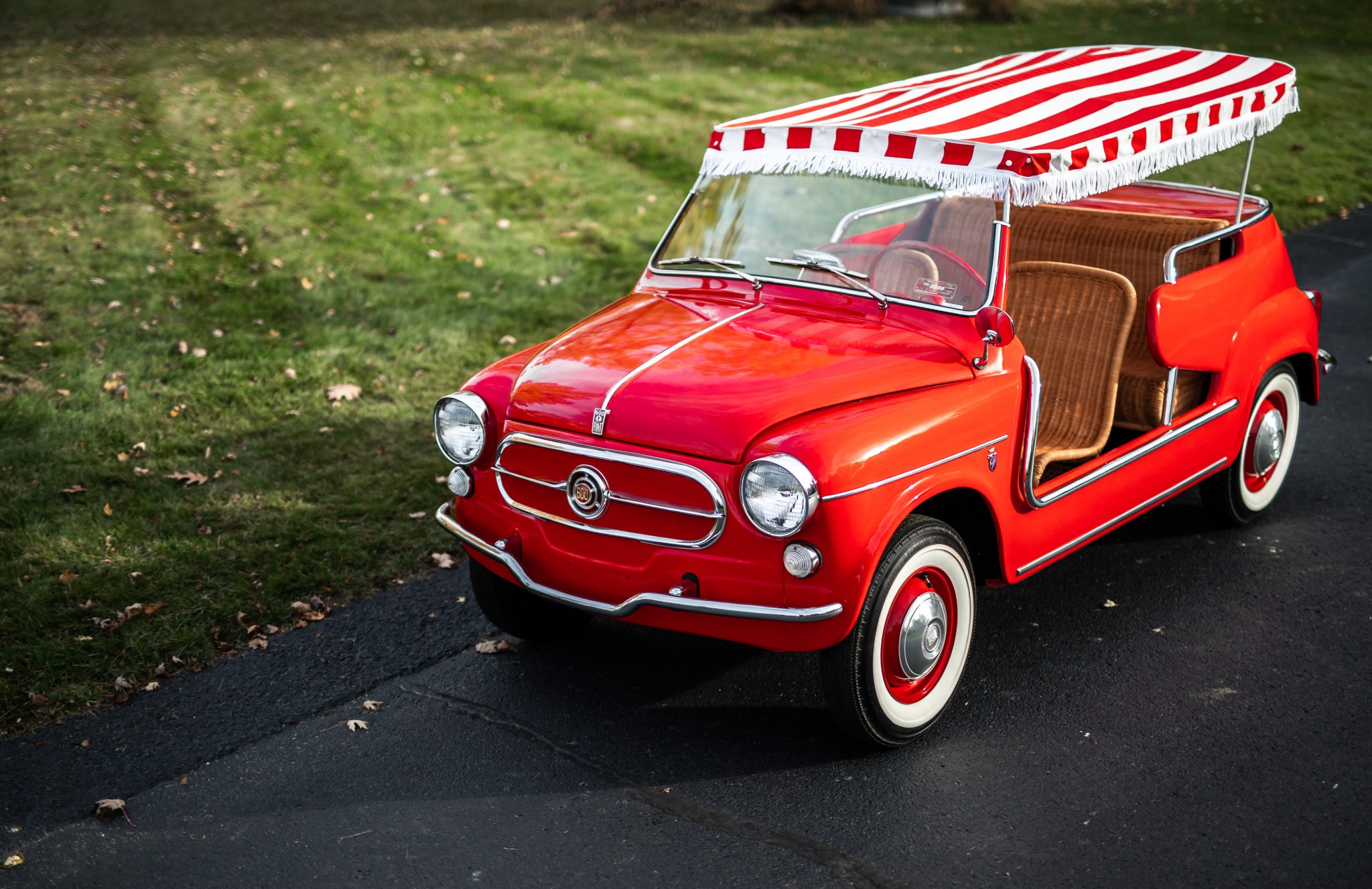 Red-painted 12″ steel wheels feature Fiat-script chrome covers and are mounted with whitewall BFGoodrich Silvertown tires. Braking is handled by drums at all four corners.