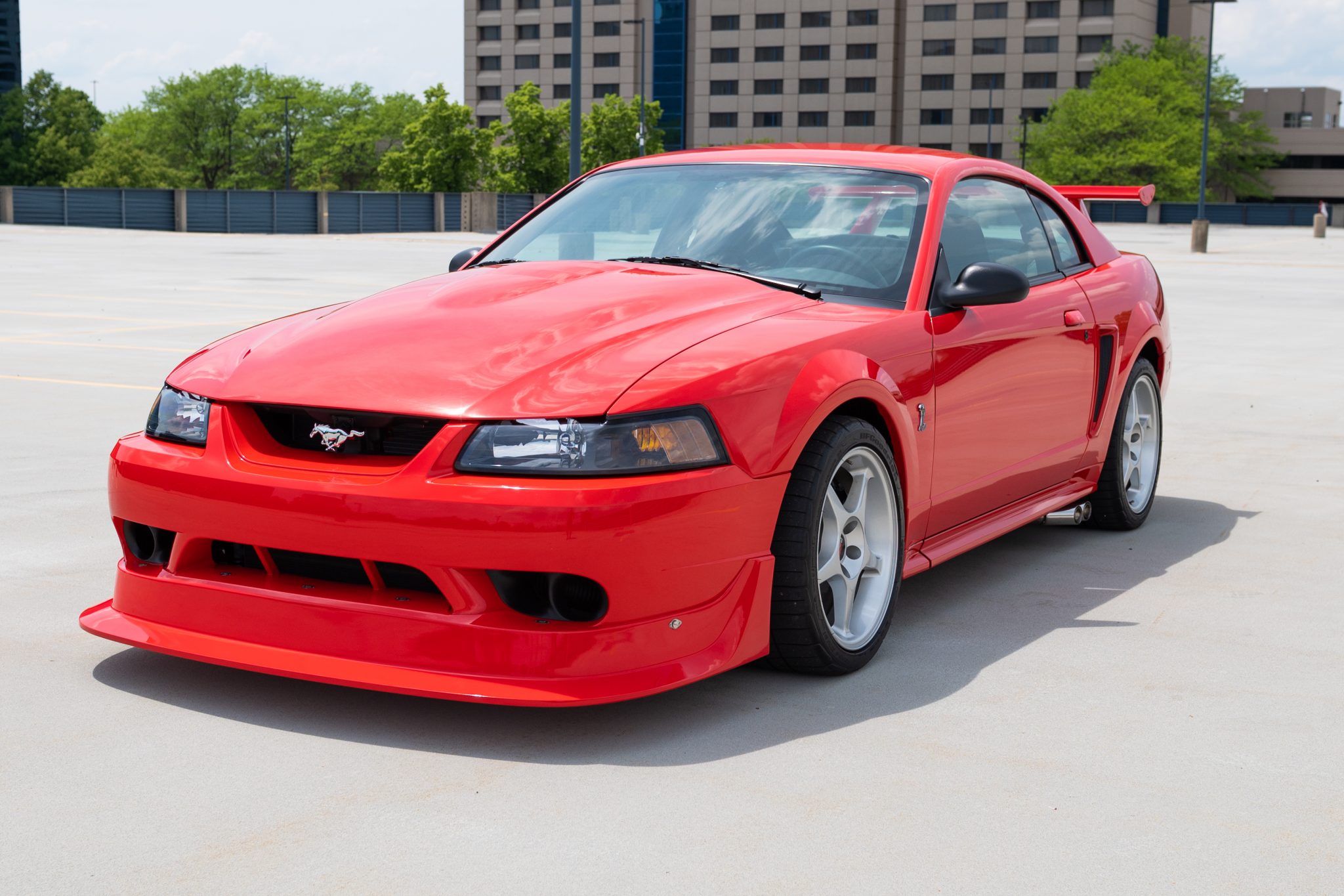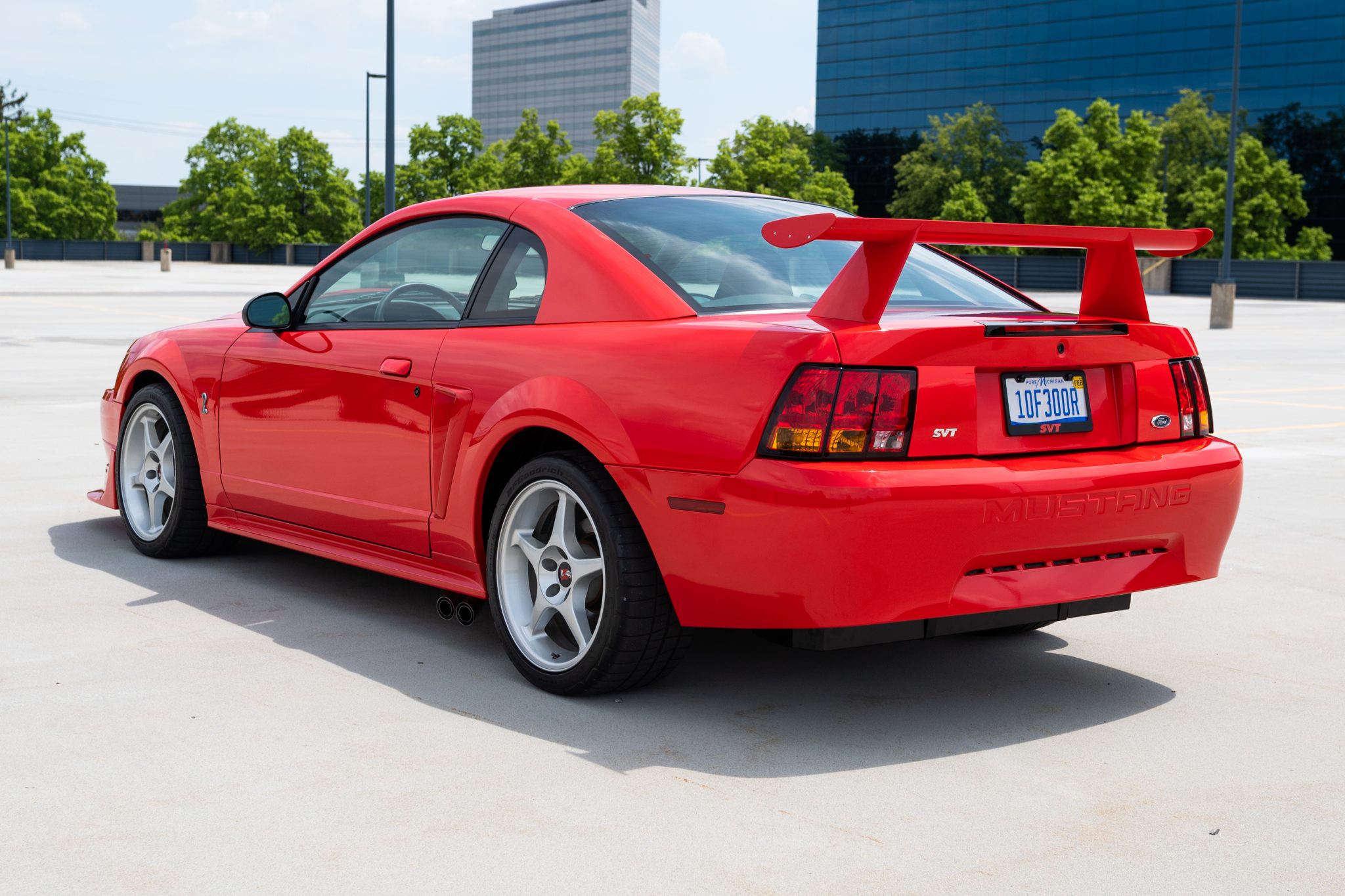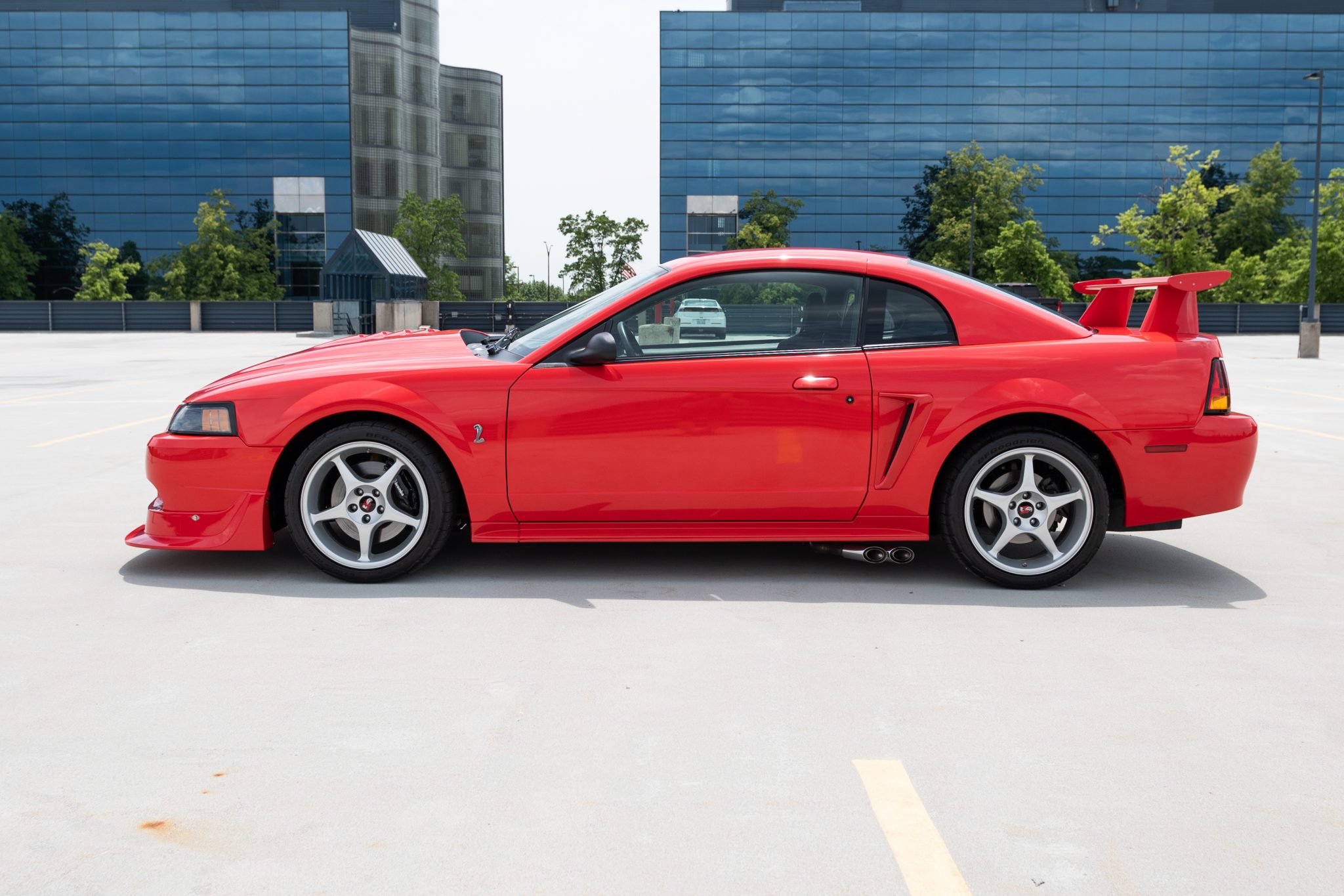 Silver 18″ five-spoke aluminum wheels are mounted with 275/35 BFGoodrich G-Force Rival tires. Braking is handled by four-wheel ventilated discs paired with front Brembo four-piston calipers, and integrated brake cooling ducts are fitted at the front. The Cobra R package specified an independent rear suspension system along with stiffer Eibach springs, larger anti-roll bars, and Bilstein Monotube dampers.