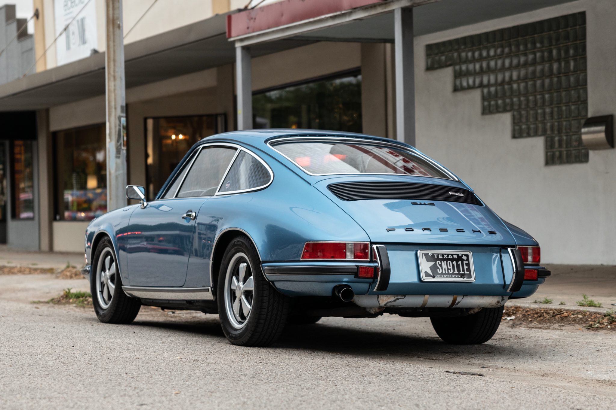 15″ Fuchs wheels with polished paddles and black pockets wear Michelin tires, and a matching spare wheel mounted with a Dunlop tire is stored beneath the floor of the front trunk.