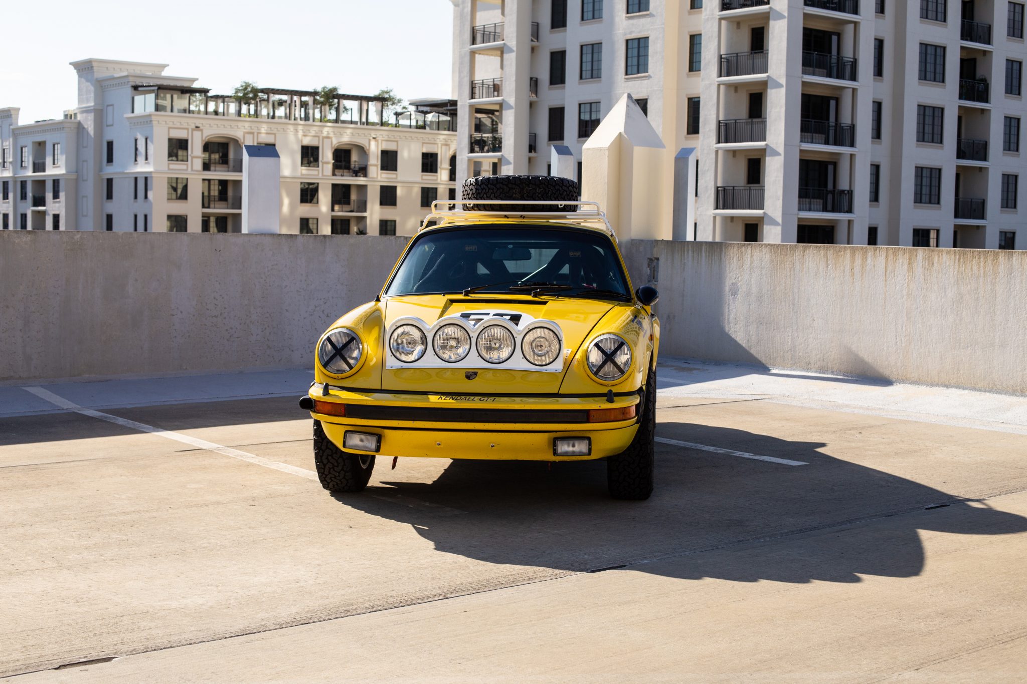 The 16×7″ Fuchs wheels are finished in white and are mounted with BFGoodrich All-Terrain T/A tires. A matching spare is mounted on the roof rack. The suspension has been modified in the style of East African Safari 911s and features Elephant Racing bushings and components. Braking is handled by discs at all four corners.