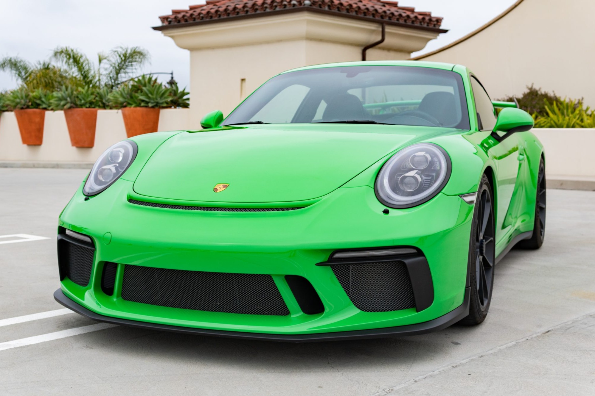 Satin black-finished 20″ centerlock wheels are wrapped in 245/35 front and 305/30 rear Michelin Pilot Sport Cup 2 tires. The car is optioned with a front-axle lift system and Porsche Ceramic Composite brakes, and standard GT3 equipment includes Porsche Active Suspension Management, Porsche Torque Vectoring Plus, and rear-axle steering.