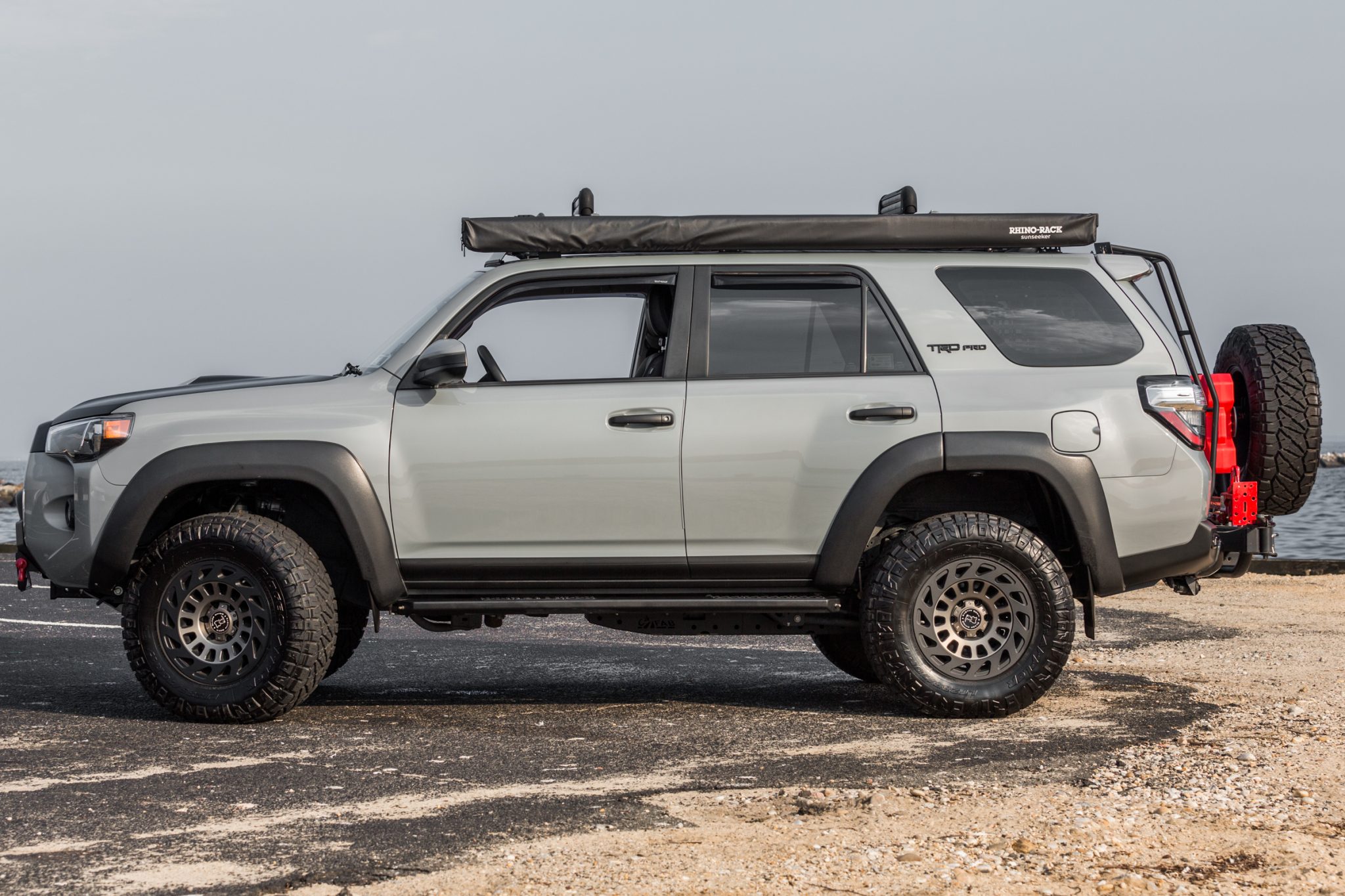 Aftermarket Black Rhino wheels are wrapped in 285/70 Nitto Ridge Grappler tires. A matching spare wheel and tire are mounted to a swing-away carrier, and modifications include wheel well LED lighting, ARB fill valves installed in the rock sliders, Air Lift rear suspension components, Old Man Emu reservoir-style shocks, and a C4 Fabrication underside skid plate.