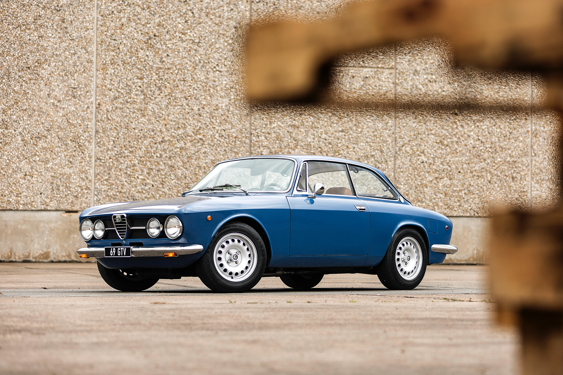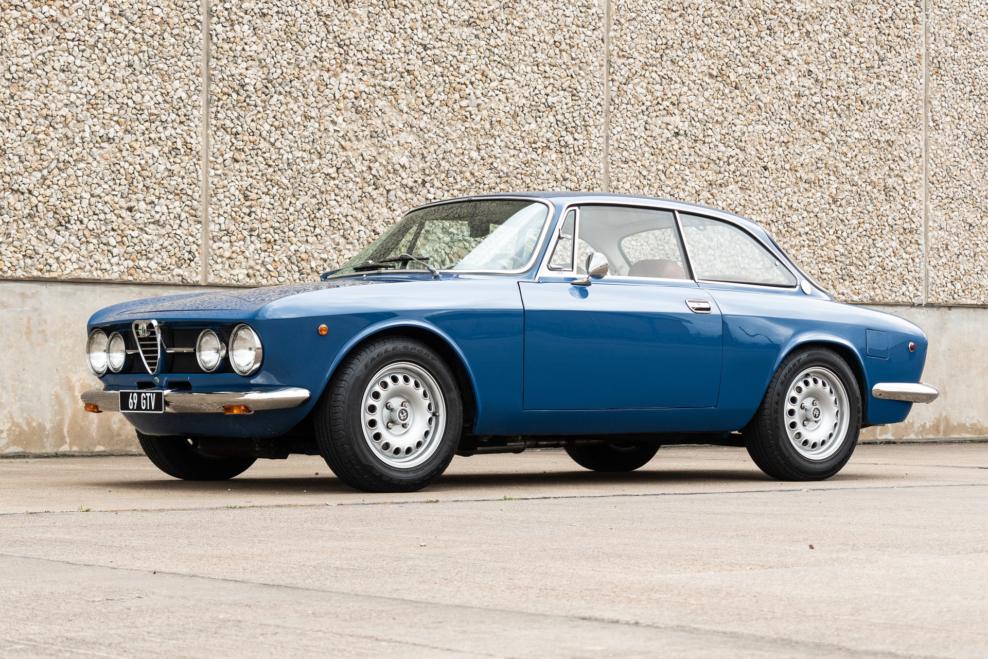 15” GTA-style wheels wear 195/65 Goodyear Eagle Sport tires showing 2015 date codes. The suspension is fitted with Koni shocks and Alfaholics springs, and the braking system features a dual-circuit master cylinder and booster. During the refurbishment, reinforcing plates were reportedly welded into the front cross member, sway bar mounts, steering box, and rear shock towers. The engine bay and transmission tunnel are also said to have been reinforced.