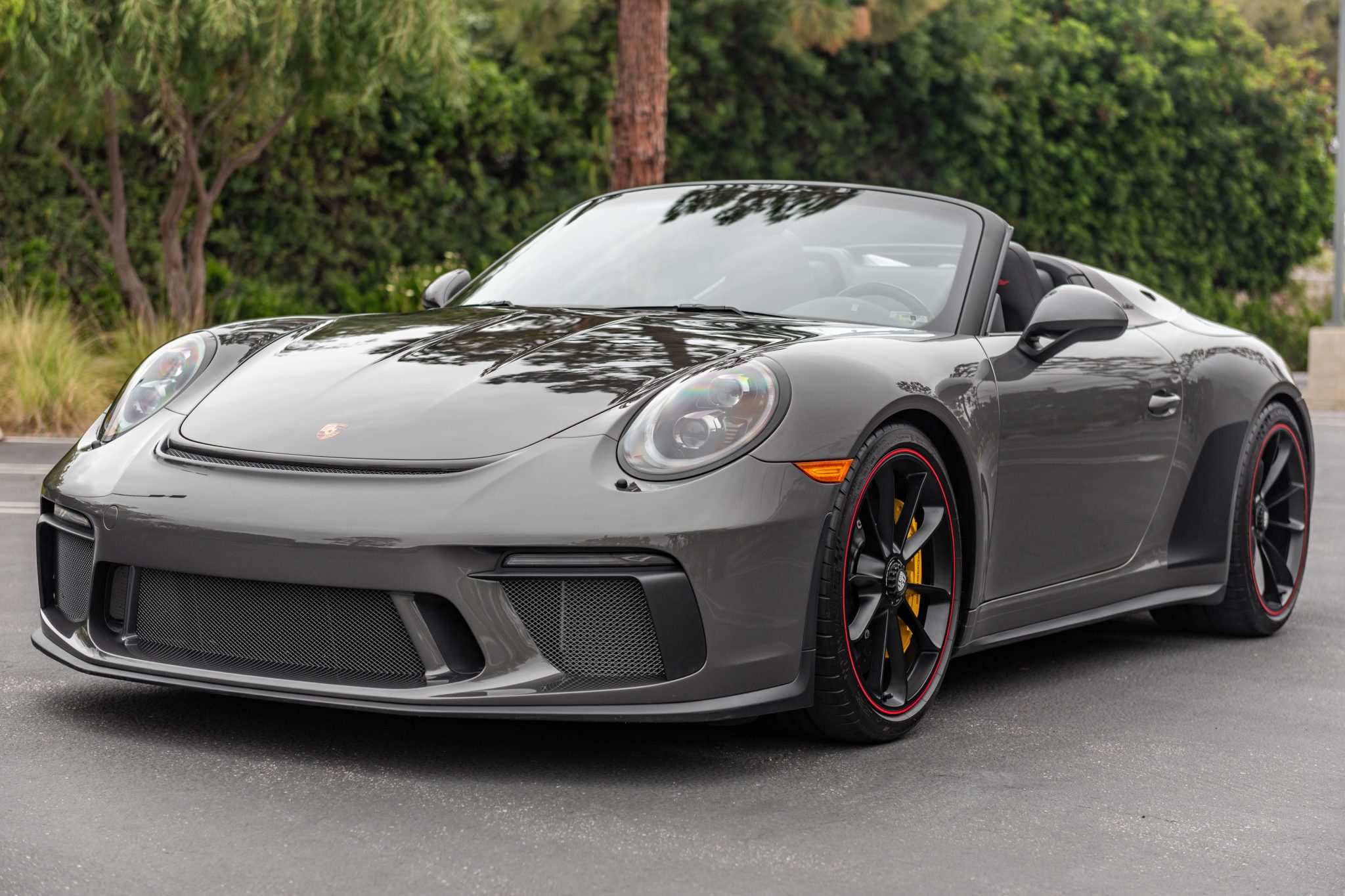 Black 20″ center-locking wheels are finished in satin black with Guards Red stripes on their outer lips, and they are mounted with 245/35 front and 305/30 rear Michelin Pilot Sport Cup 2 tires. Braking is provided by yellow six- and four-piston calipers paired with carbon-ceramic rotors, and the car is also equipped with a front-axle-lift system.
