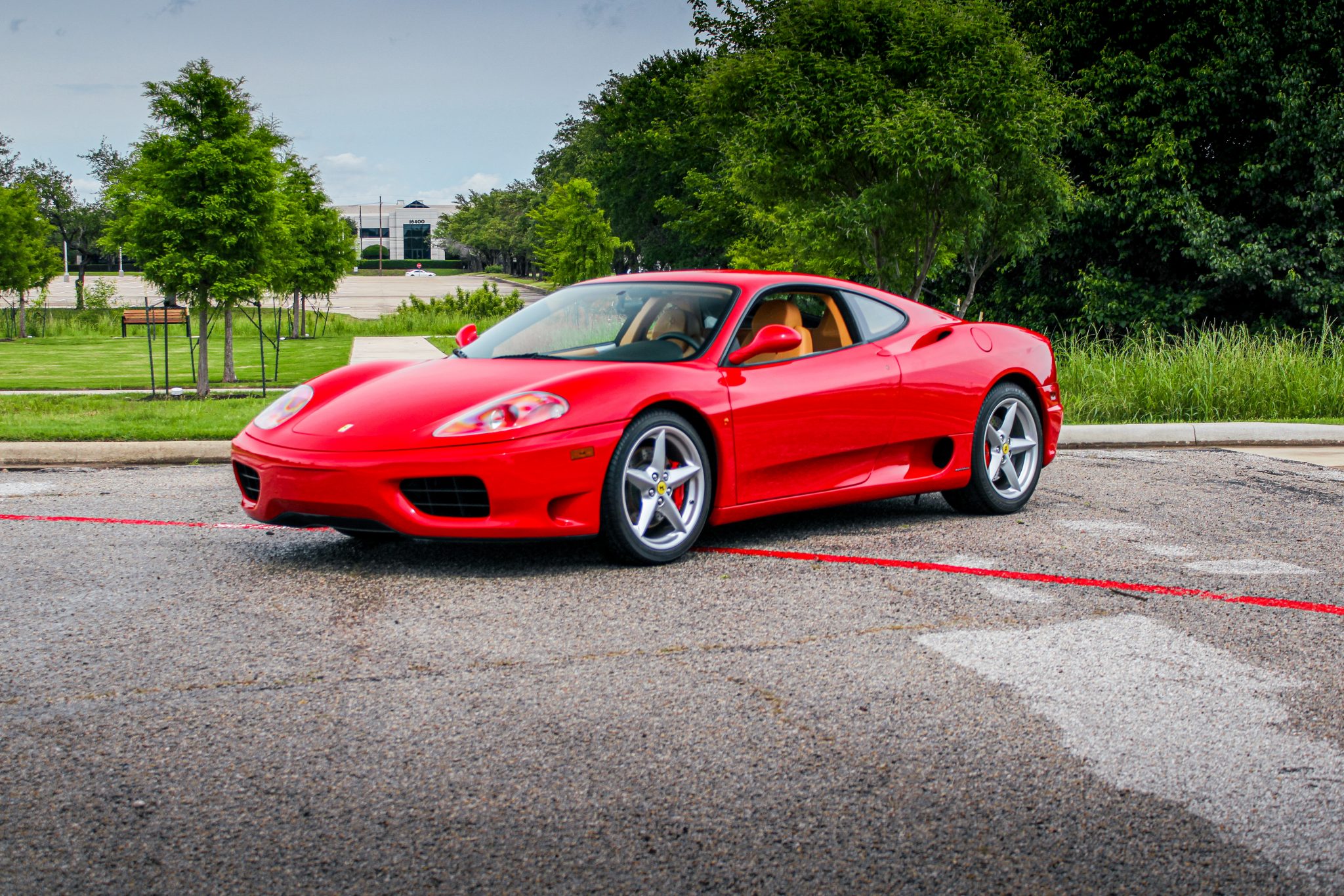 Five-spoke 18″ alloy wheels wear yellow Ferrari center caps and are wrapped in Bridgestone Potenza S-02A tires measuring 215/45 up front and 275/40 out back. Red four-piston brake calipers are paired with cross-drilled rotors at each corner.