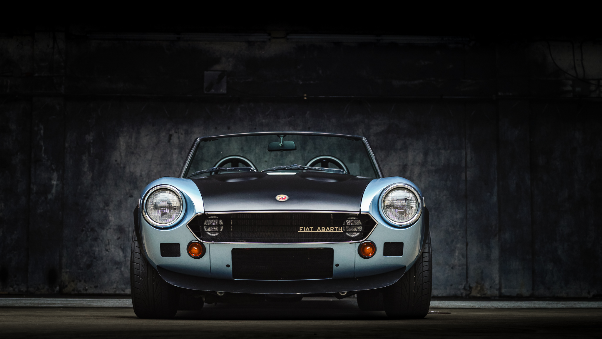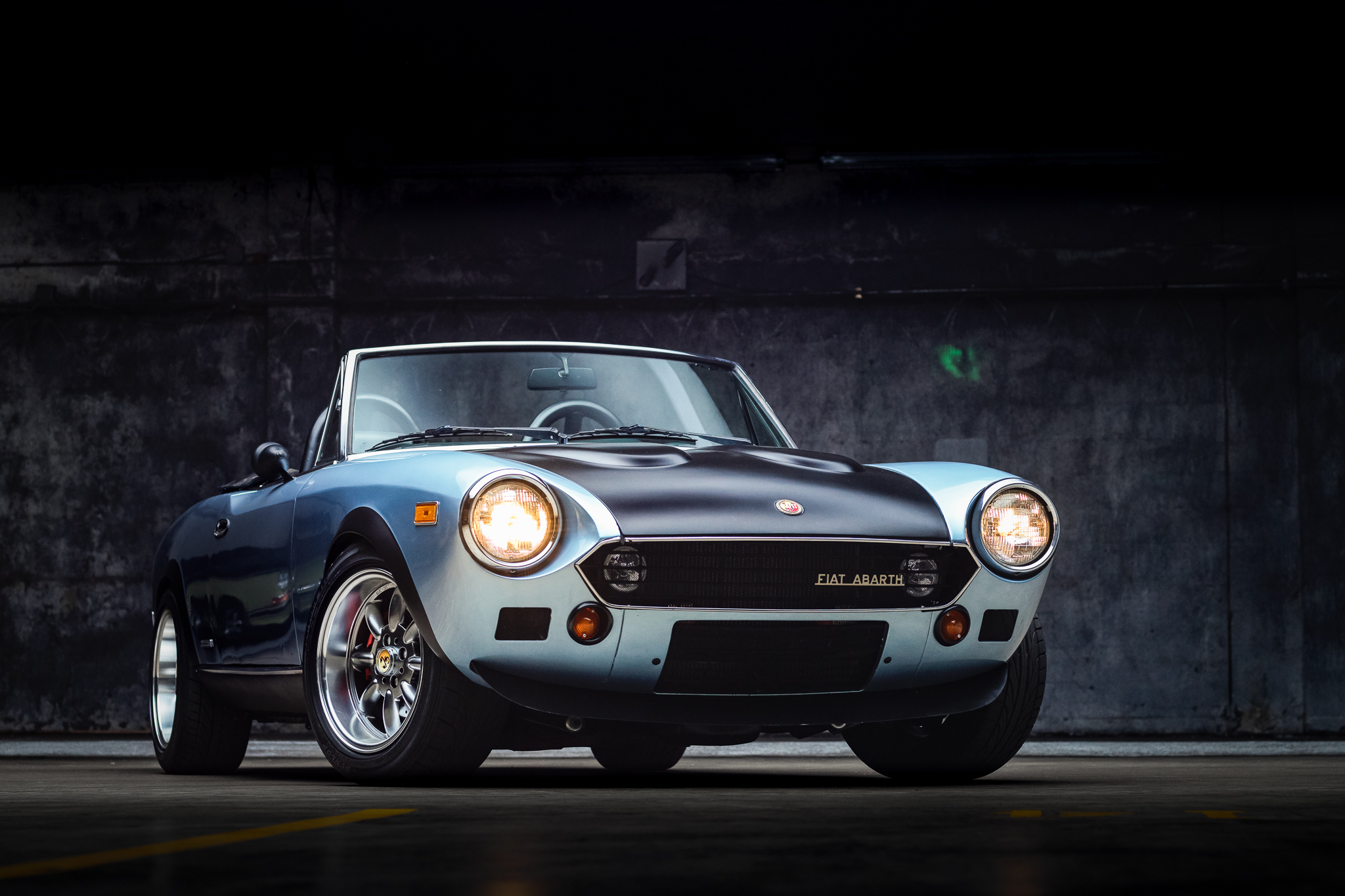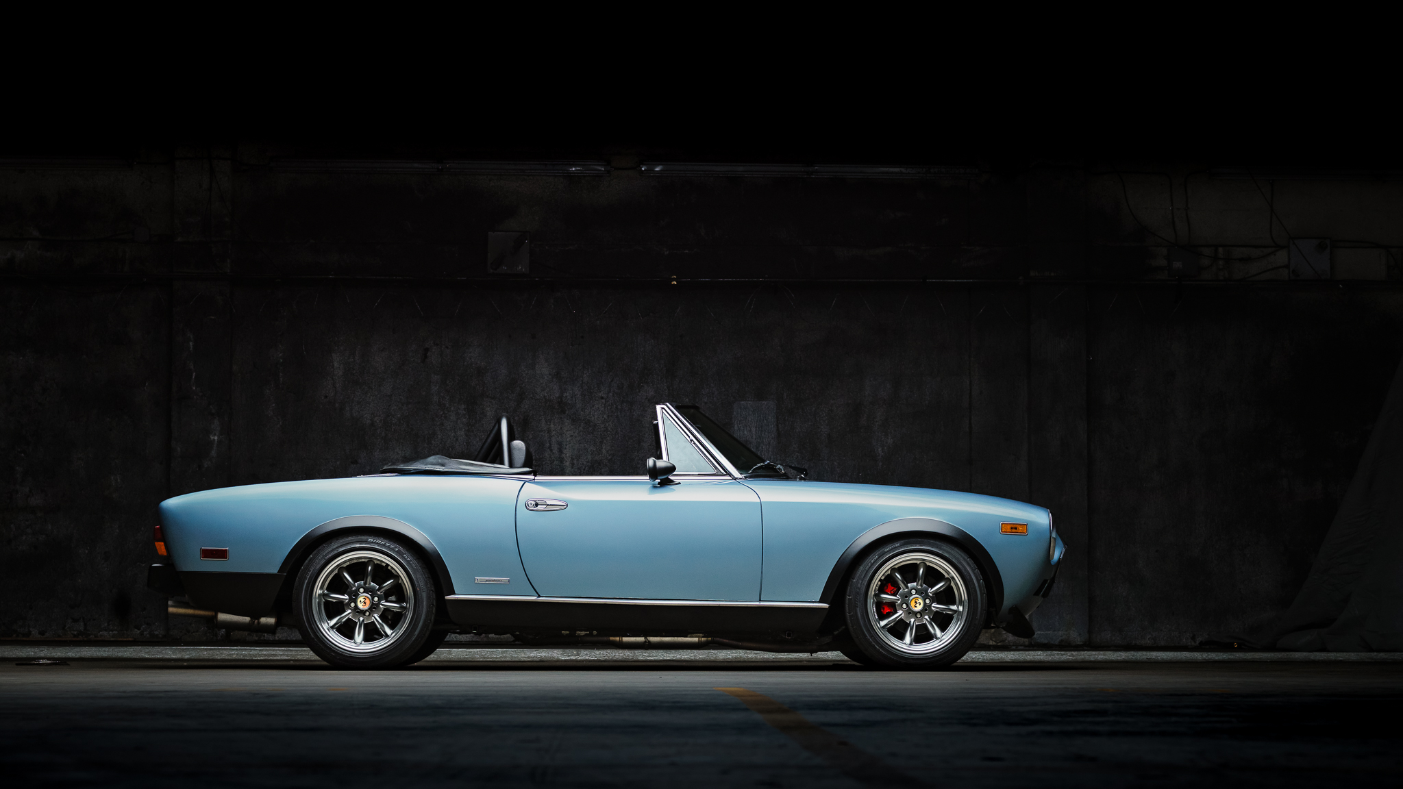 Aftermarket 15″ Panasport-style wheels measure 7.5″ wide and are wrapped in 205/50 Dunlop Direzza DZ101 tires. The suspension is fitted with Koni shocks and springs. Larger front brakes from a modern Fiat 500 have been added along with rear discs in place of the factory drums.