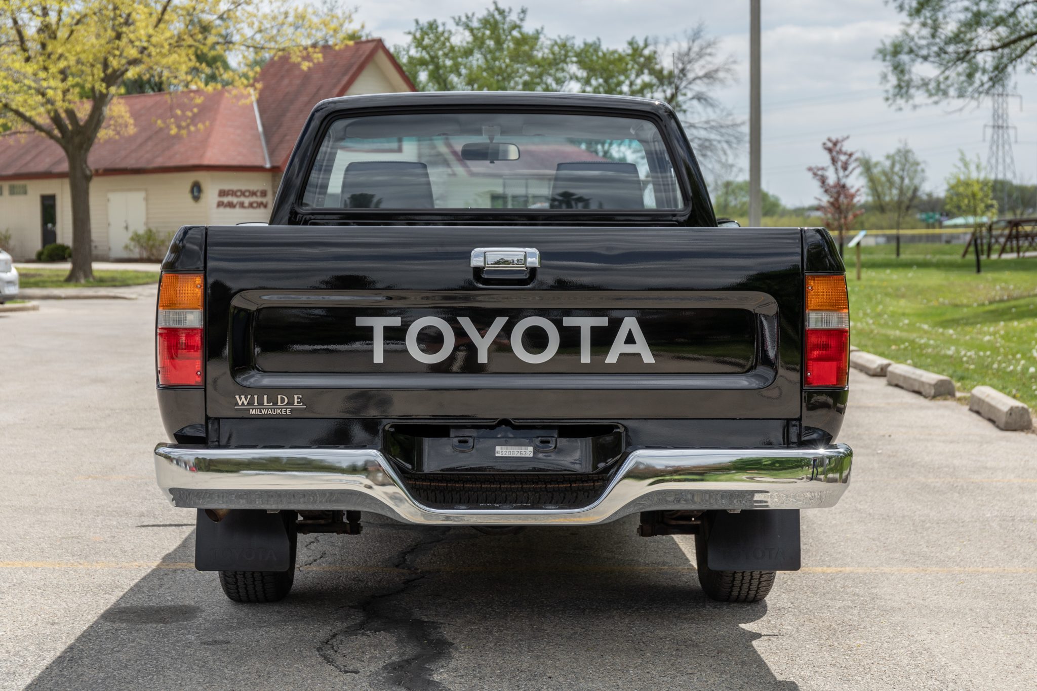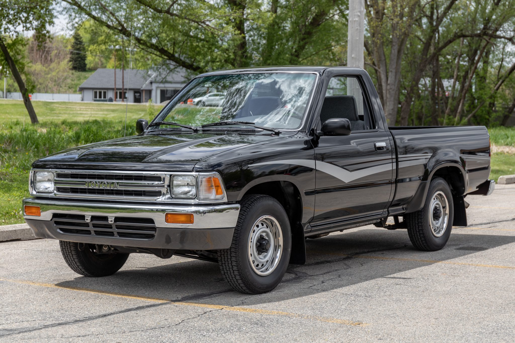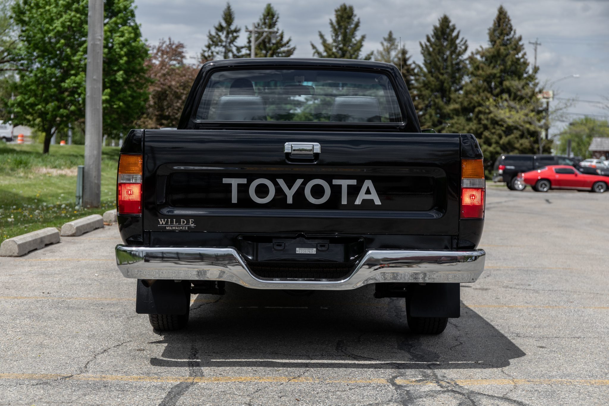 Five-lug 14″ steel wheels wear black Toyota center caps and are mounted with 195/75 Bridgestone SF-402 Steel tires.