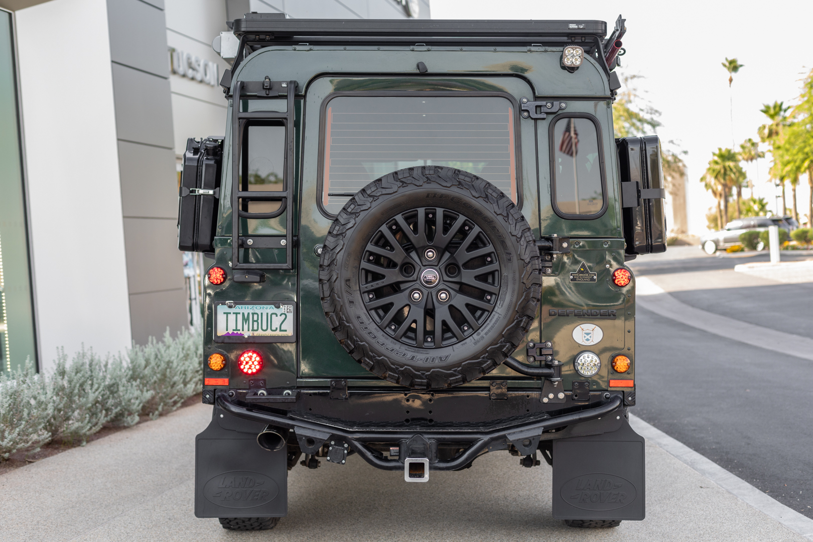 The black-finished 18” Kahn wheels are wrapped in BFGoodrich All-Terrain T/A K02 tires sized 265/65 at all four corners. The truck features a matching spare on a swing-away carrier, four-wheel disc brakes, and Radflo shock absorbers. The seller notes the power steering pump was replaced in June 2020.