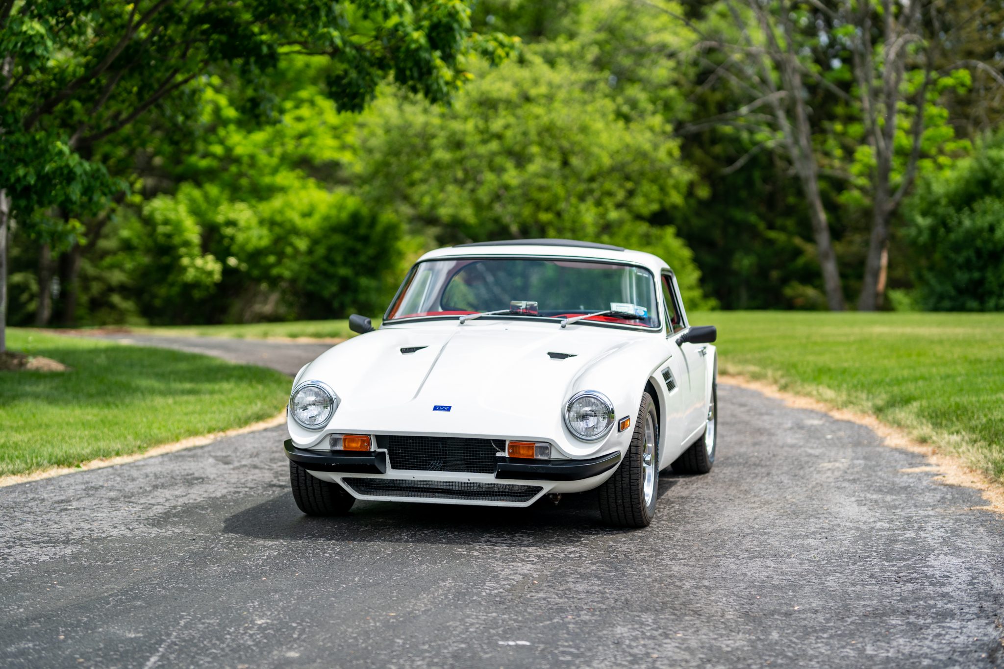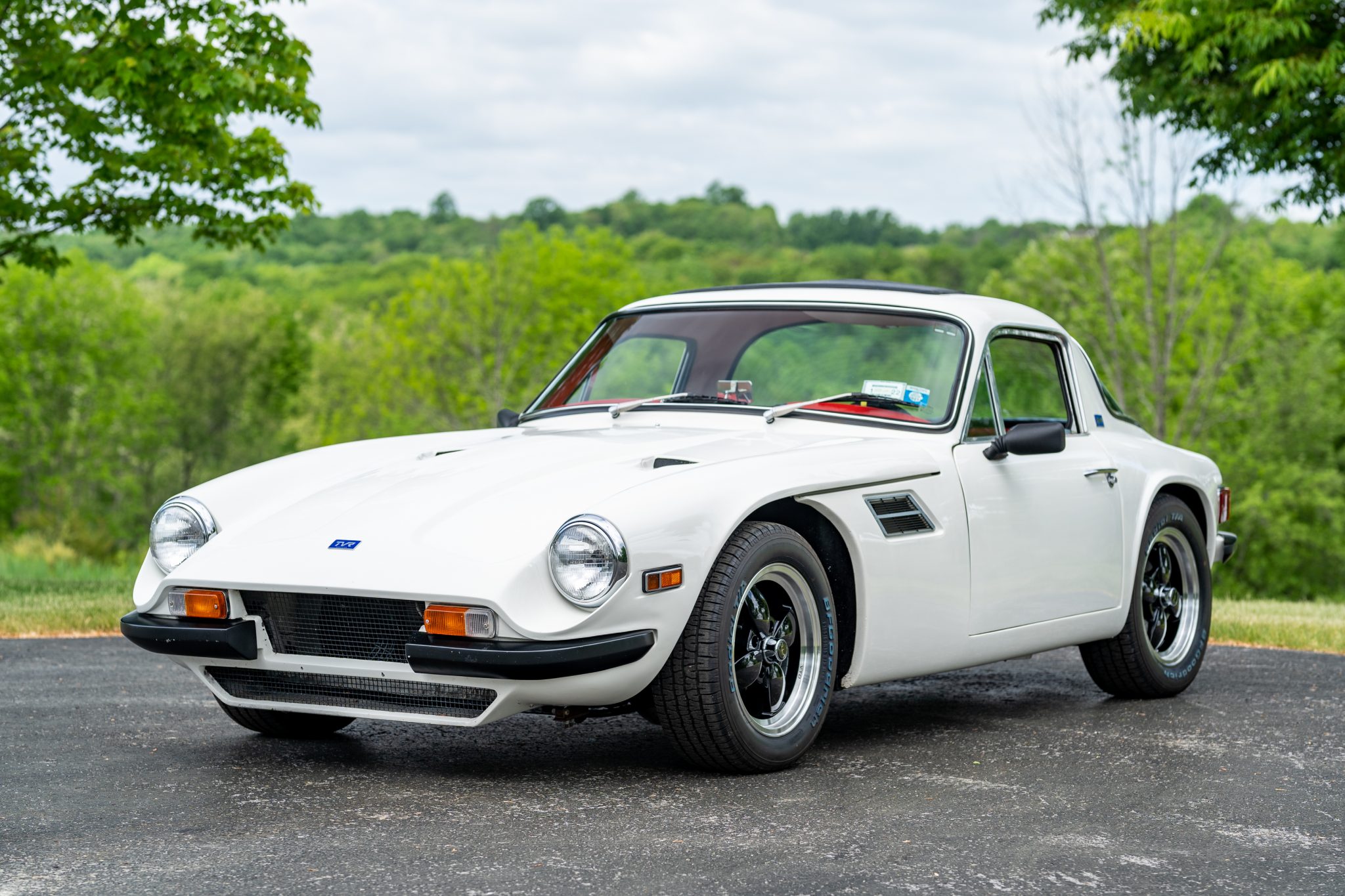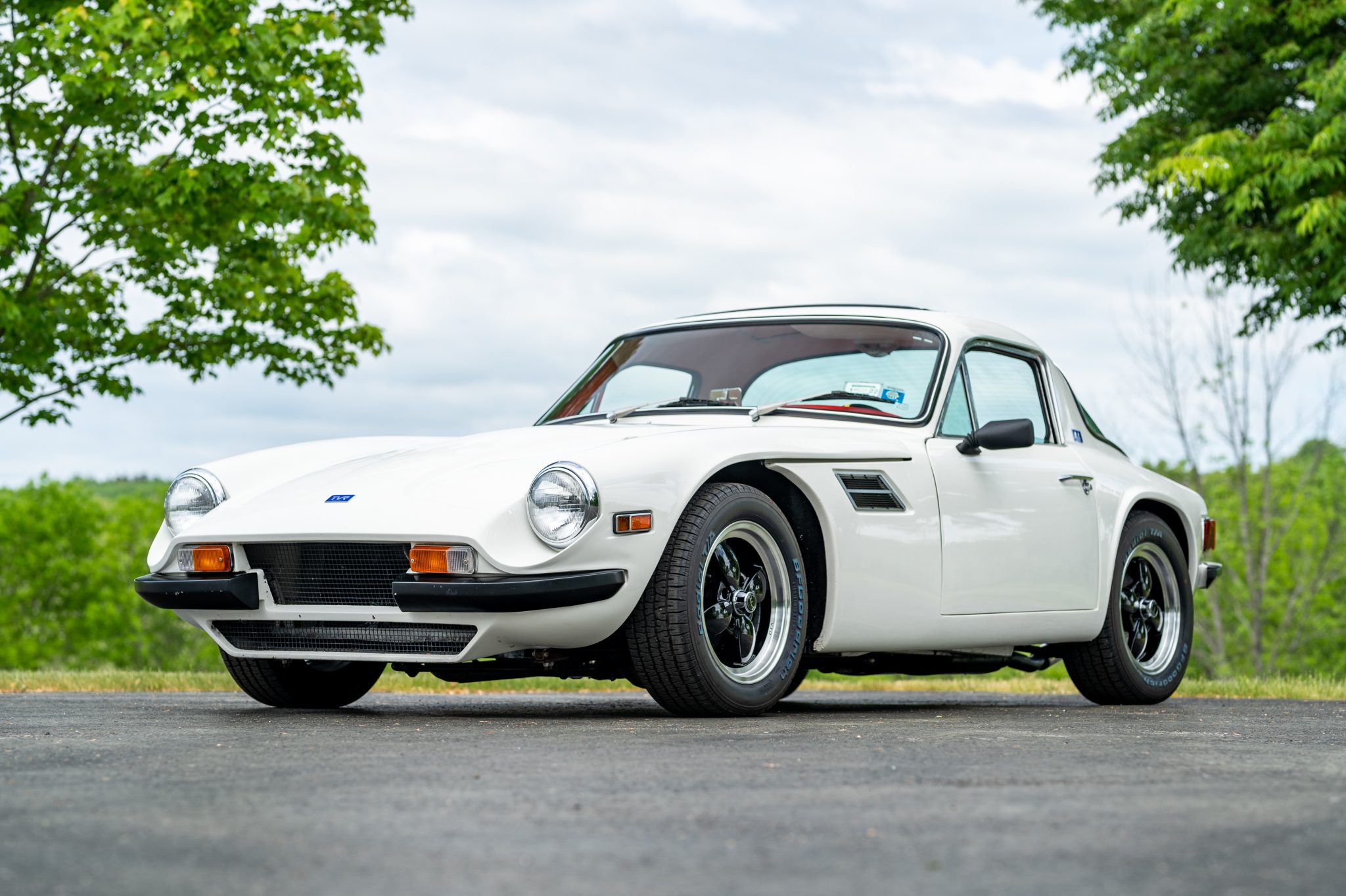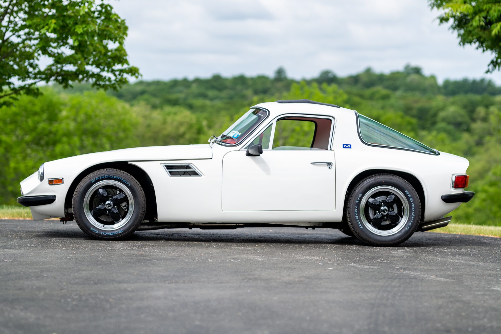 15″ VTO Retro wheels installed in 2019 are mounted with 195/60 front and 205/60 rear BFGoodrich T/A tires that show 2018 date codes. The modified braking system utilizes Toyota 4Runner calipers in front and Datsun 280Z drums at the rear; the system has been overhauled since October 2020 with installation of a Wilwood master cylinder as well as replacement of the booster, the front calipers, and the front lines. Other equipment includes a Triumph TR6 differential and Spax shock absorbers.
