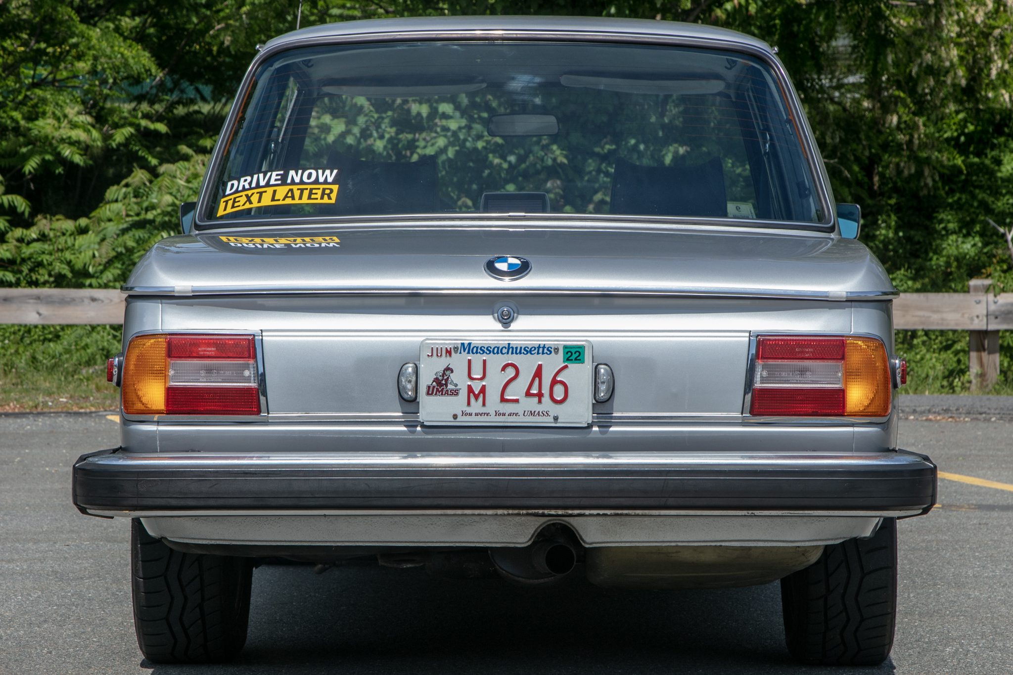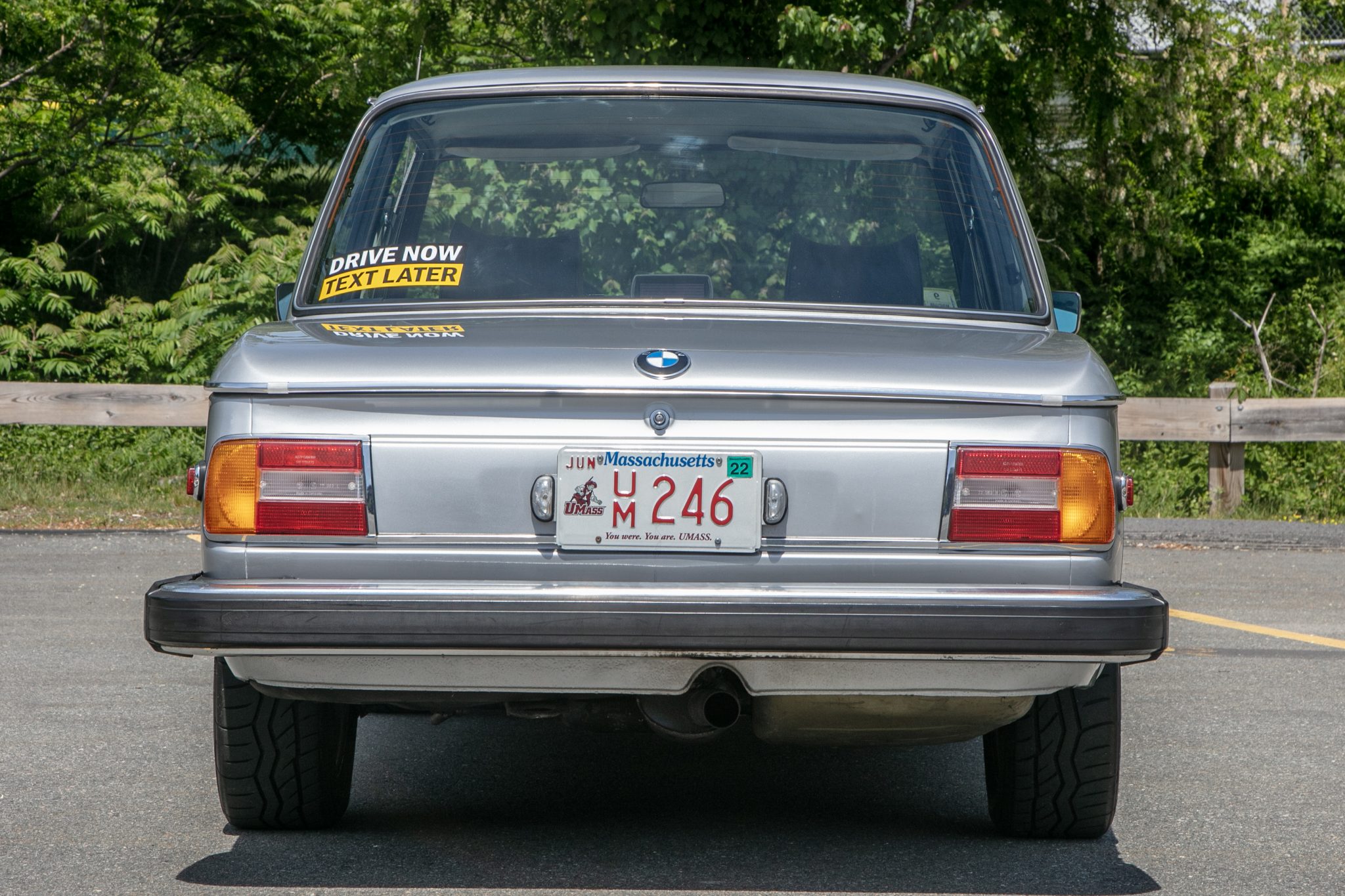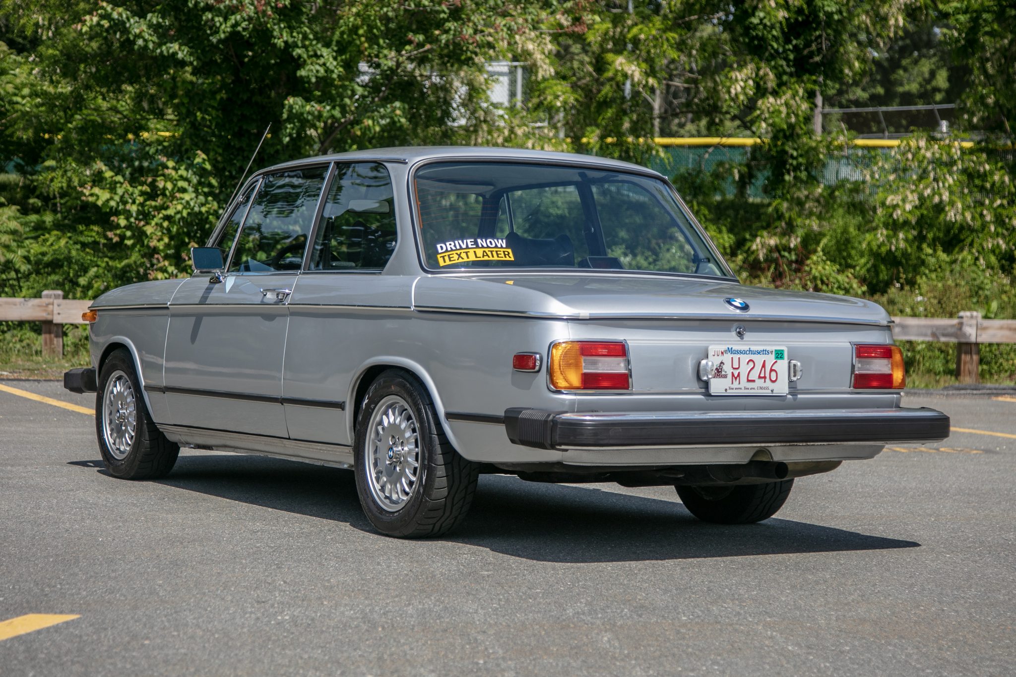 Silver 14″ bottle cap alloy wheels are mounted with 195/60 Falken Azenis RT615K tires. Suspension modifications include a rear shock tower brace, 2002tii front strut housings and hubs, Suspension Techniques lowering springs and 22mm sway bars, Bilstein shocks, replacement bushings, and reinforced rear trailing arms. Stopping power is provided by dual-piston calipers reportedly sourced from a contemporary 5-series over 2002tii rotors up front along with 320i-sourced rear drums. Additional work performed under current ownership is said to have included installation of a replacement brake booster and refurbishment of the steering box.