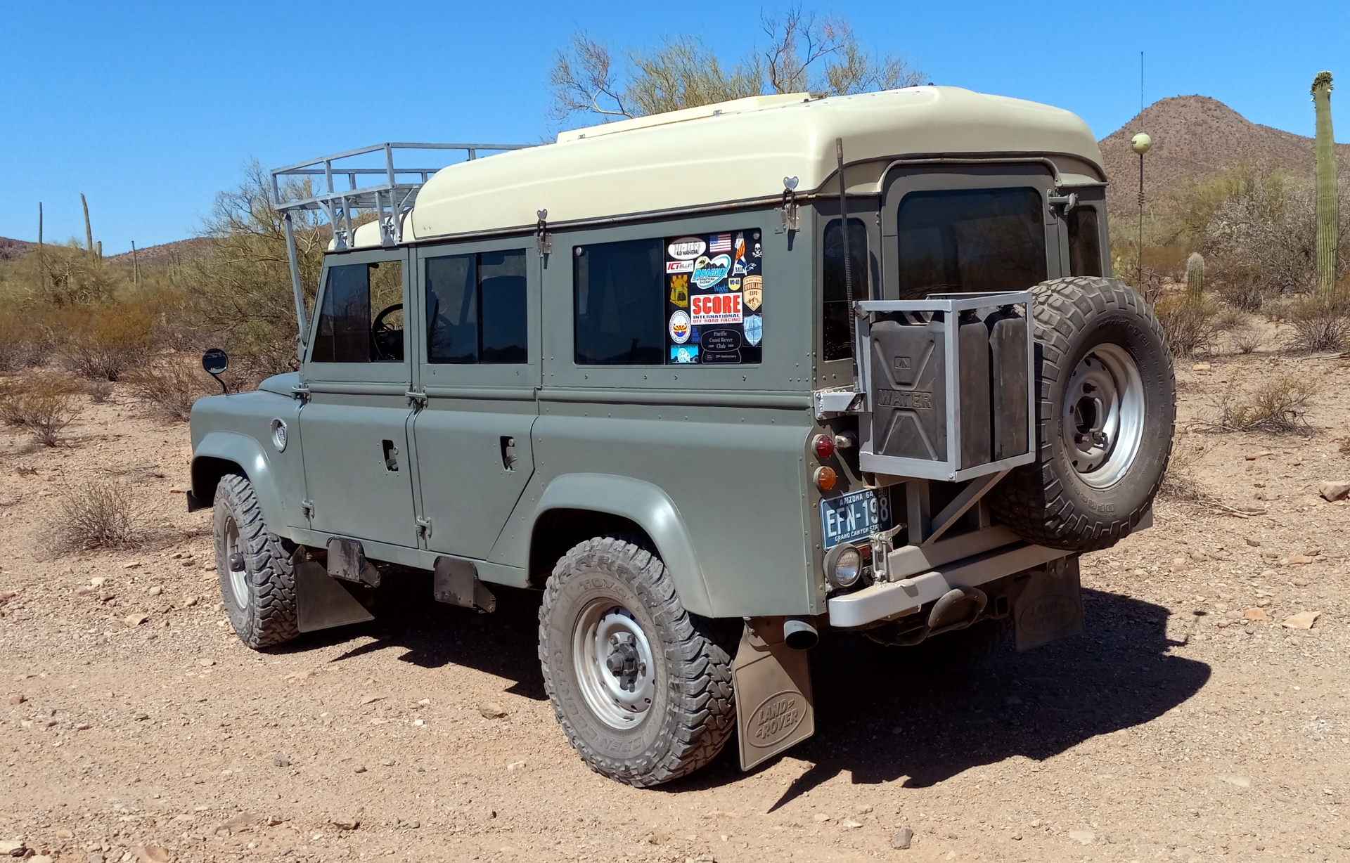 Silver-finished 16″ steel wheels wear 255/85 Toyo Open Country M/T tires, and a matching spare fitted with a BFGoodrich Mud Terrain T/A KM2 tire is mounted to a rear swing-away carrier that also houses a pair of jerry cans. Ventilated Disc brakes sourced from a Range Rover Classic are fitted up front, and Defender-specification disc components are utilized out back. Additional updates include a power steering system consisting of a Range Rover Classic steering gearbox and GM pump.