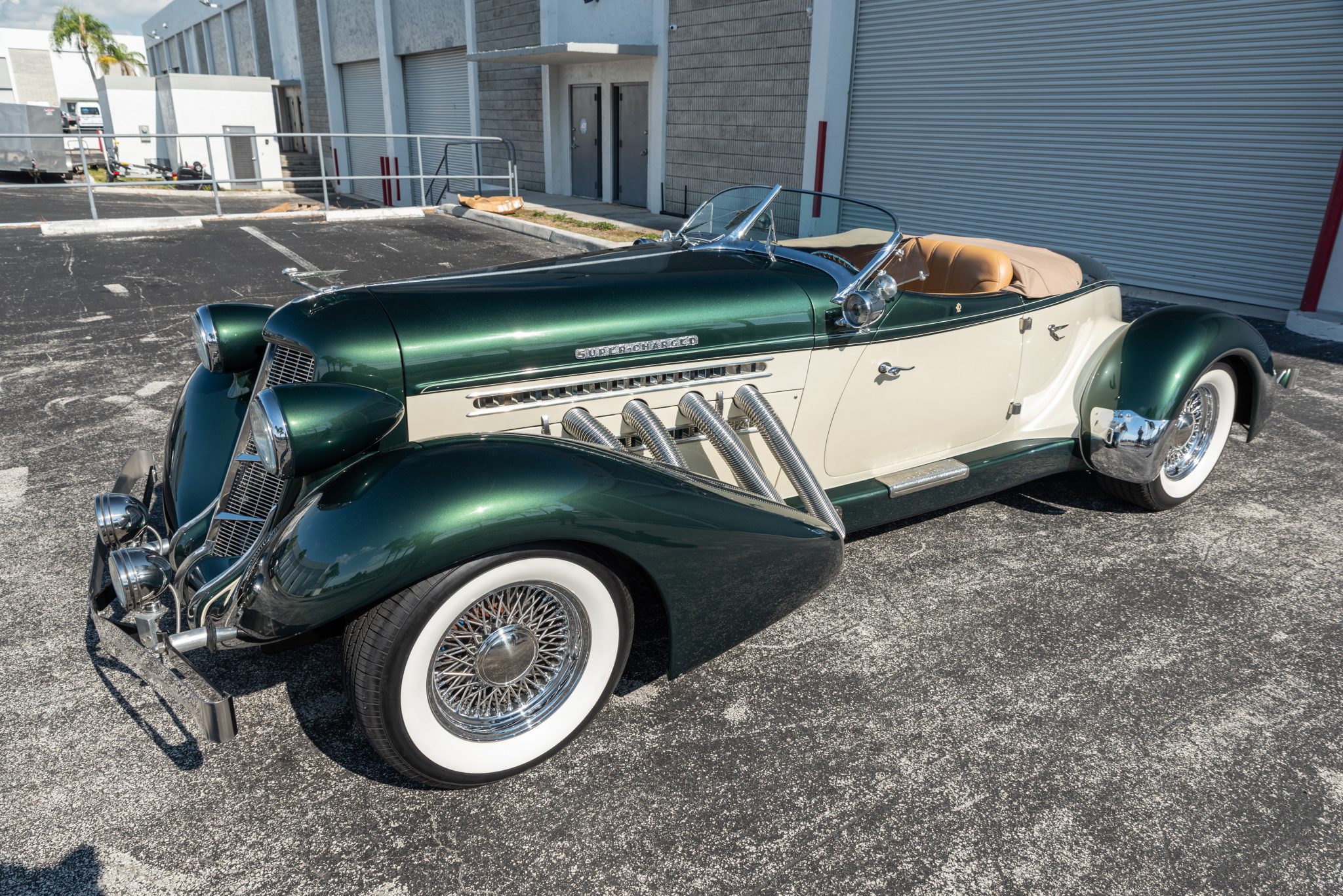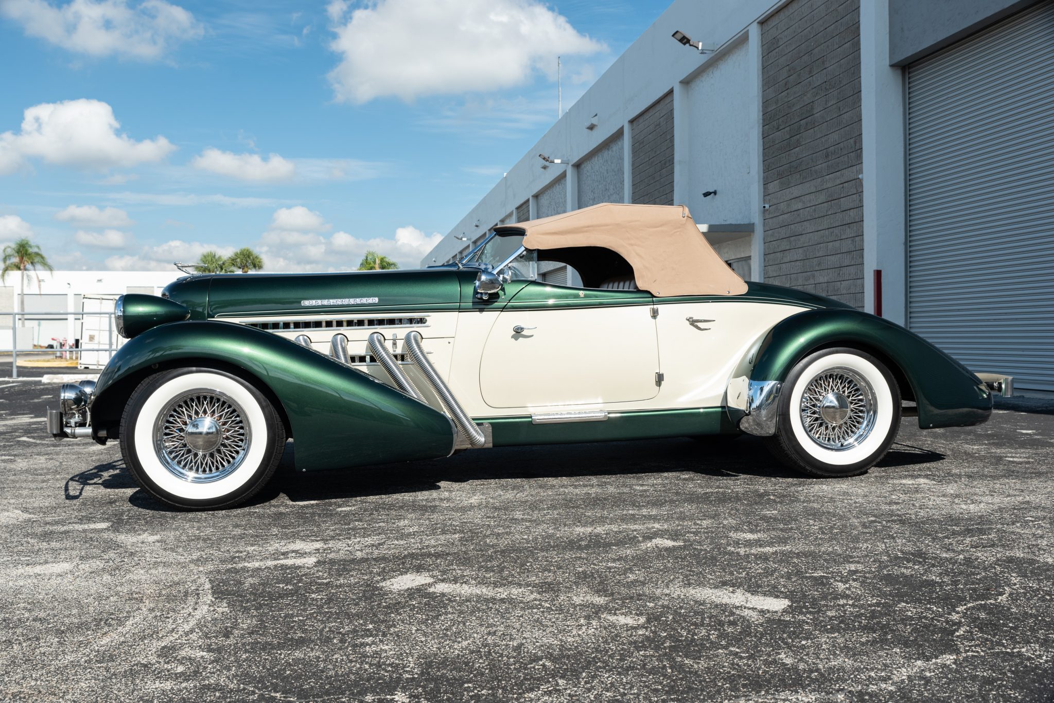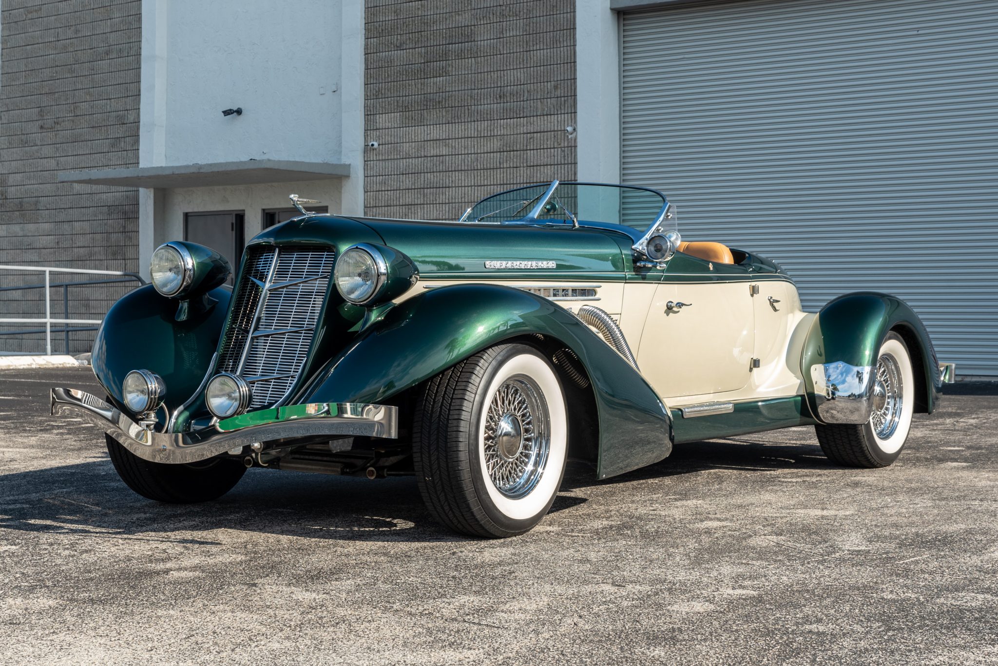 Staggered-width 15″ wire wheels wear whitewall tires measuring 235/70 up front and 275/60 out back. The independent front suspension features adjustable coilovers and tubular control arms, while braking is provided by four-wheel discs fitted with stainless-steel hoses. The car is also equipped with power steering.